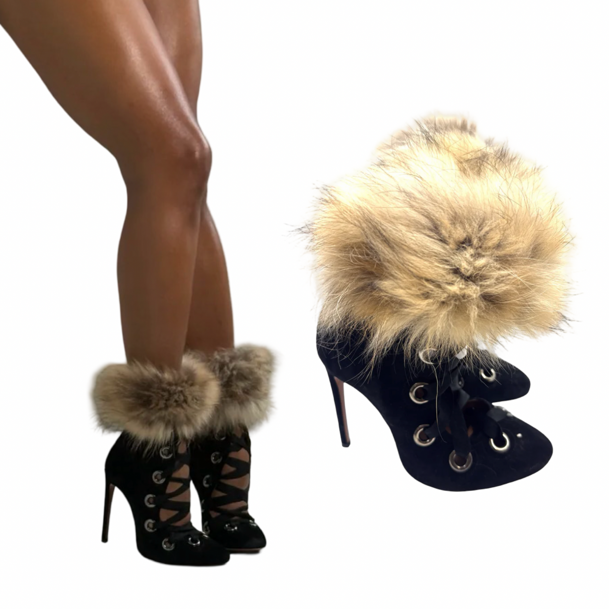 Alaïa black suede round toe laceup bootie in excellent unworn condition with Shoe Slutz fur anklet. 5 inch heel.