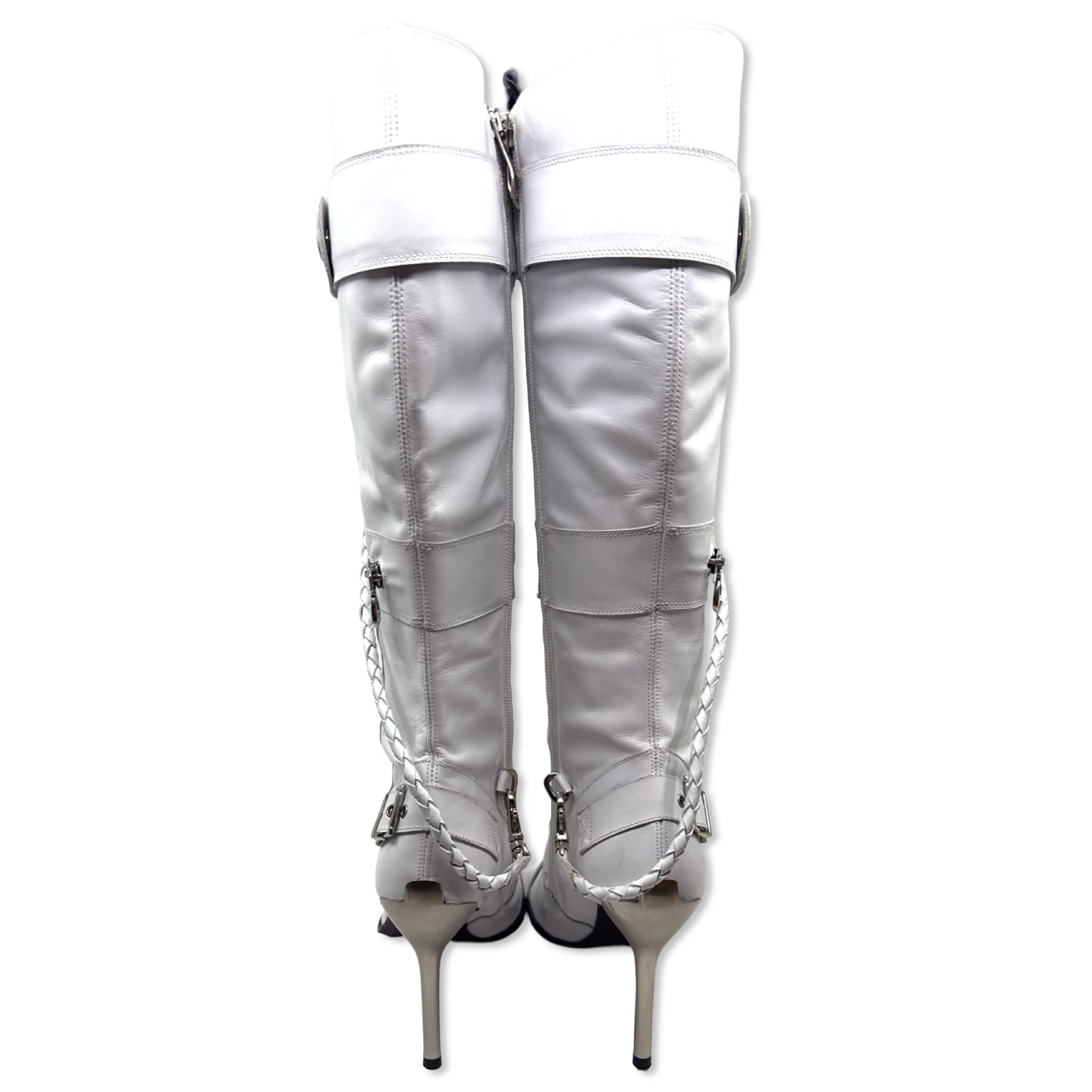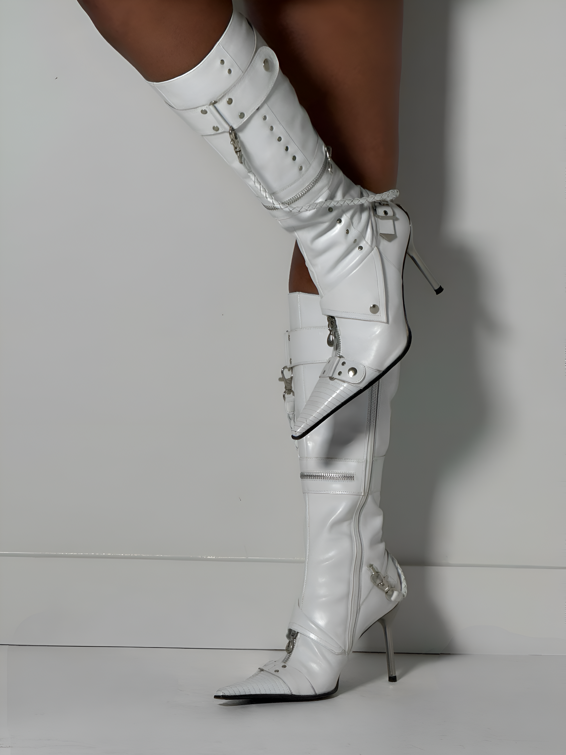 El Dantes white pointed toe moto style boots with zipper details. In great gently used condition. * Minor scratch on toe obvious when on. 4inch heel, 14inch calf.