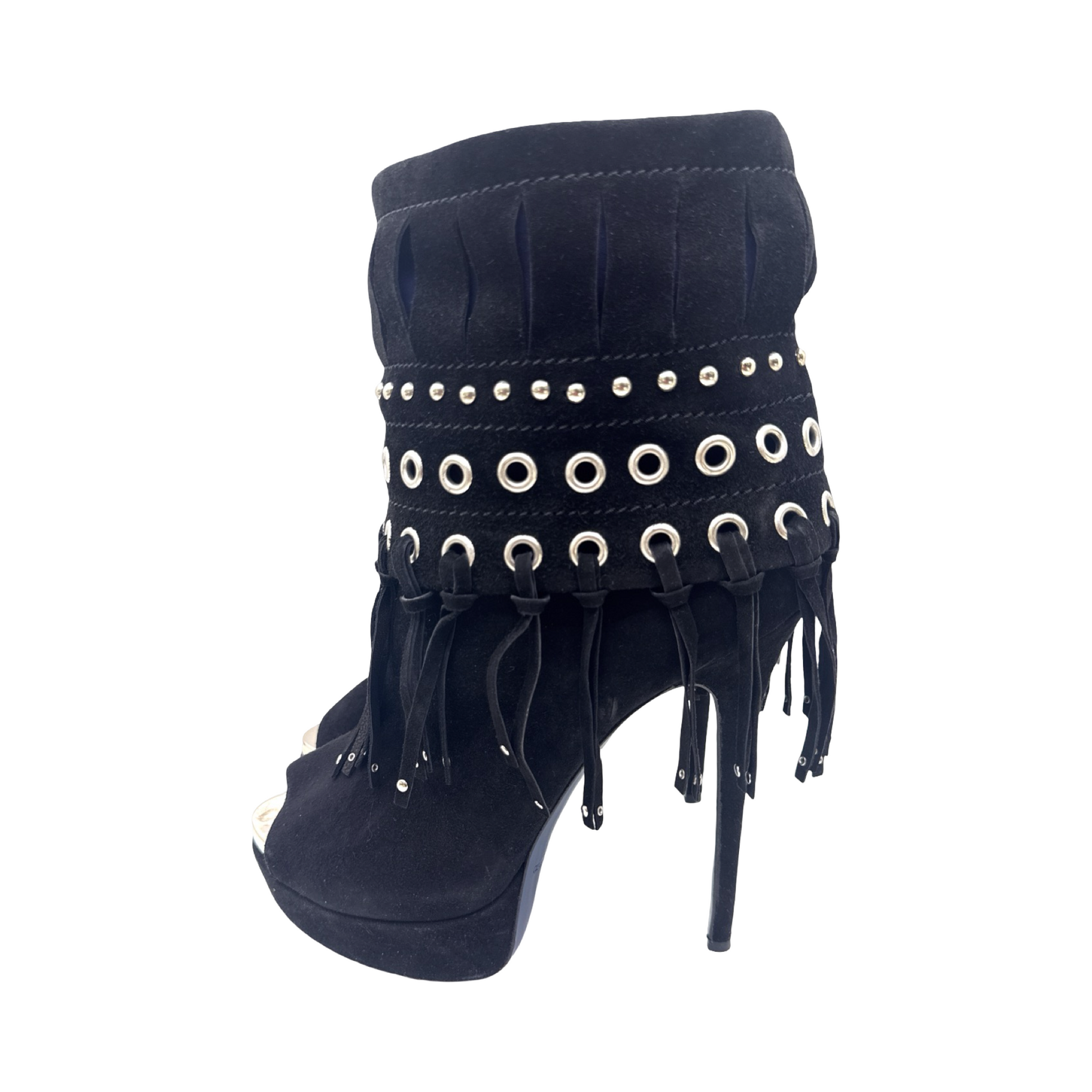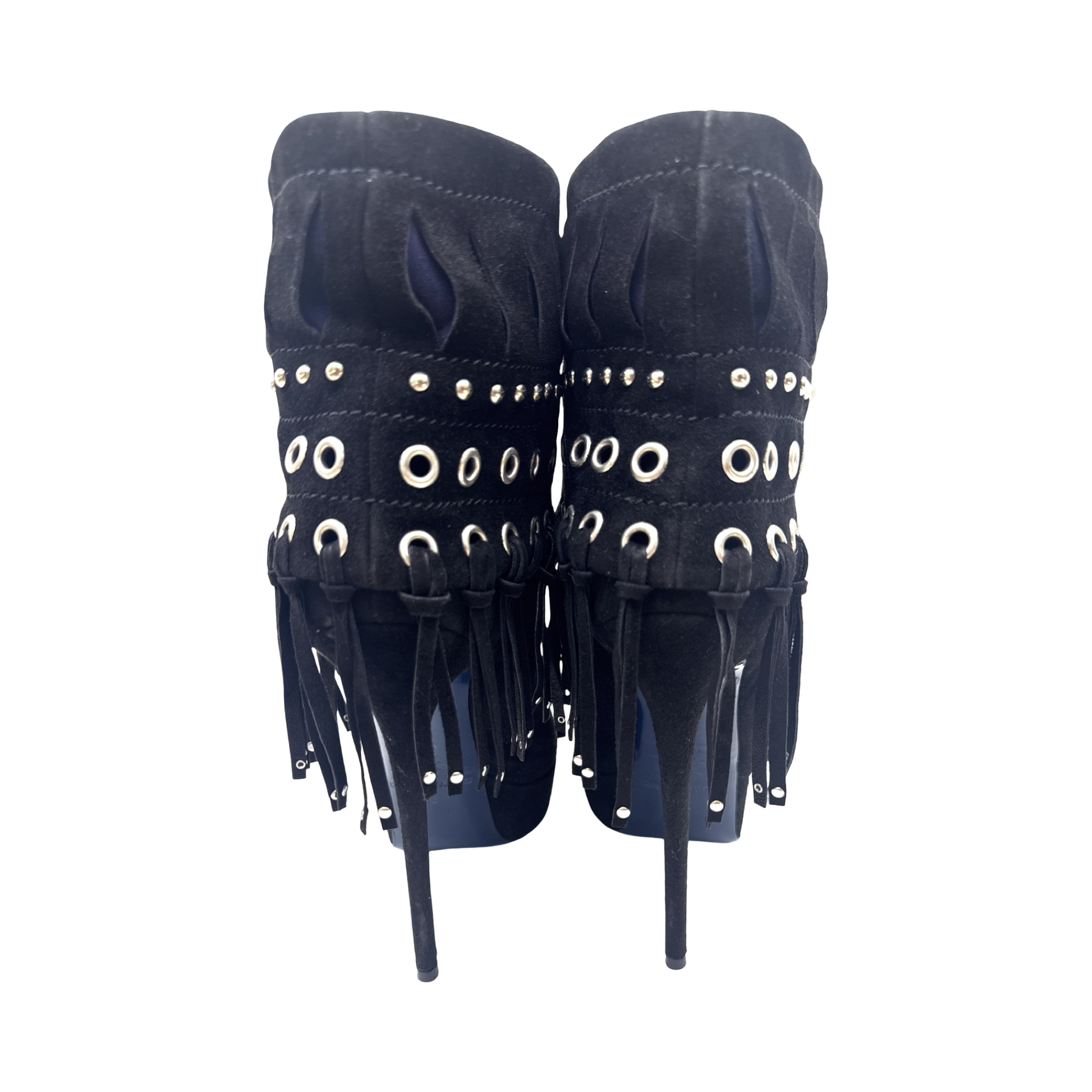 Gianmarco Lorenzi black suede booties with beaded fringe. In excellent gently used condition, 5.5 inch heel.