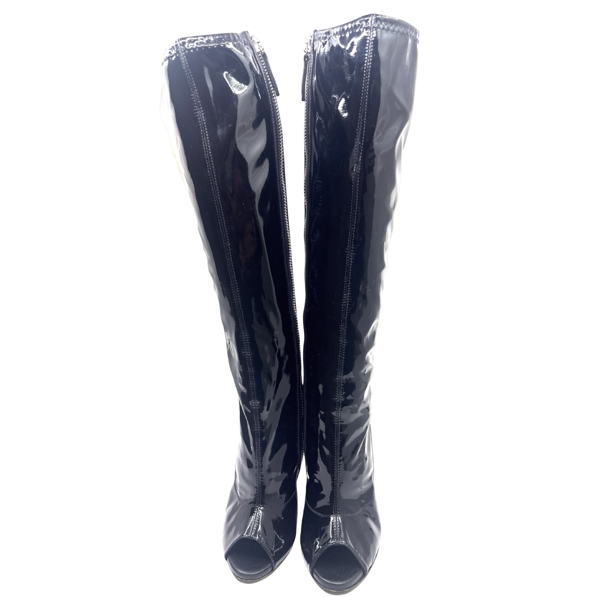 Giuseppe Zanotti black patent leather peep toe boot metal heel. In good gently used condition. 14.5 calf , 4.5inch heel. *Minor peeling along the top ridge of the boot not obvious when on. **** Styled with Shoe Slutz leg chain, sold separately.