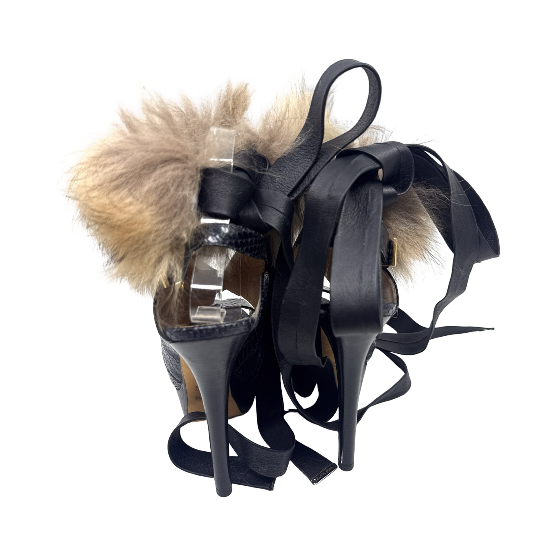 Fendi black snake embossed sandals with removable lamb skin Shoe Slutz fur anklet. In great gently used condition 6 inch heel.