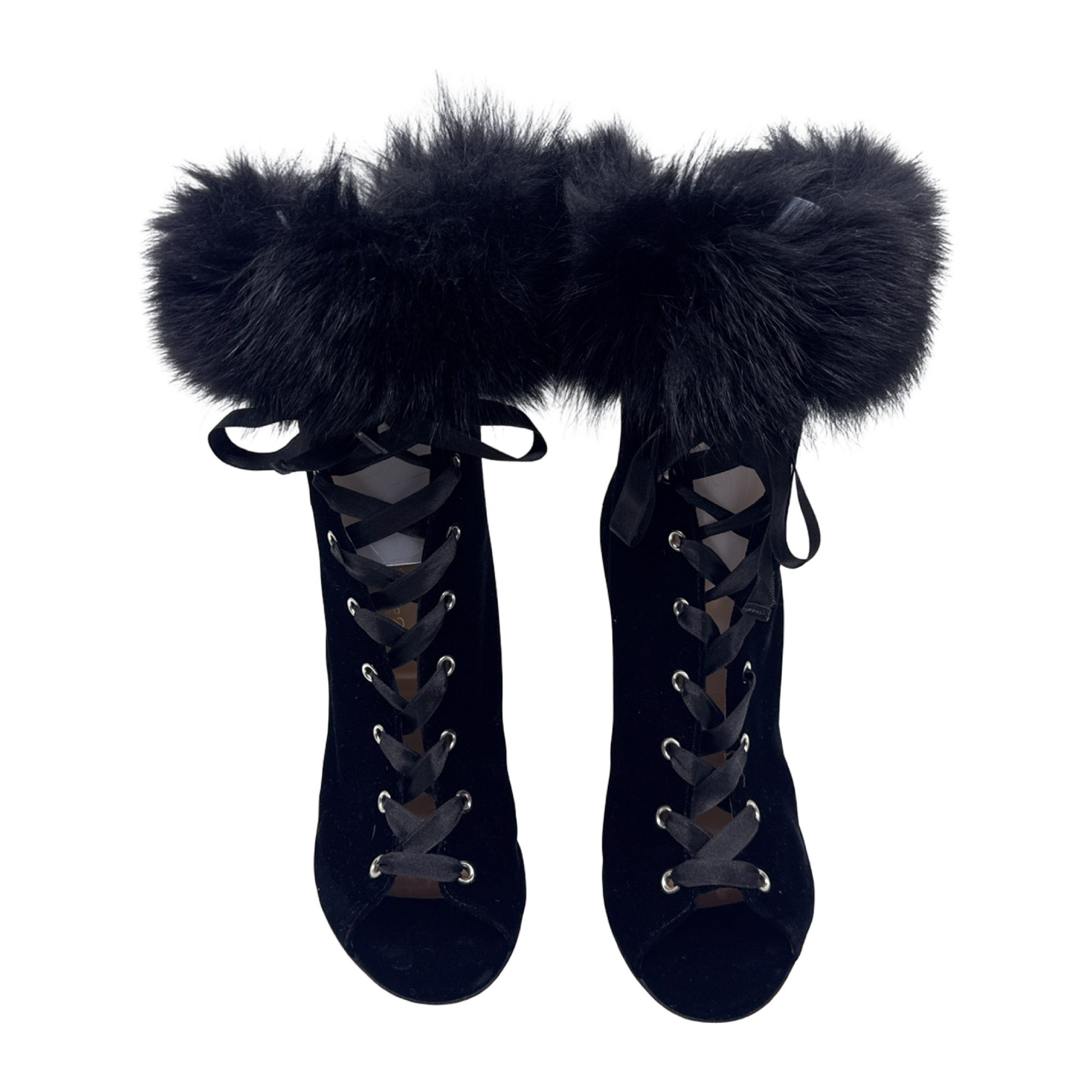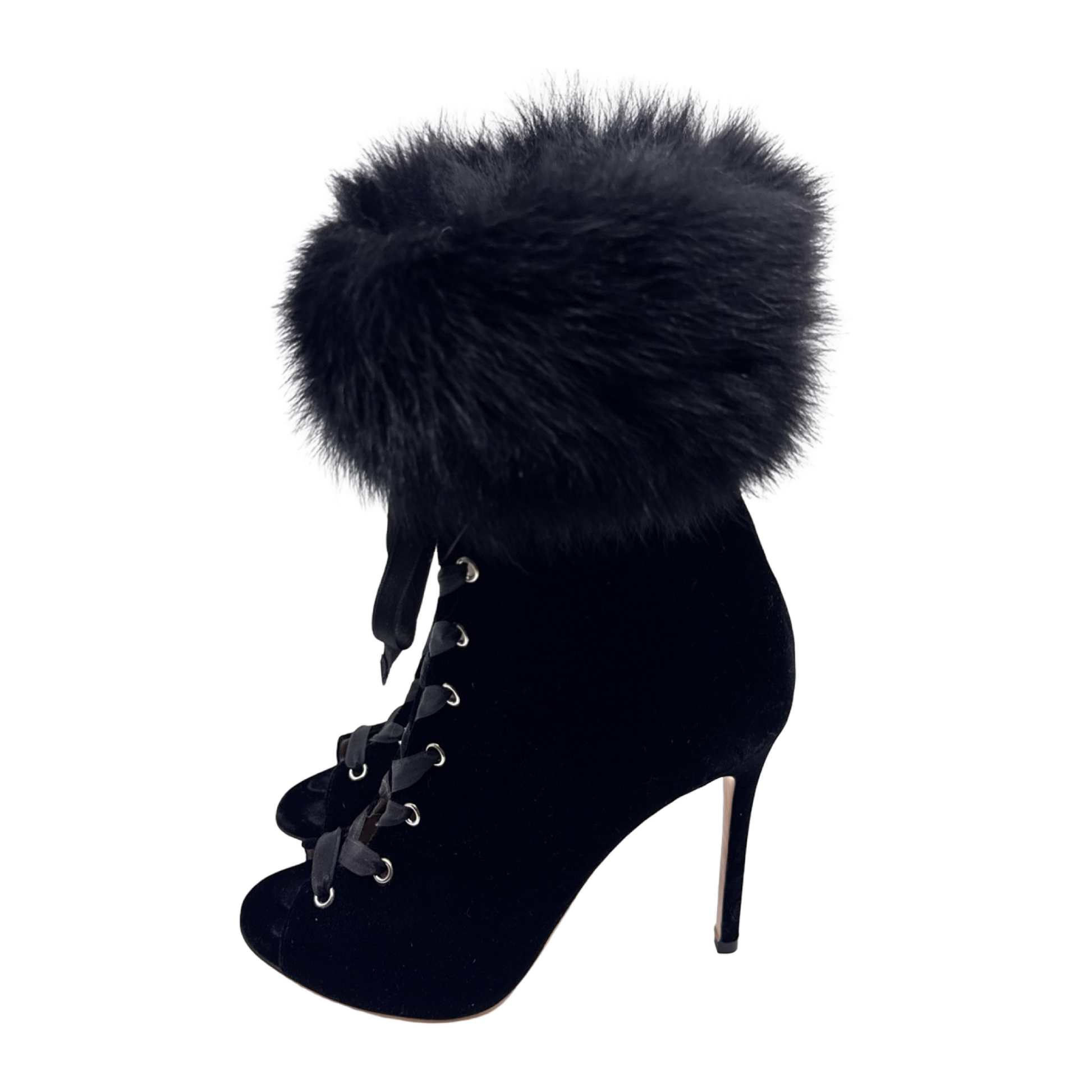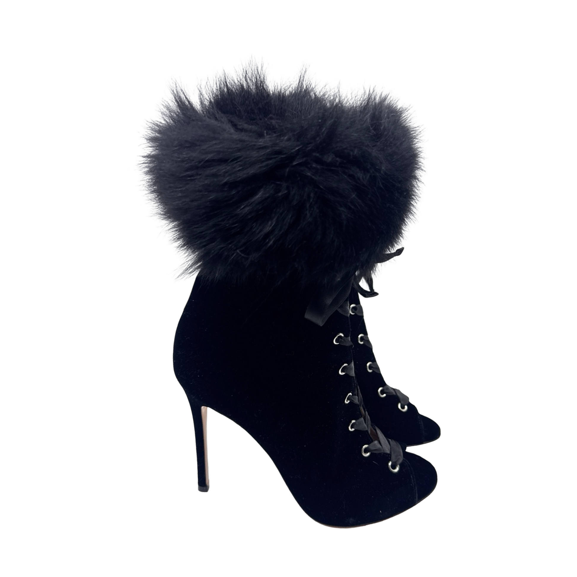 Gianvitto Rossi Black velvet Laceup ankle booties with removable black fur anklet. In excellent condition, 4.5 inches.