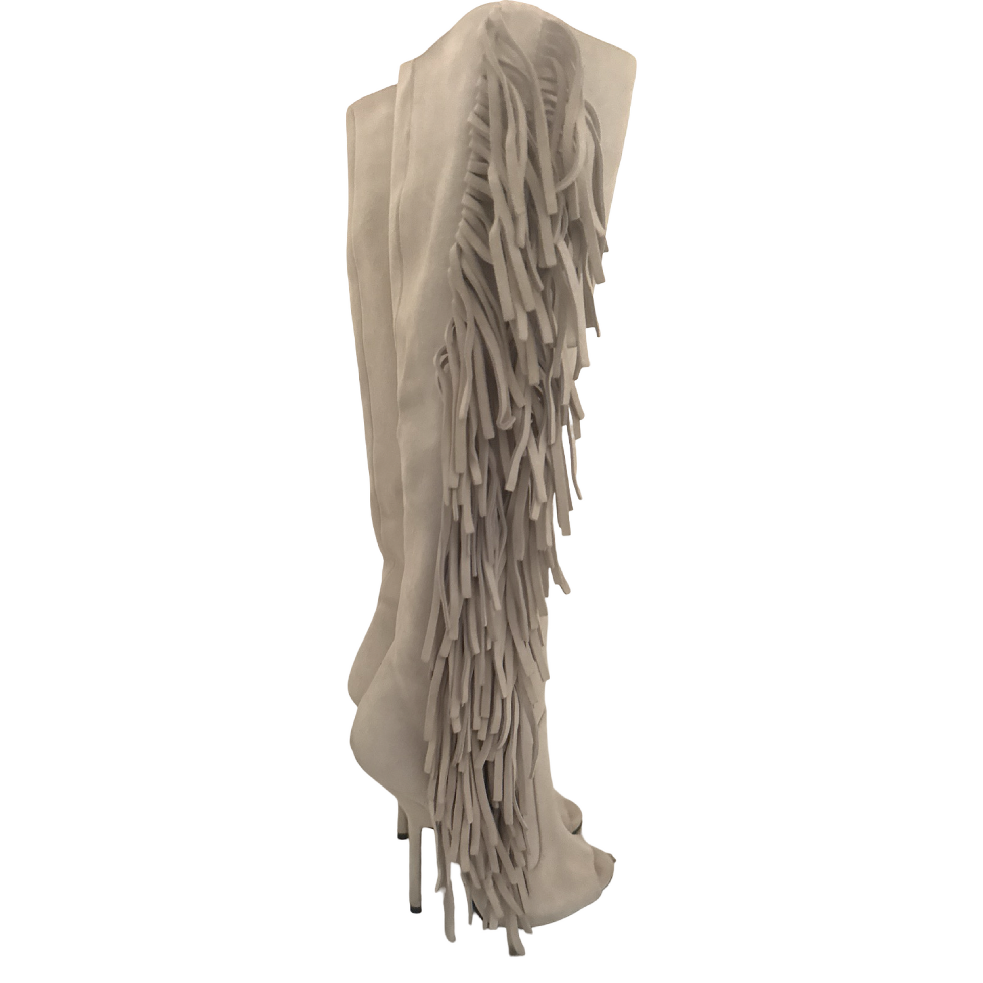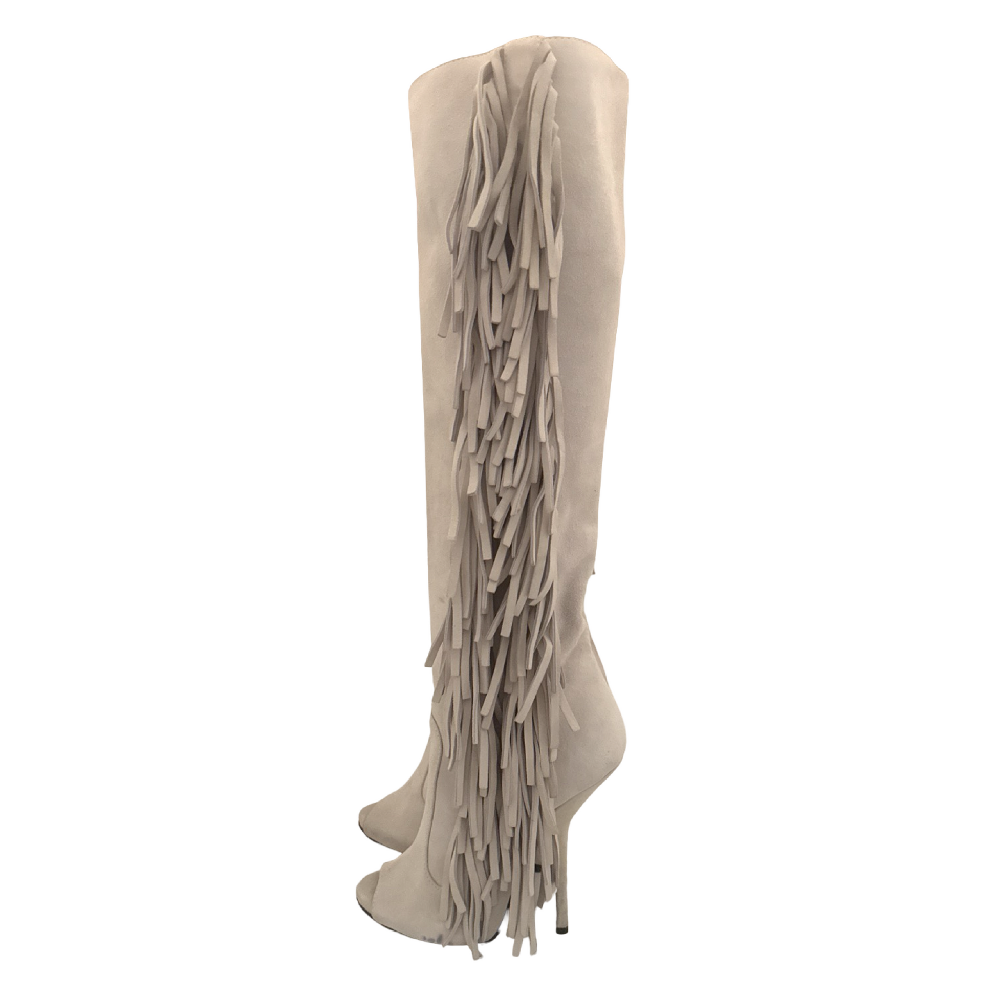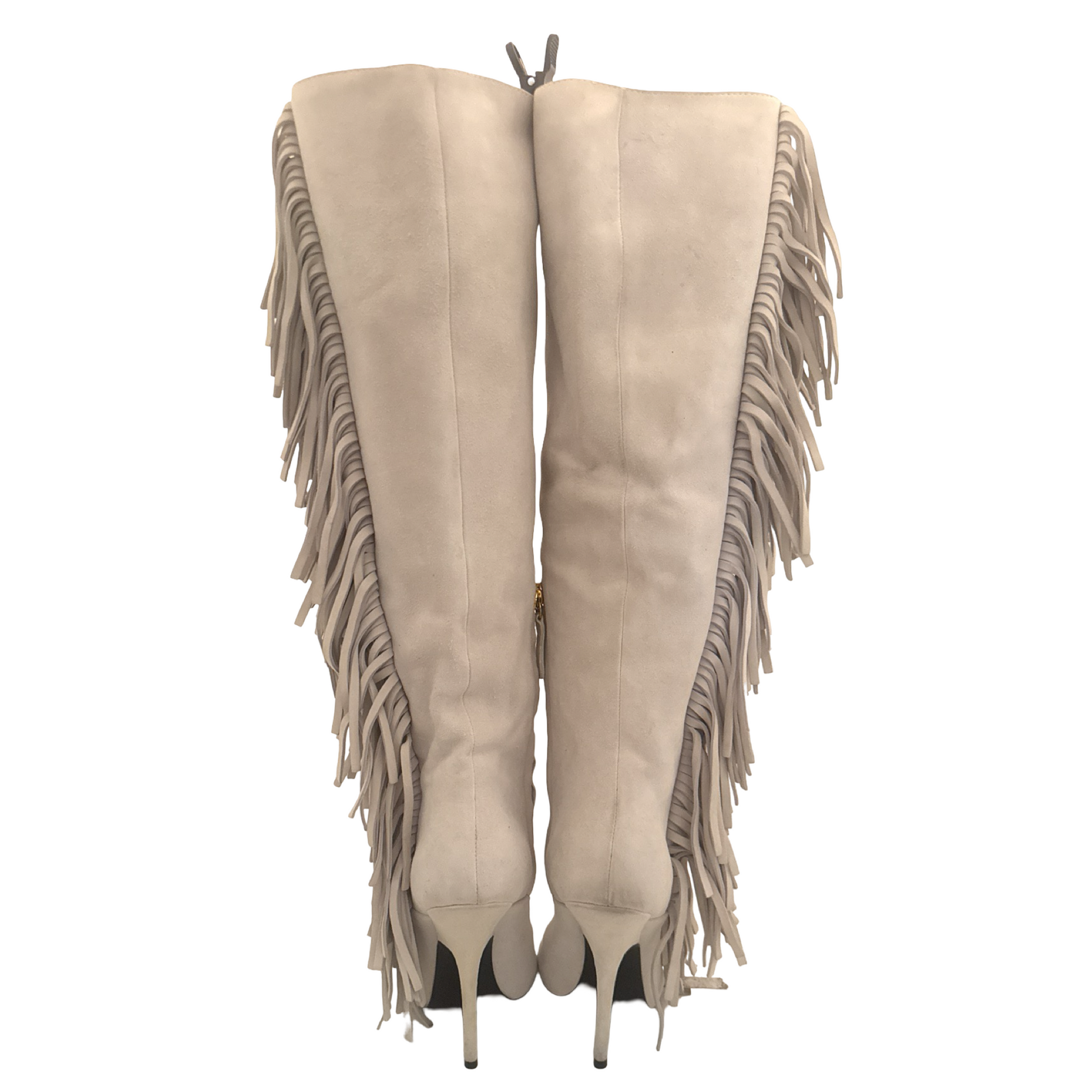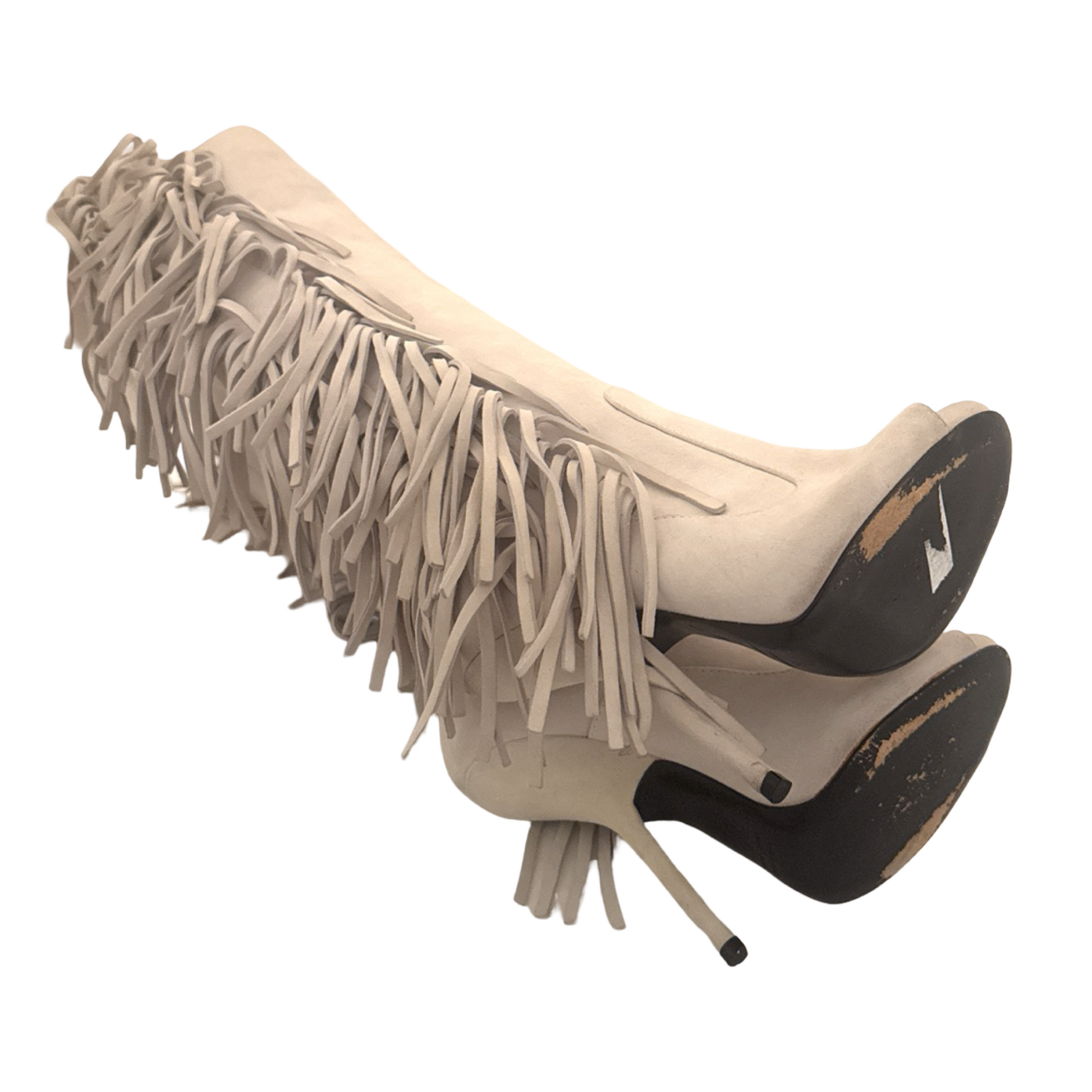 Giuseppe Zanotti bone suede fringe peep toe boots with fringe. In good used condition, minor signs of wear throughout not obvious when on. 5 inch heel, 14inch calf.