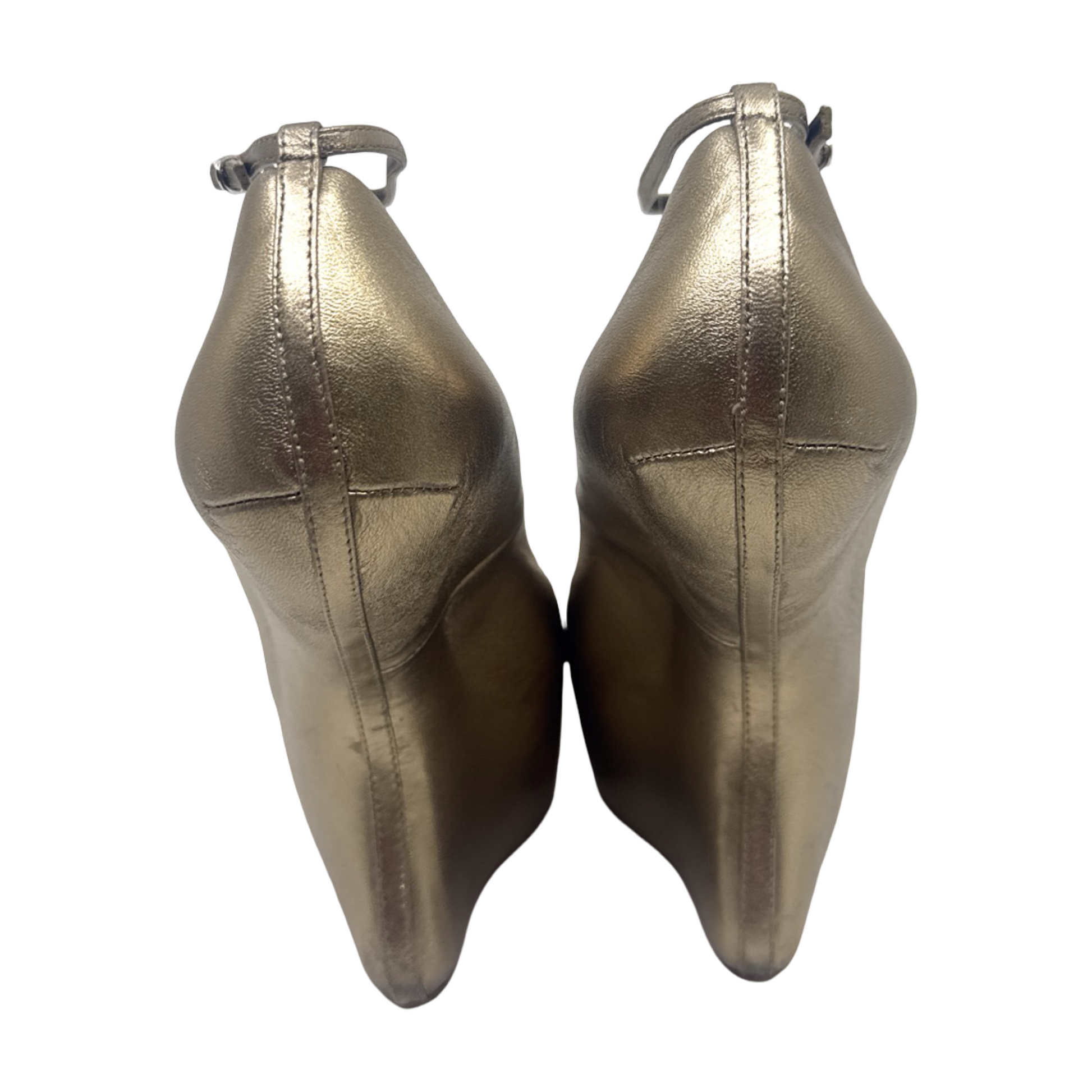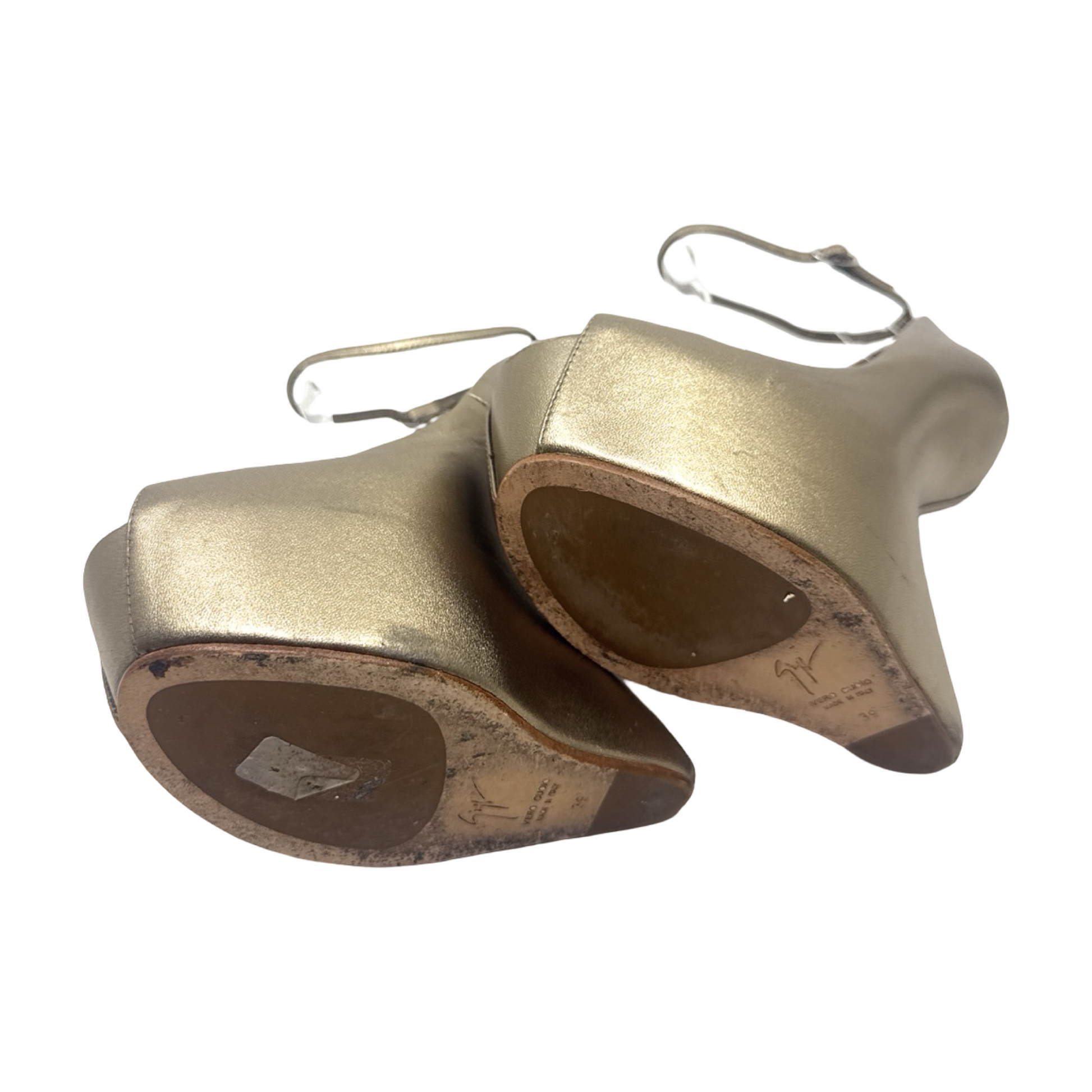 Giuseppe Zanotti leather pewter heelless peep toe wedge. In excellent gently used condition, 6.5 inch wedge. Looks great styled with Shoe Slutz leg chain.