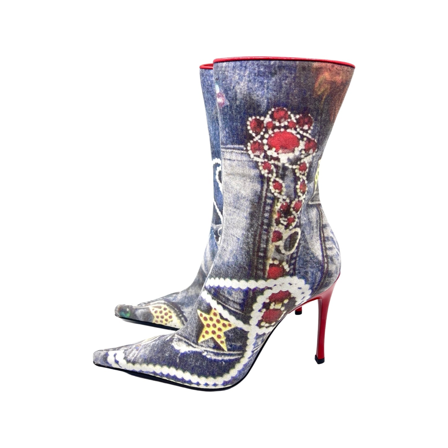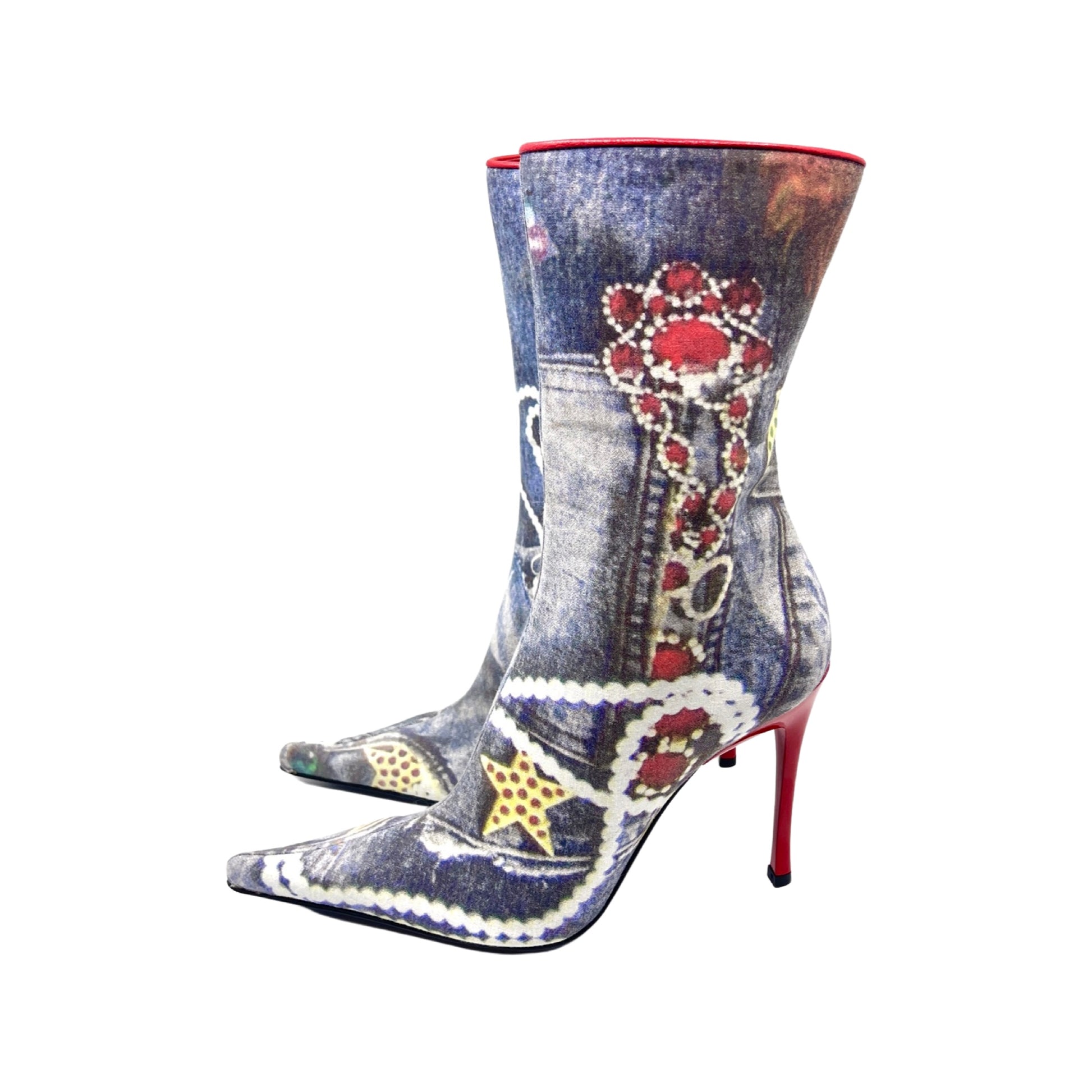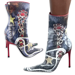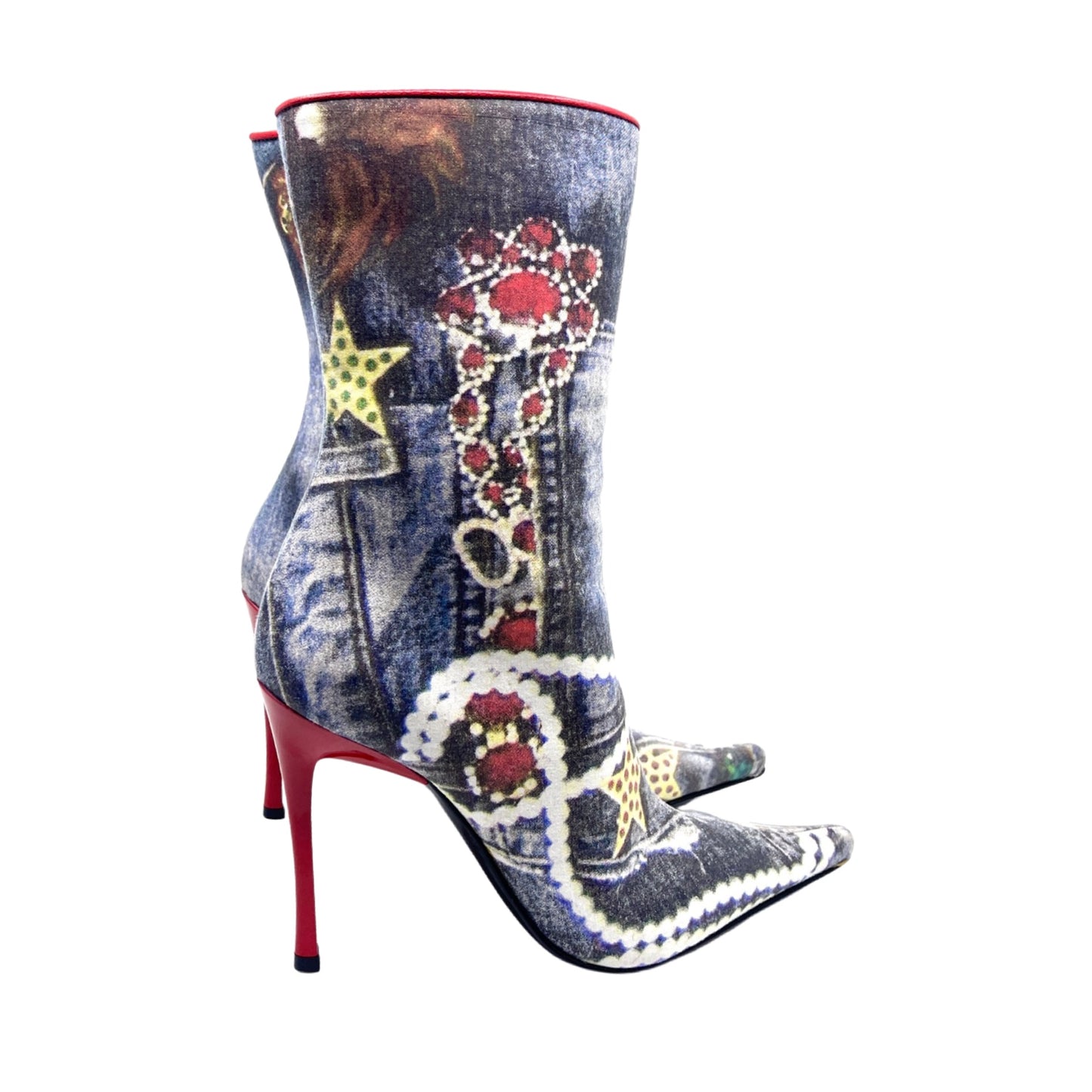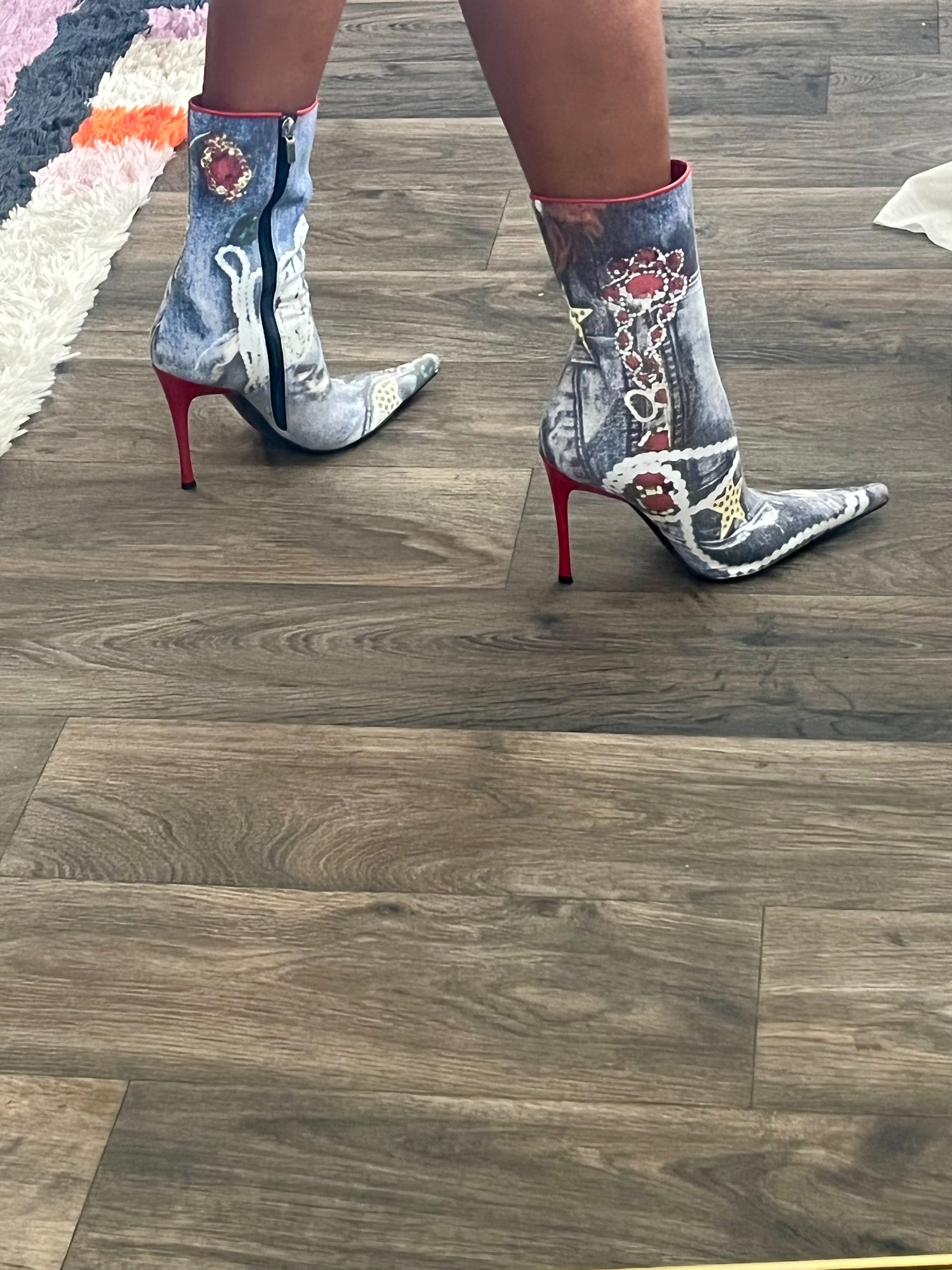 Casadei denim print bootie with jewelry motif and red heel. *Brand New