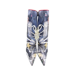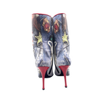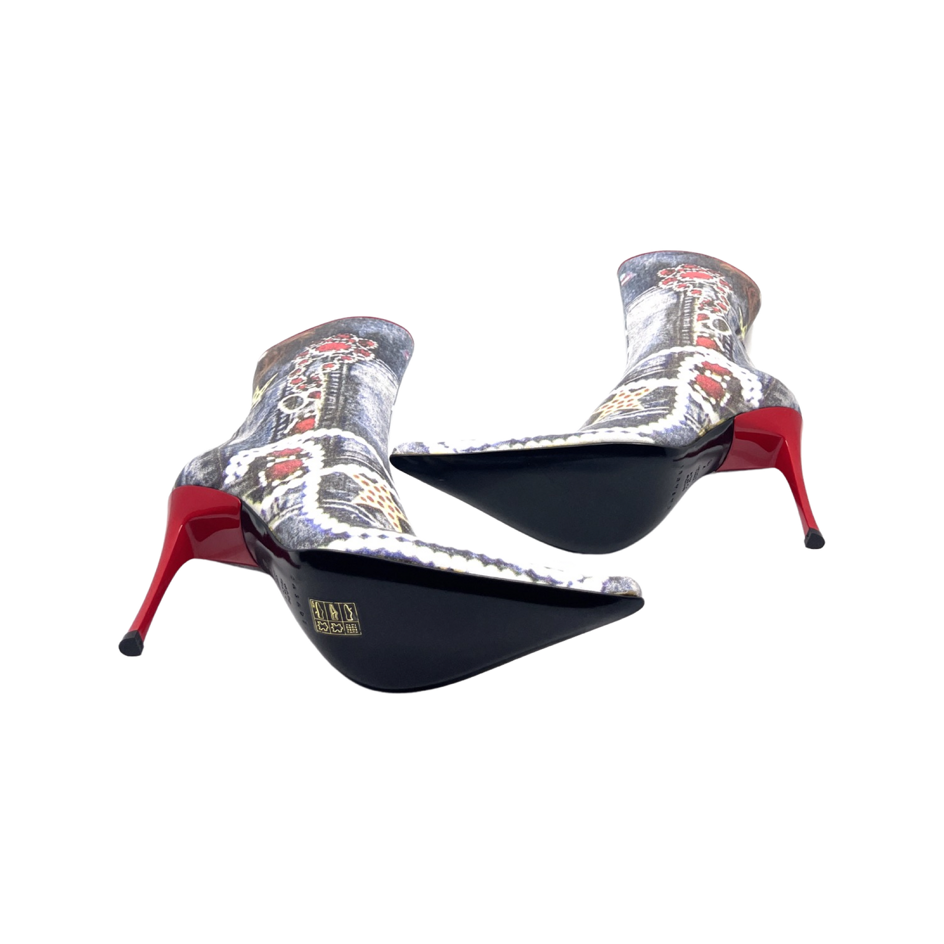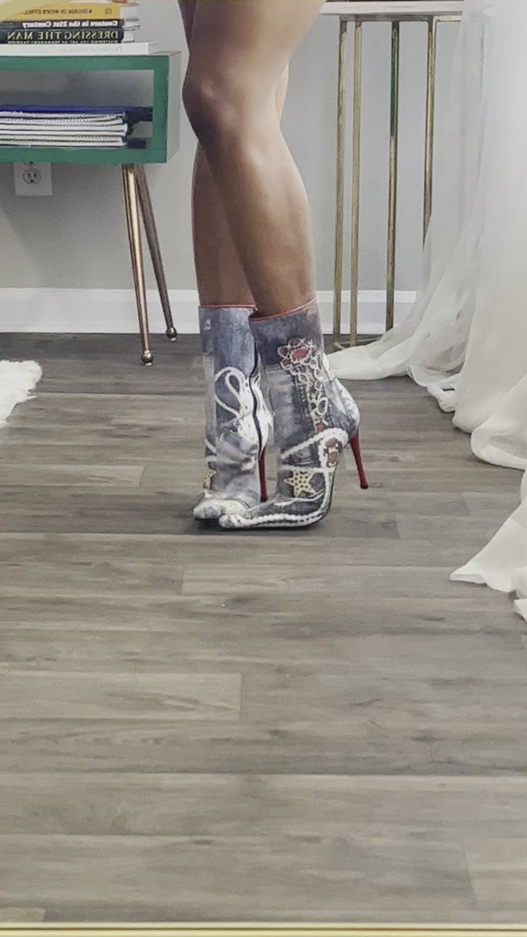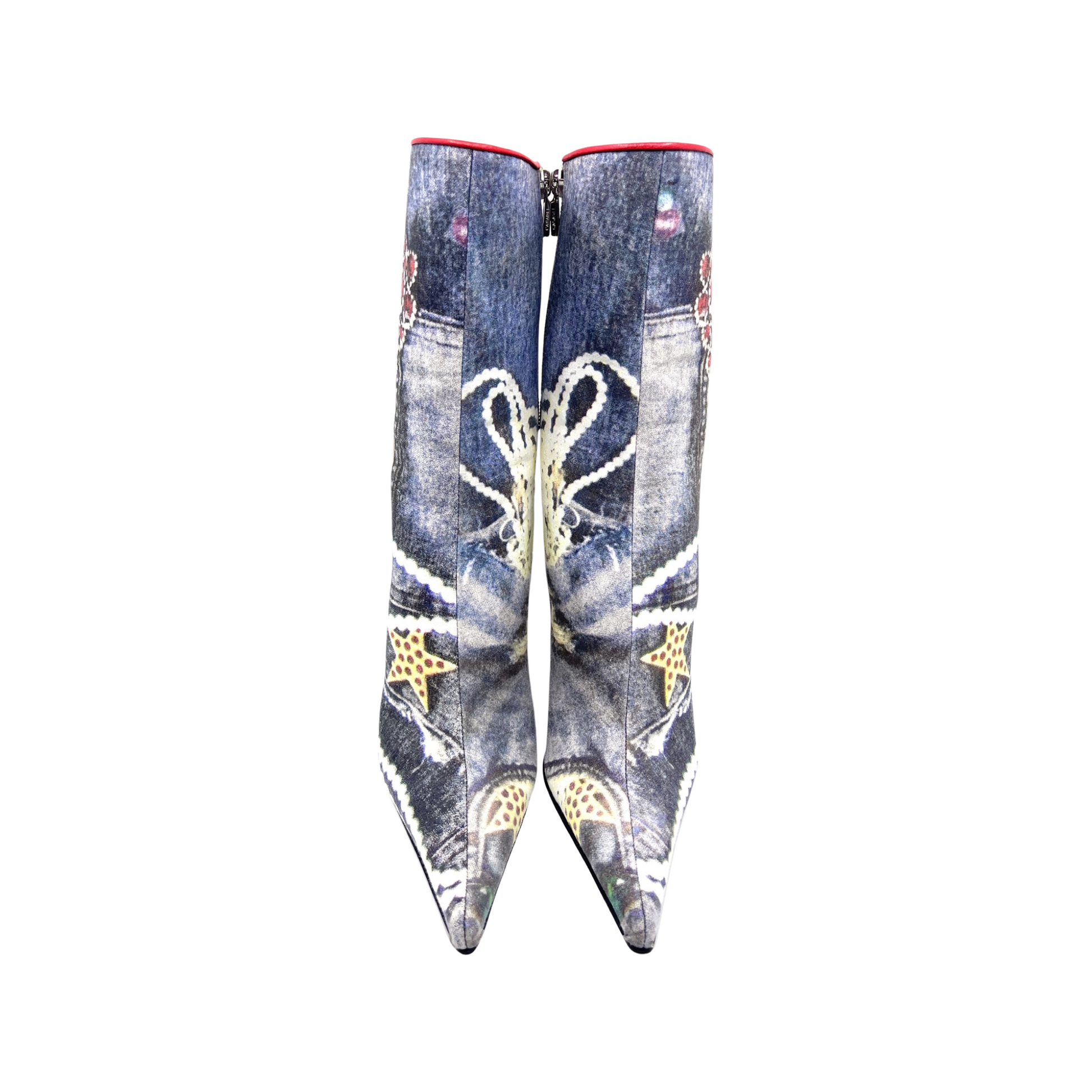 Casadei denim print bootie with jewelry motif and red heel. *Brand New