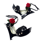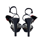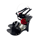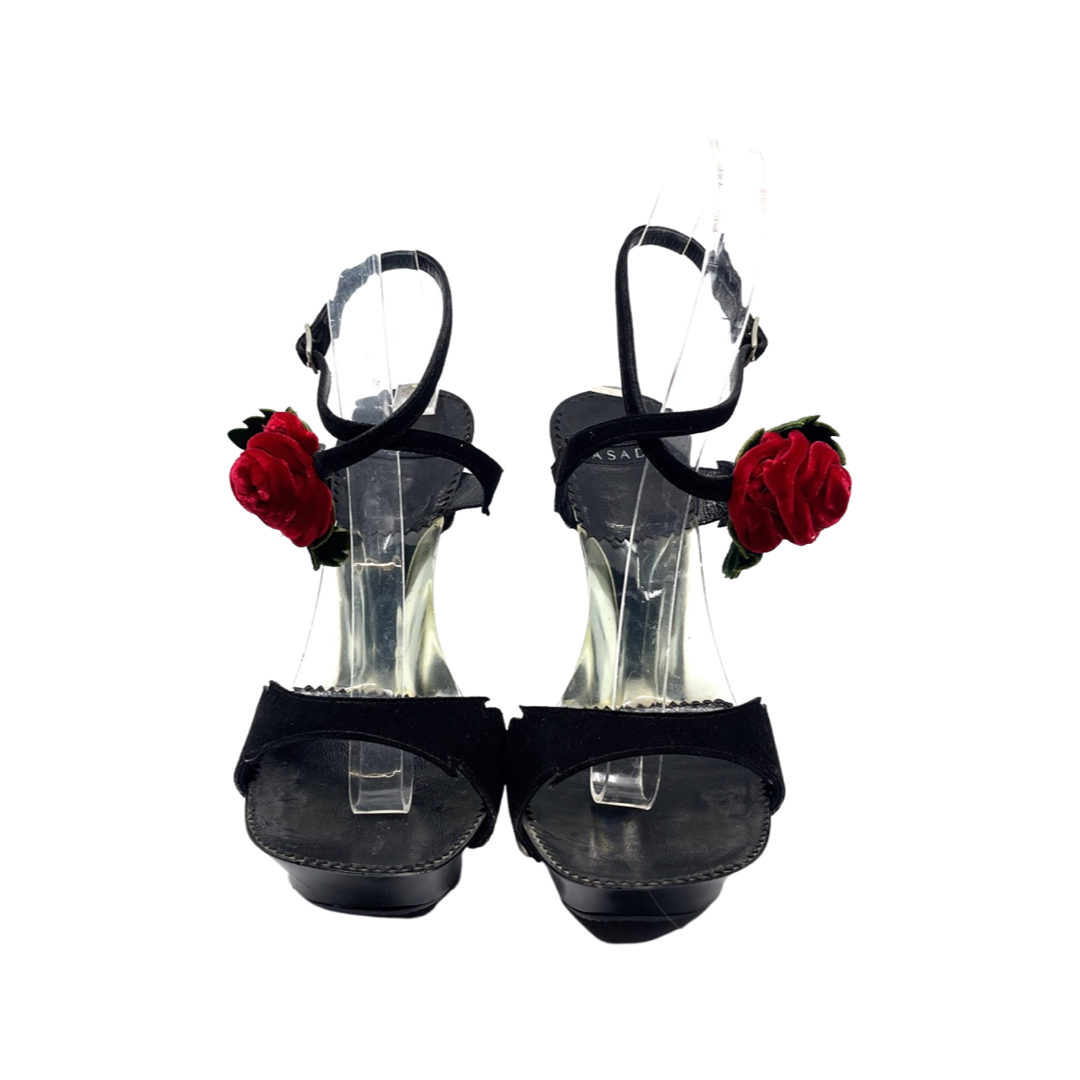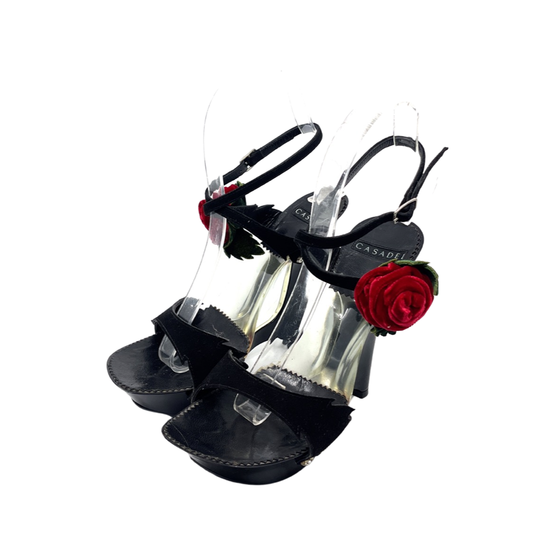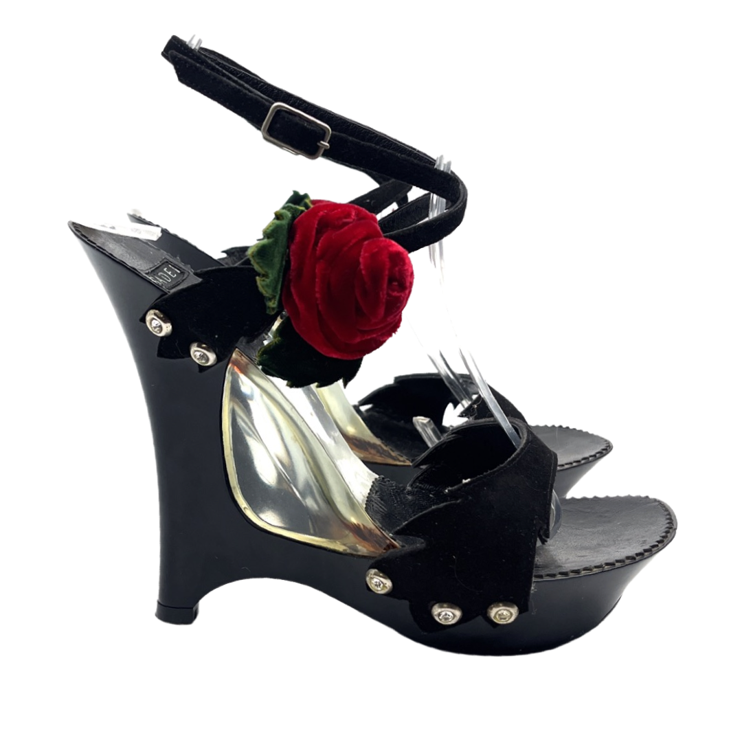 Casadei black suede lucite wedge sandal with rose accent and crystal embellishment. 5 inch wedge.