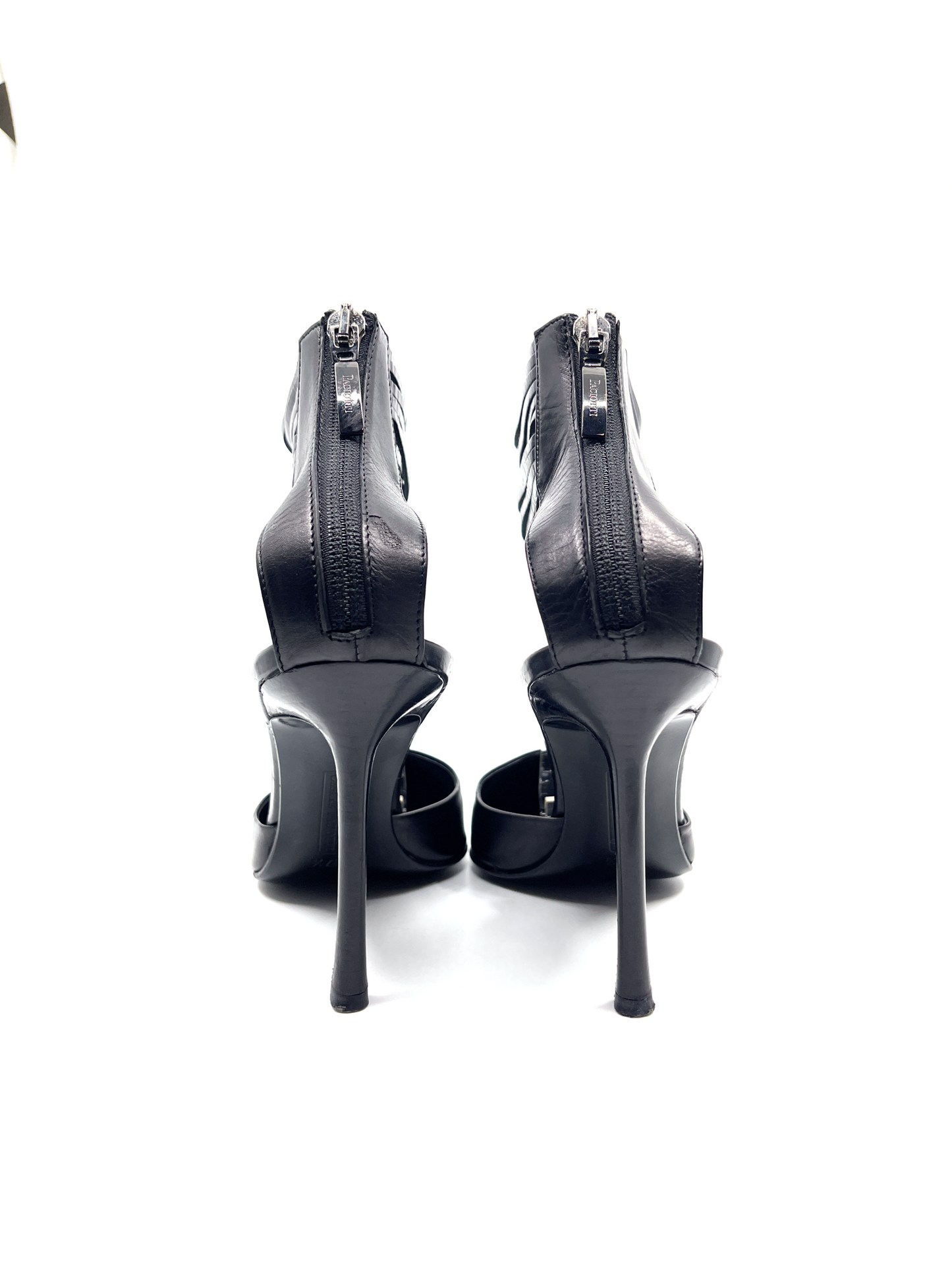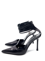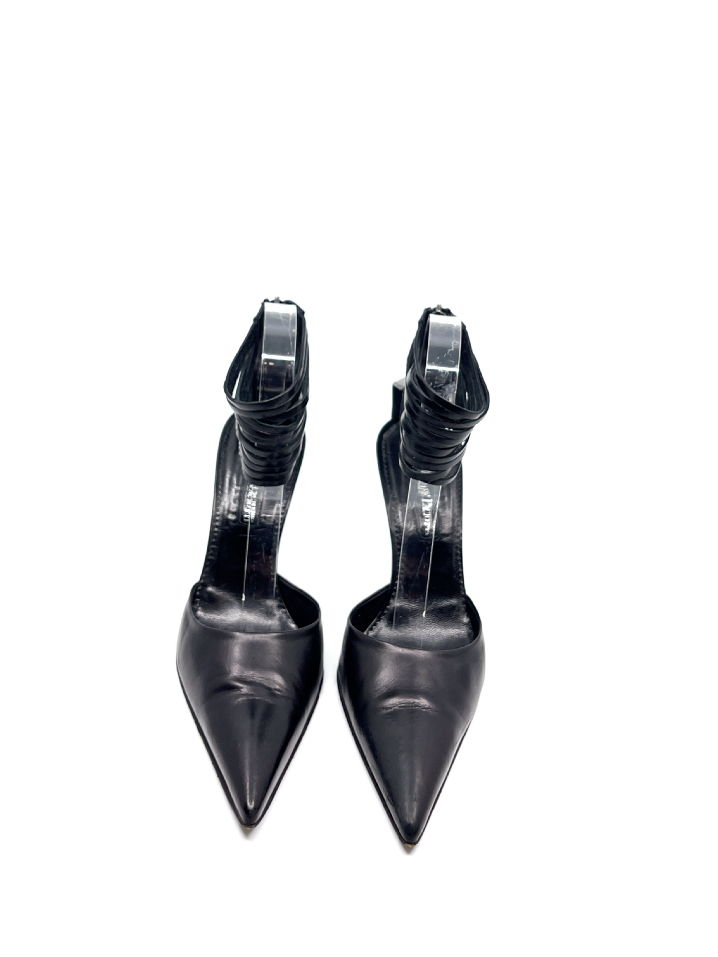 Black pointed toe heels with ankle strap and silver CP charm
