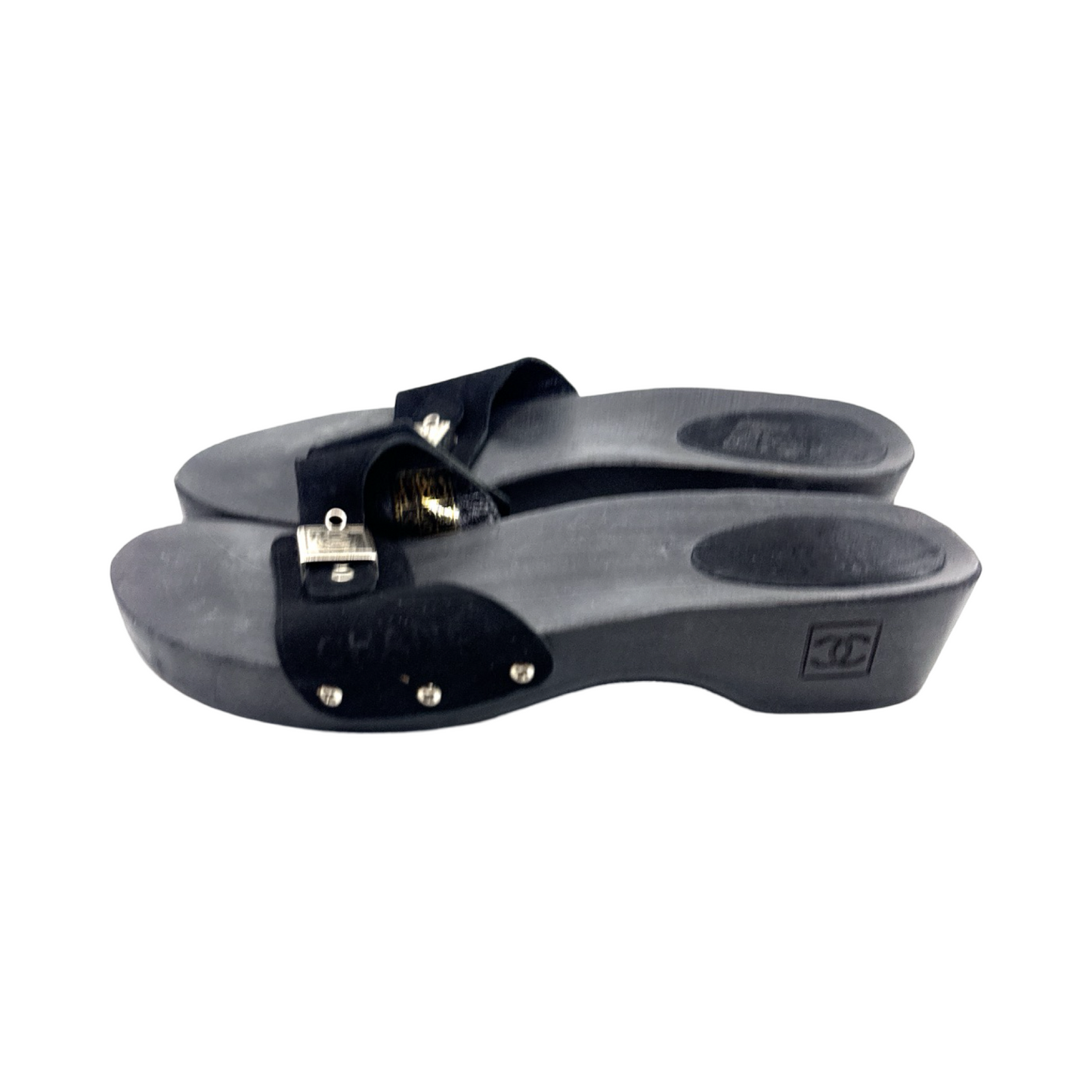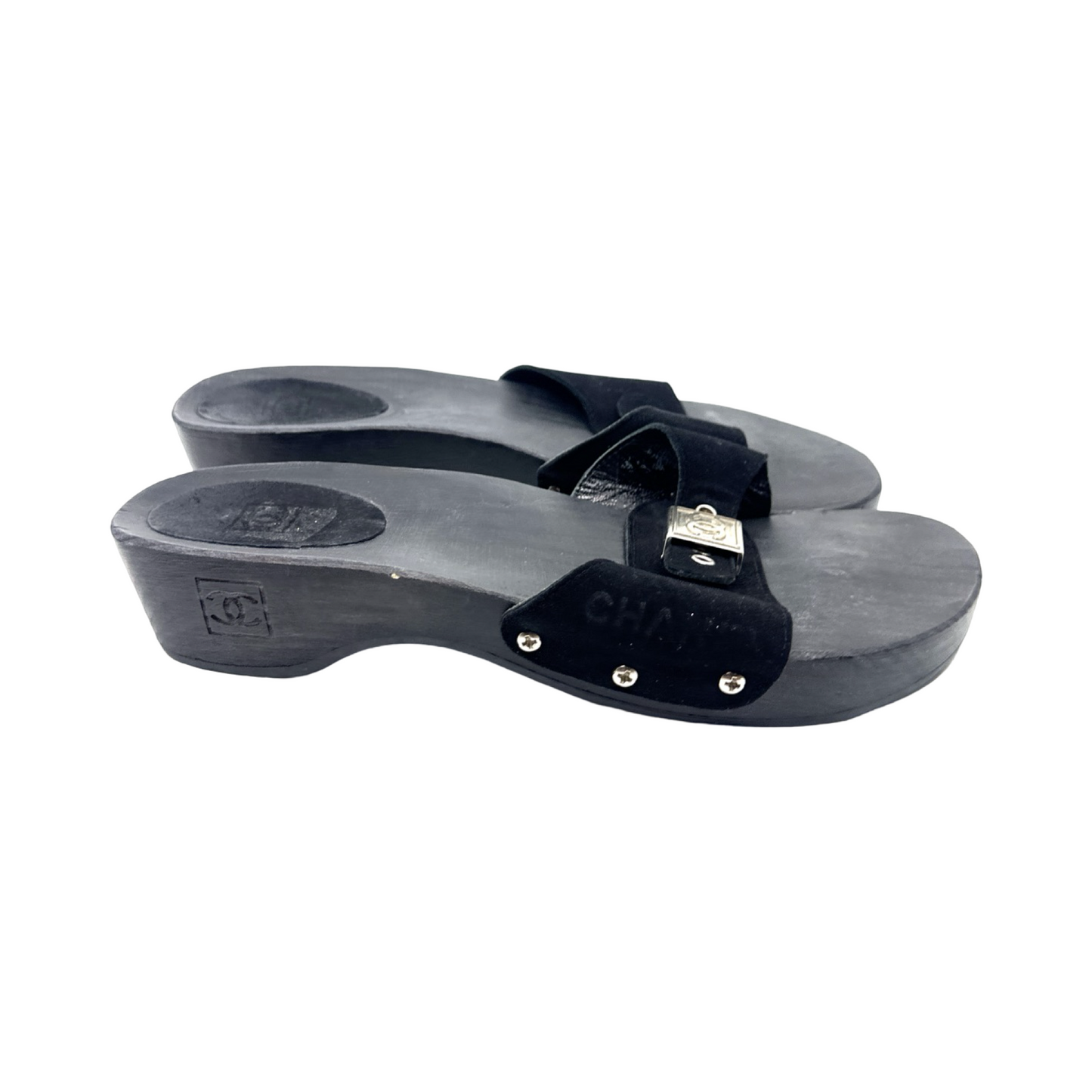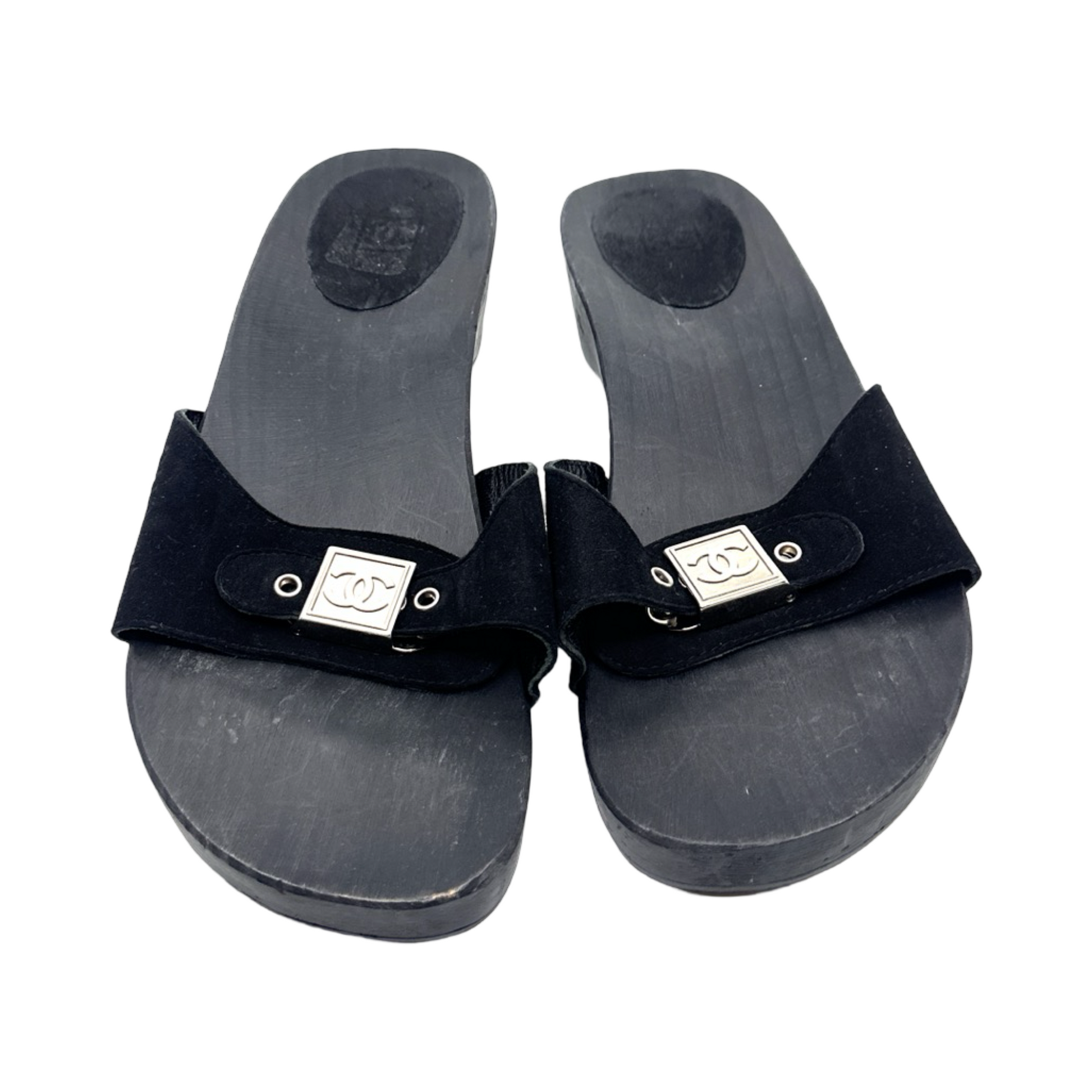 Chanel black suede clogs with silver buckle. In good used condition.