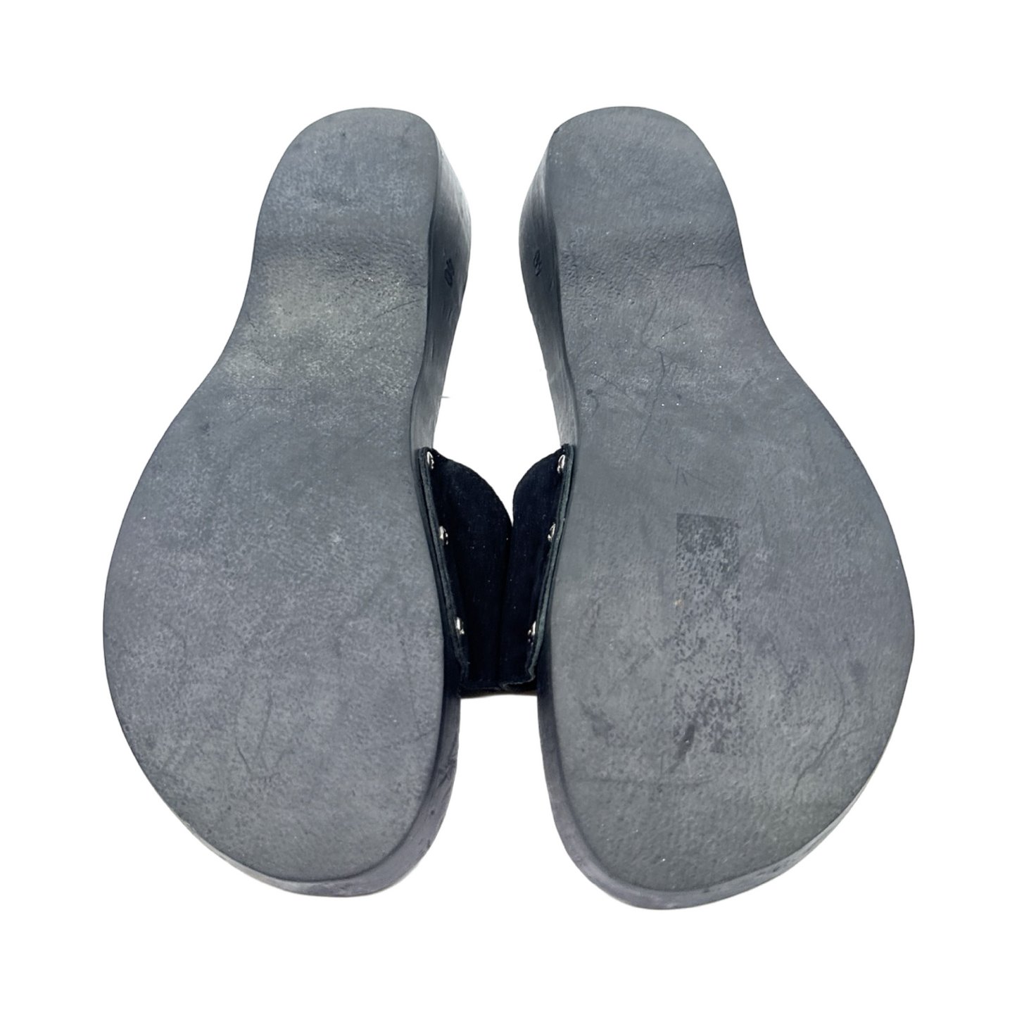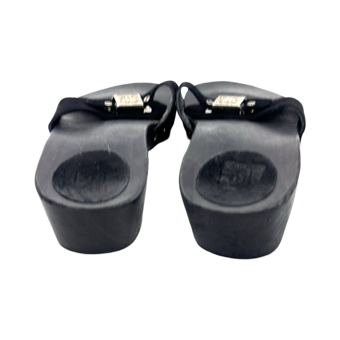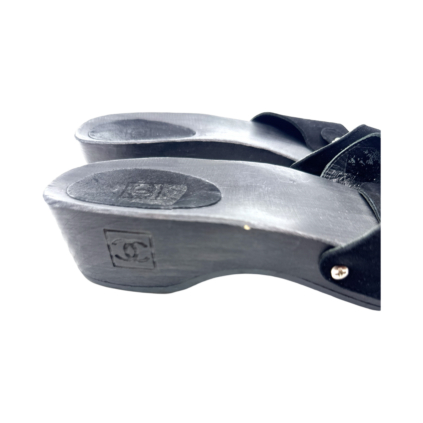 Chanel black suede clogs with silver buckle. In good used condition.