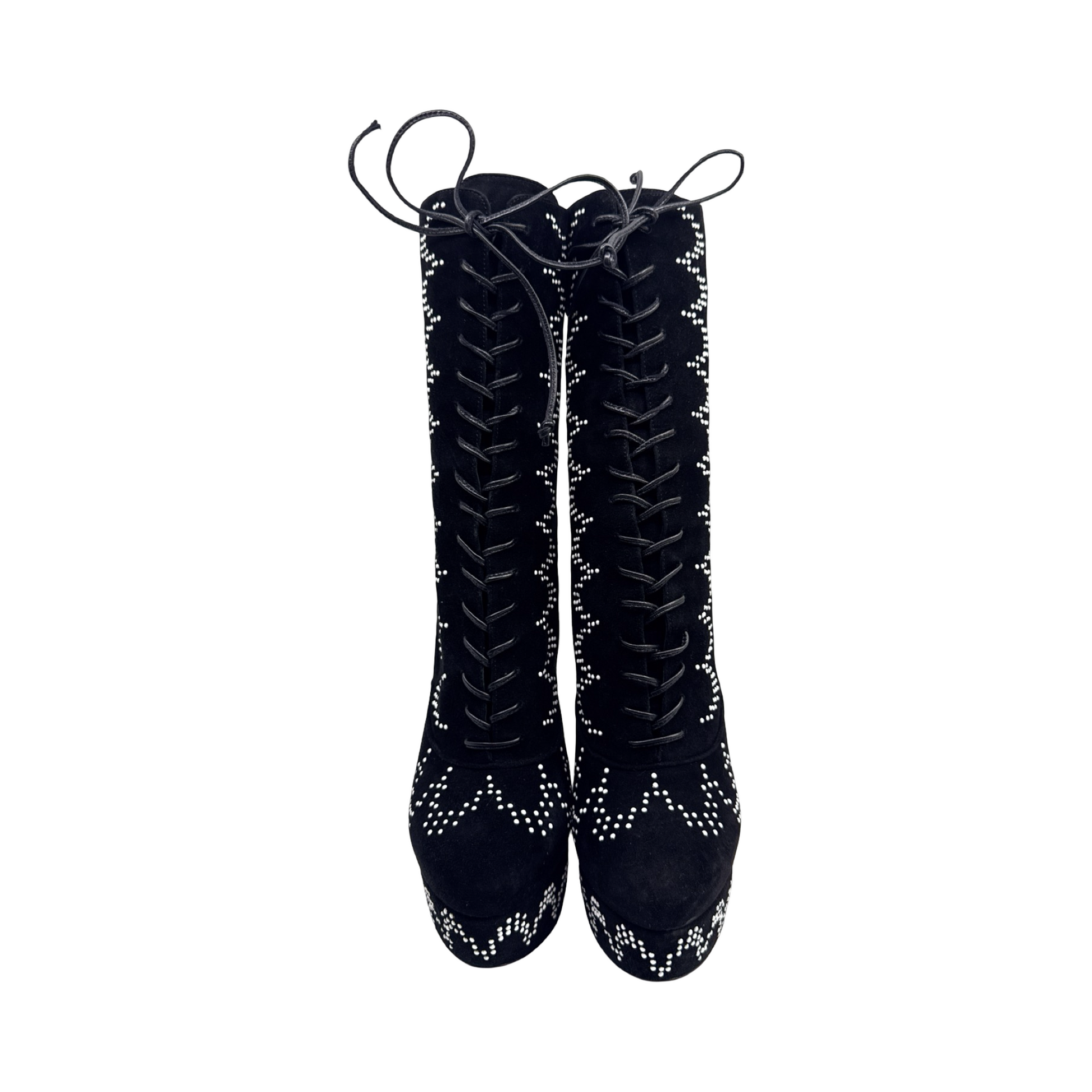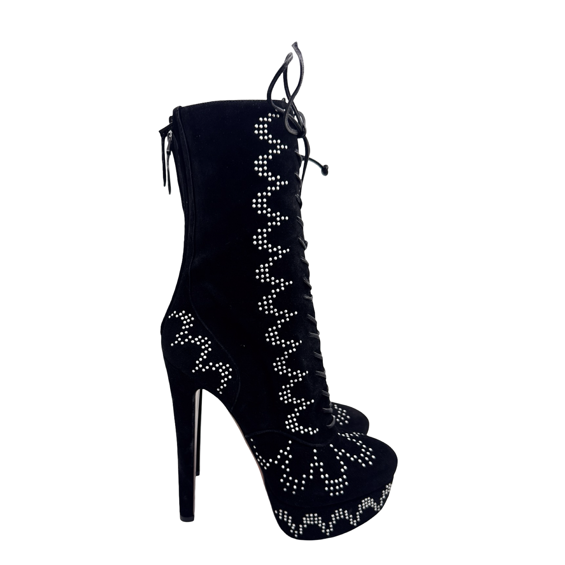 Alaïa black suede round toe bootie in excellent unworn condition. 6 inch heel.