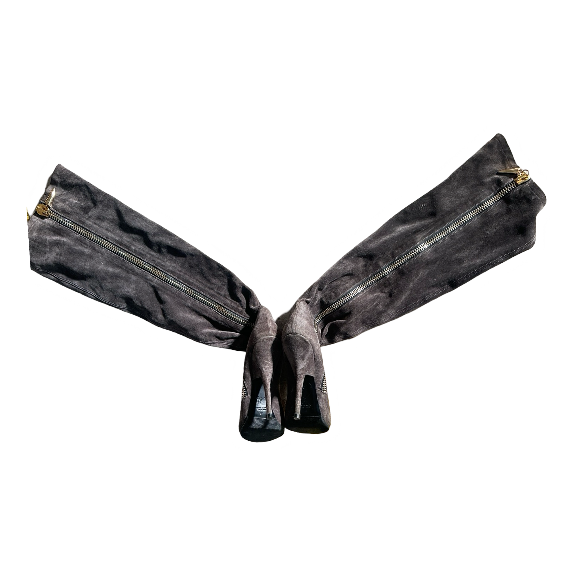 Giuseppe Zanotti grey suede over the knee boots with jumbo gold zipper. In excellent unworn condition. 5.5 inch heel, 16inch calf circumference.