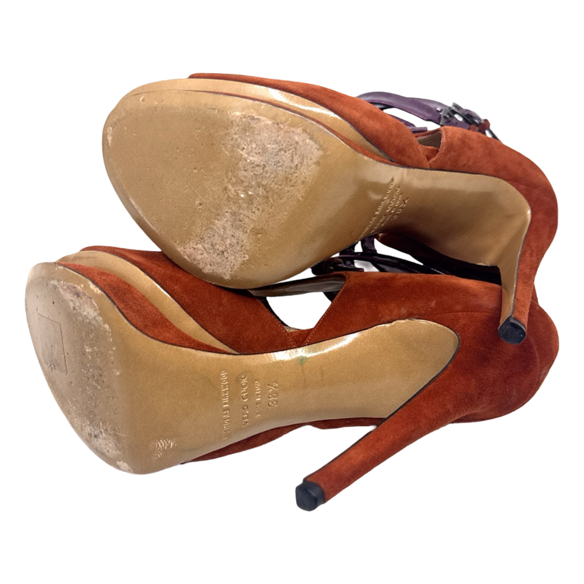 Vintage burnt orange suede heels with purple metallic straps. In good gently used condition. Signs of wear not obvious when on.