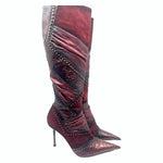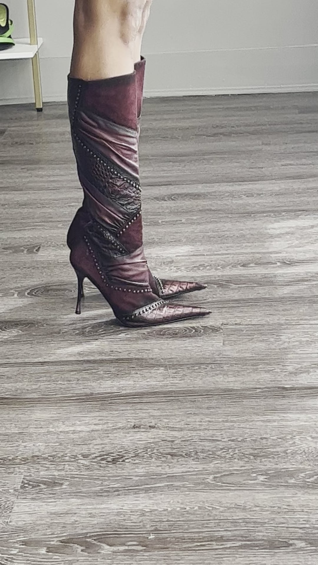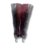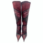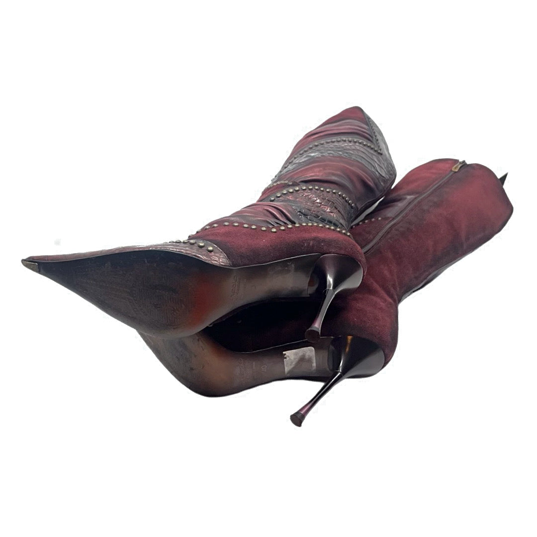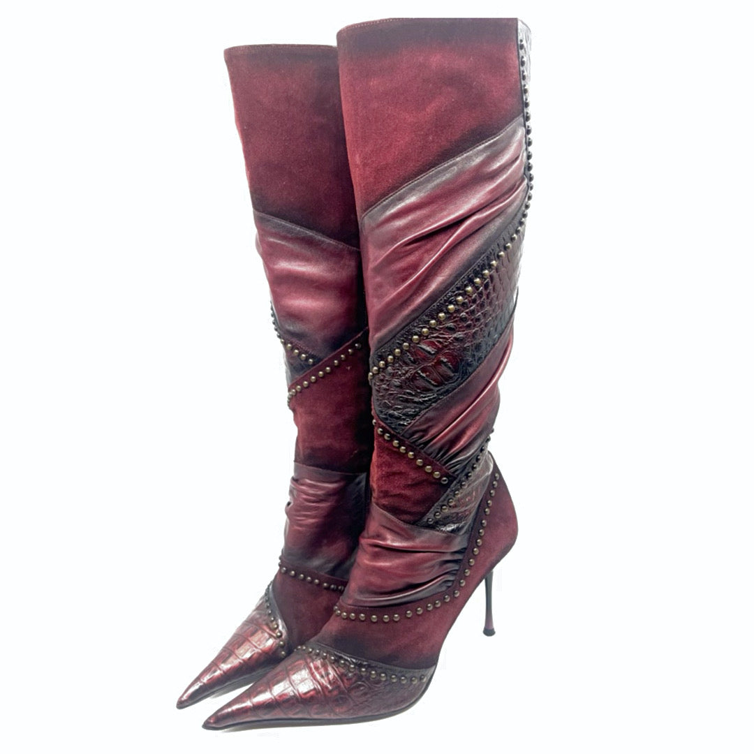 El Dantes Vintage suede burgundy pointed toe leather and suede patchwork boot with brass embellishments. Unworn in excellent condition. *16 inch calf.