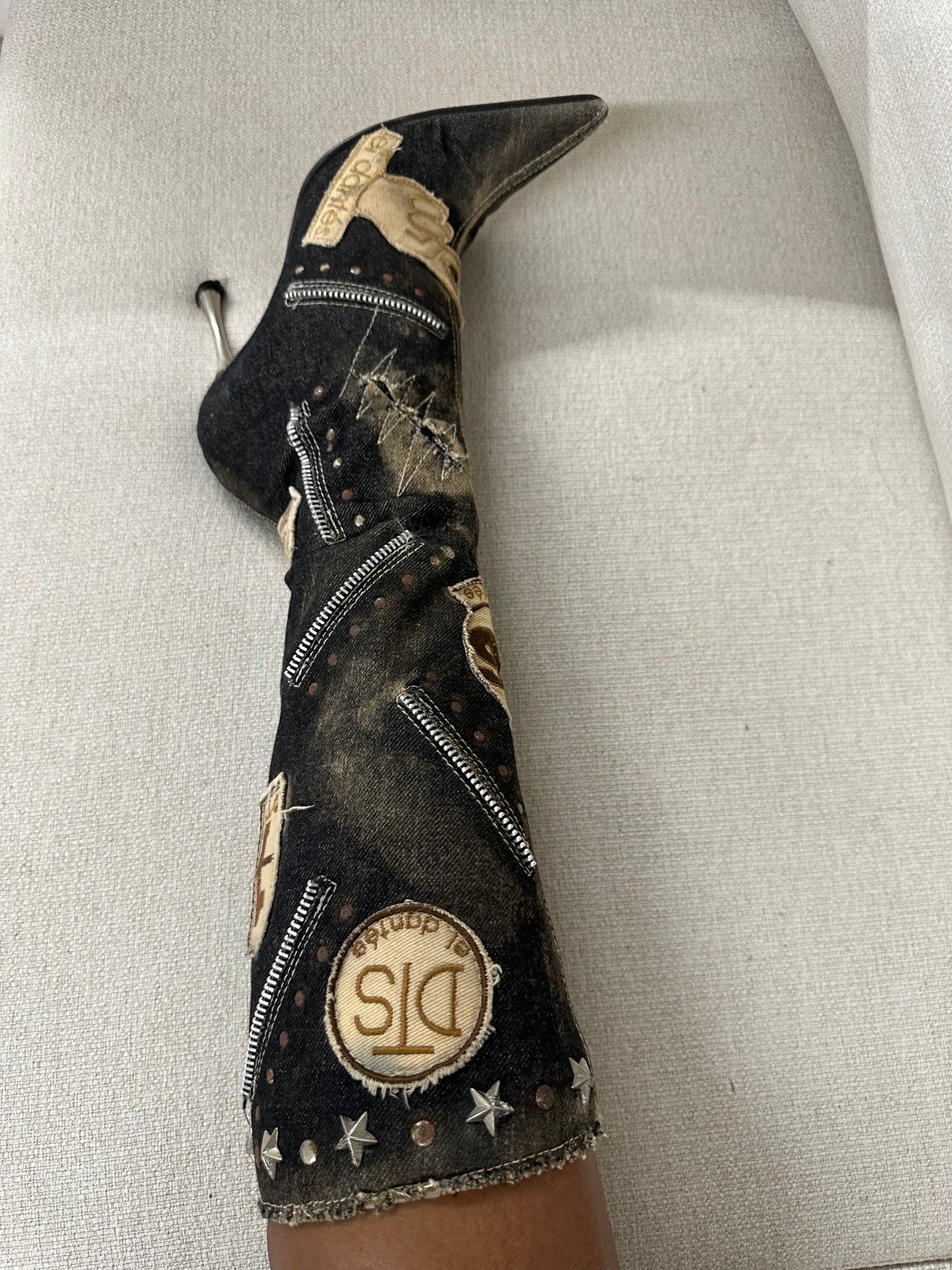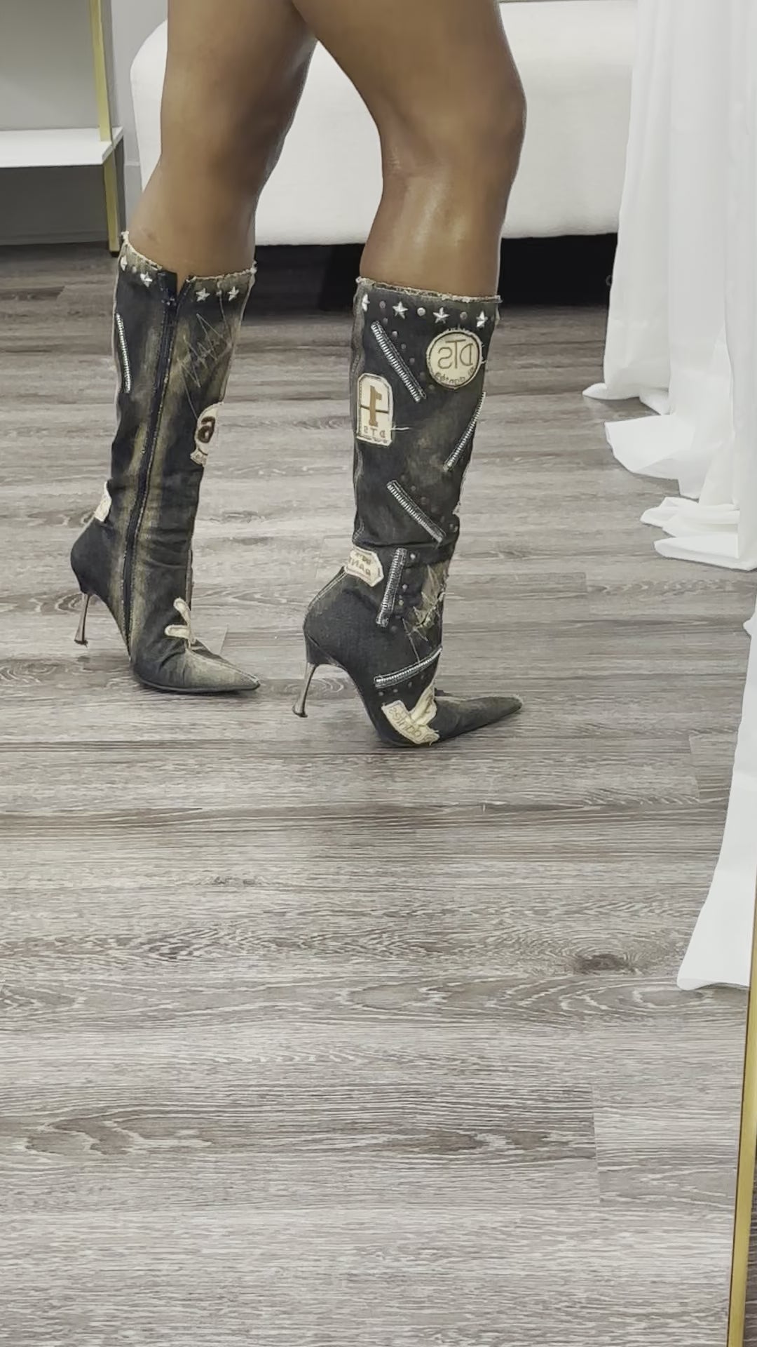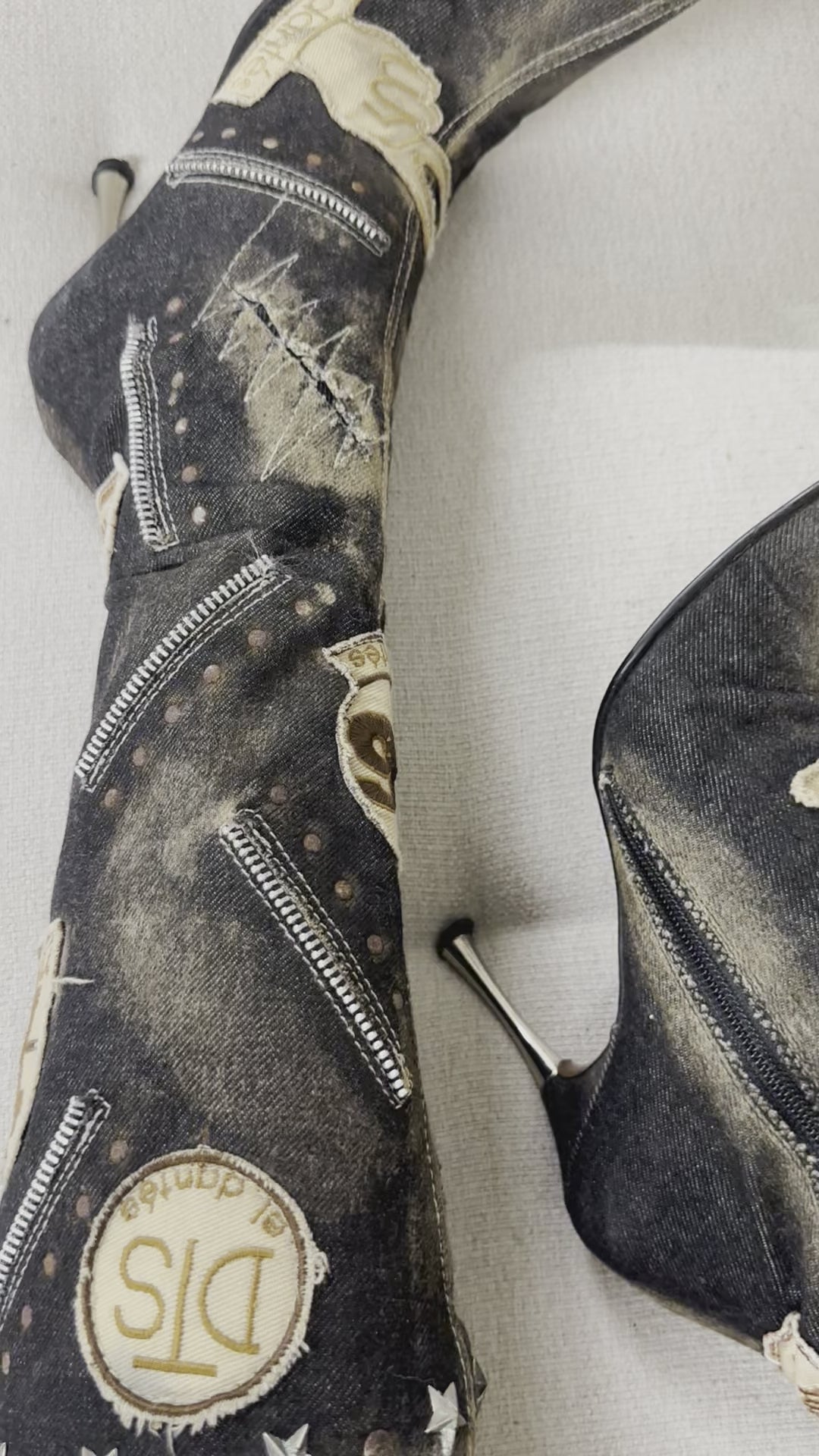 El Dantes Y2K distressed denim patchwork boots. In great condition. Heel height 4 inches , calf circumference 14inches.