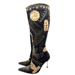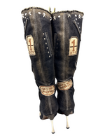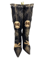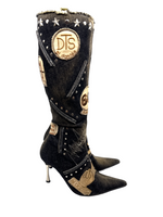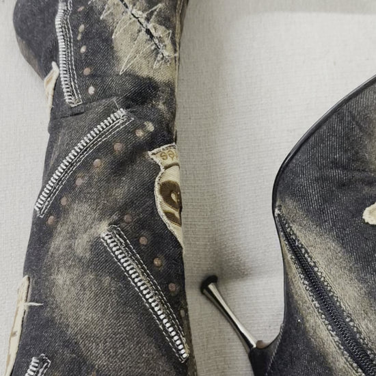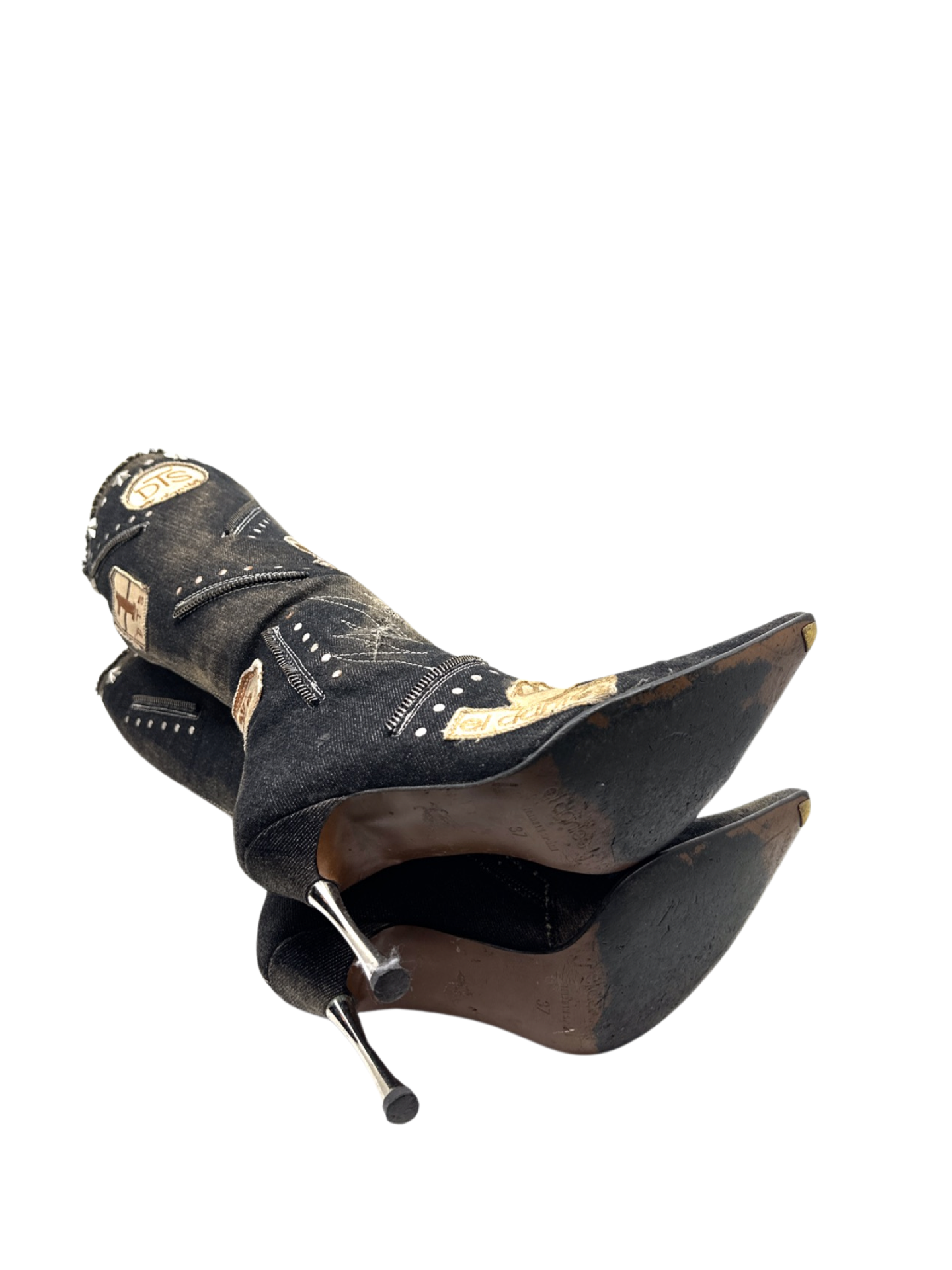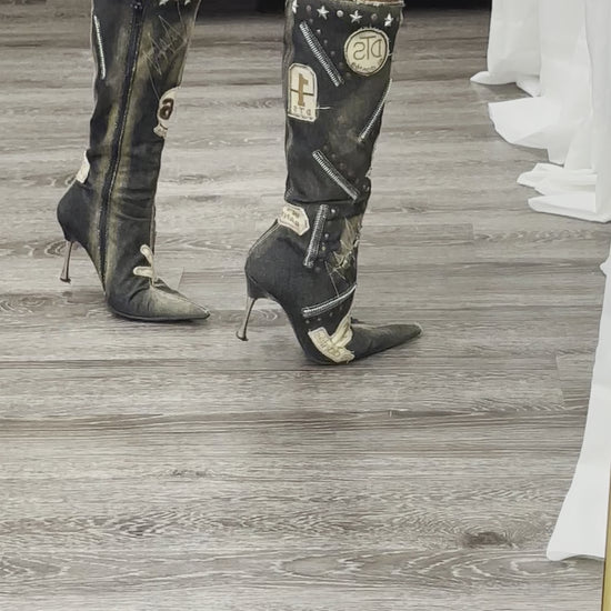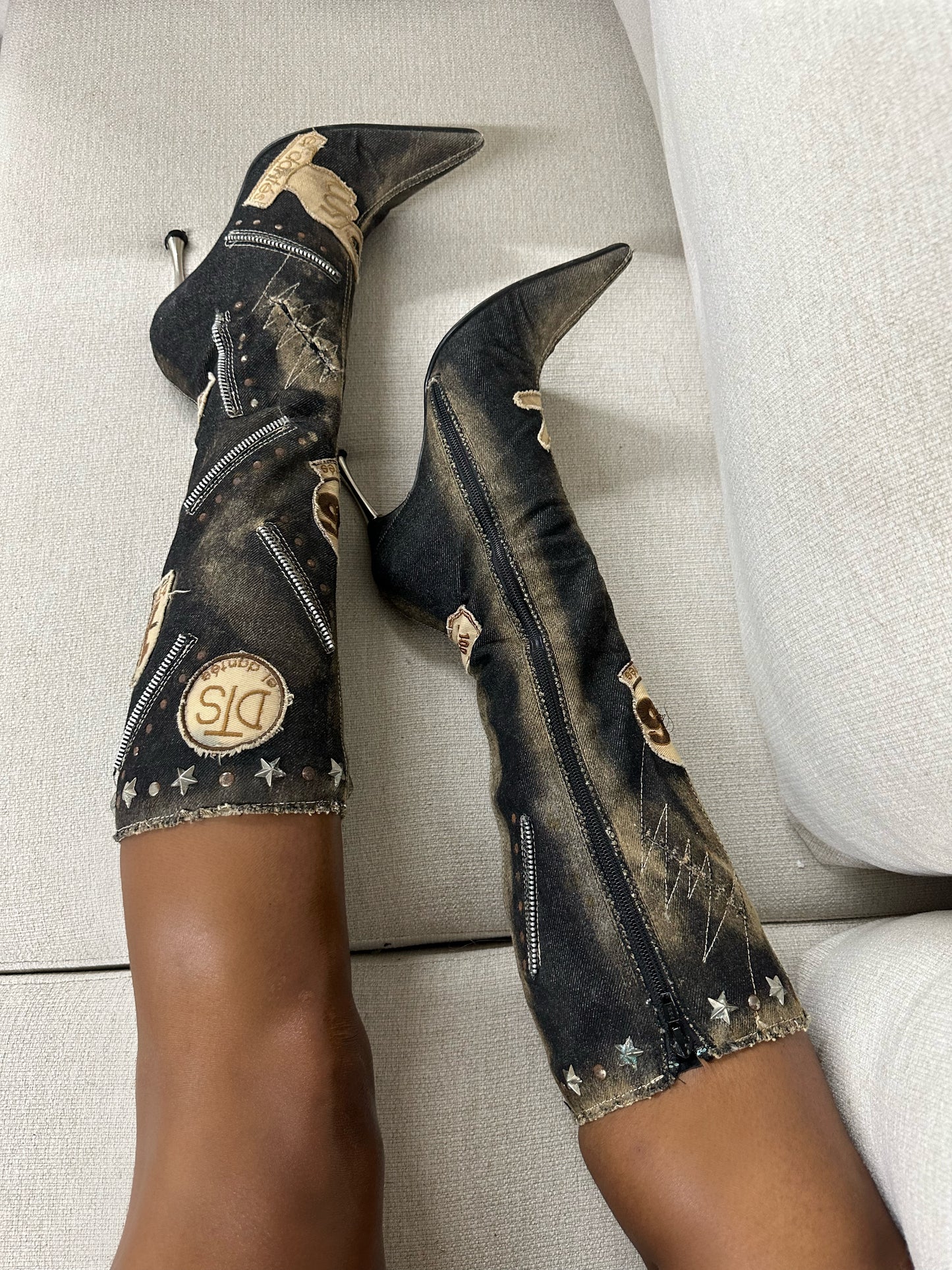 El Dantes Y2K distressed denim patchwork boots. In great condition. Heel height 4 inches , calf circumference 14inches.