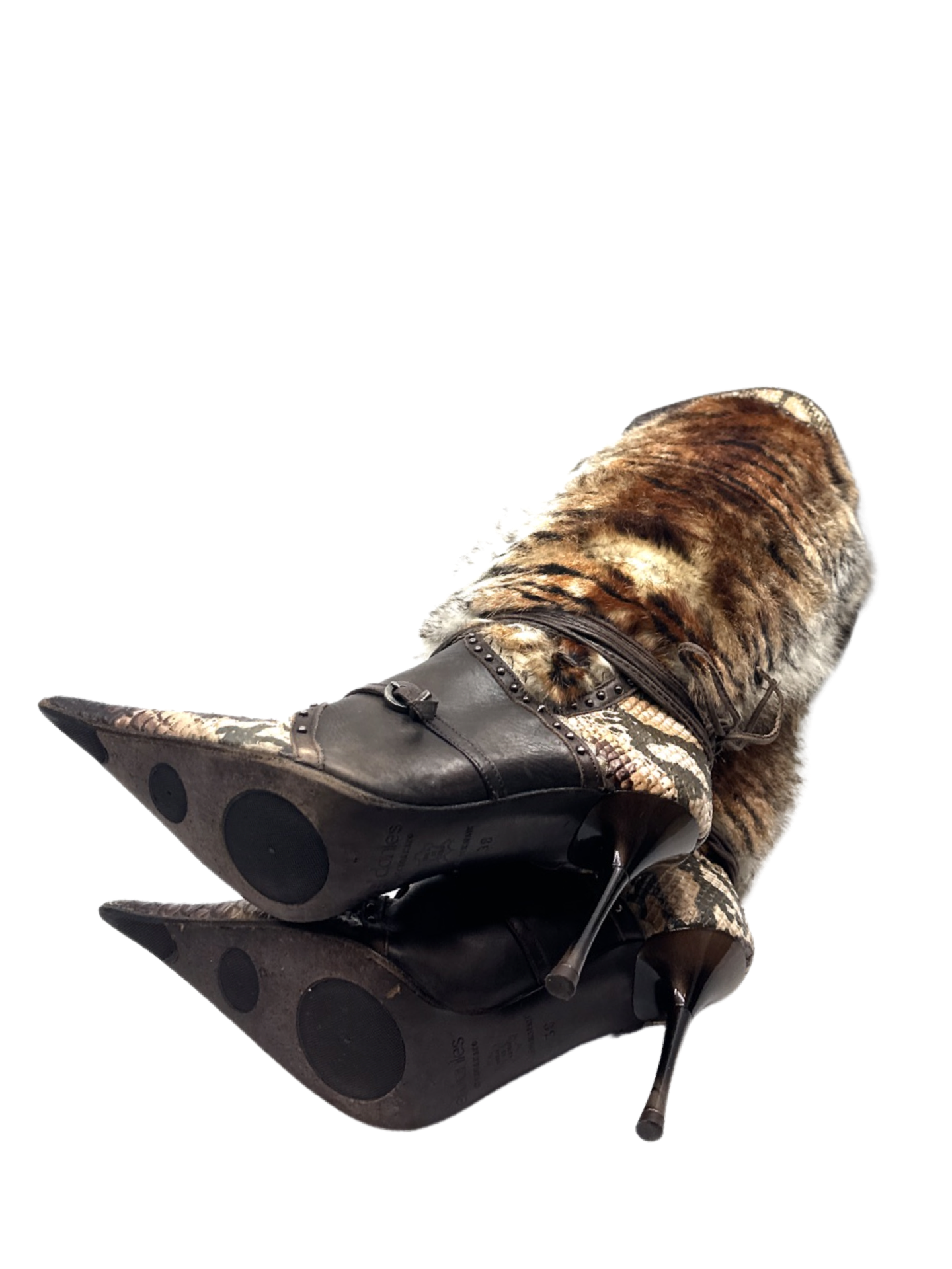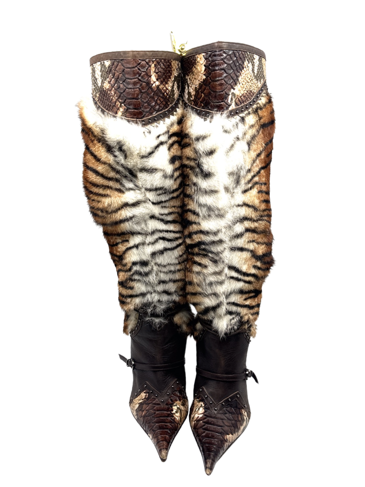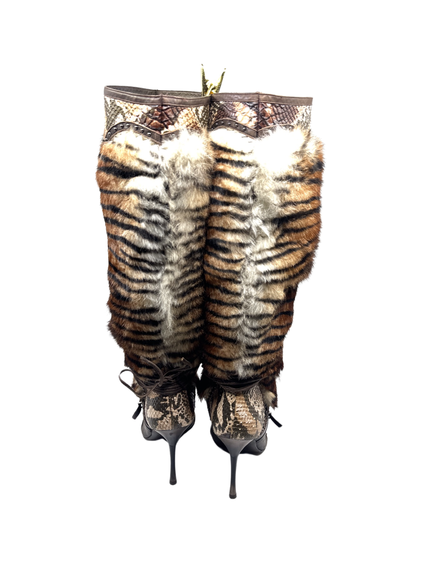 El Dantes brown ombré zebra printed fur boots with python and stud details. In excellent condition 4 inch 16inch calf circumference
