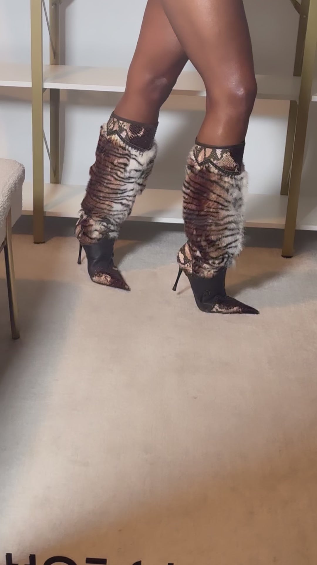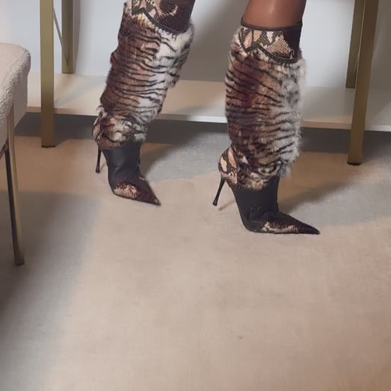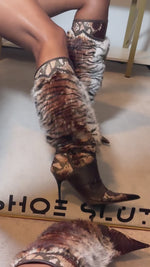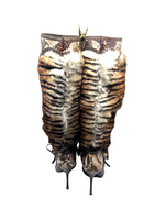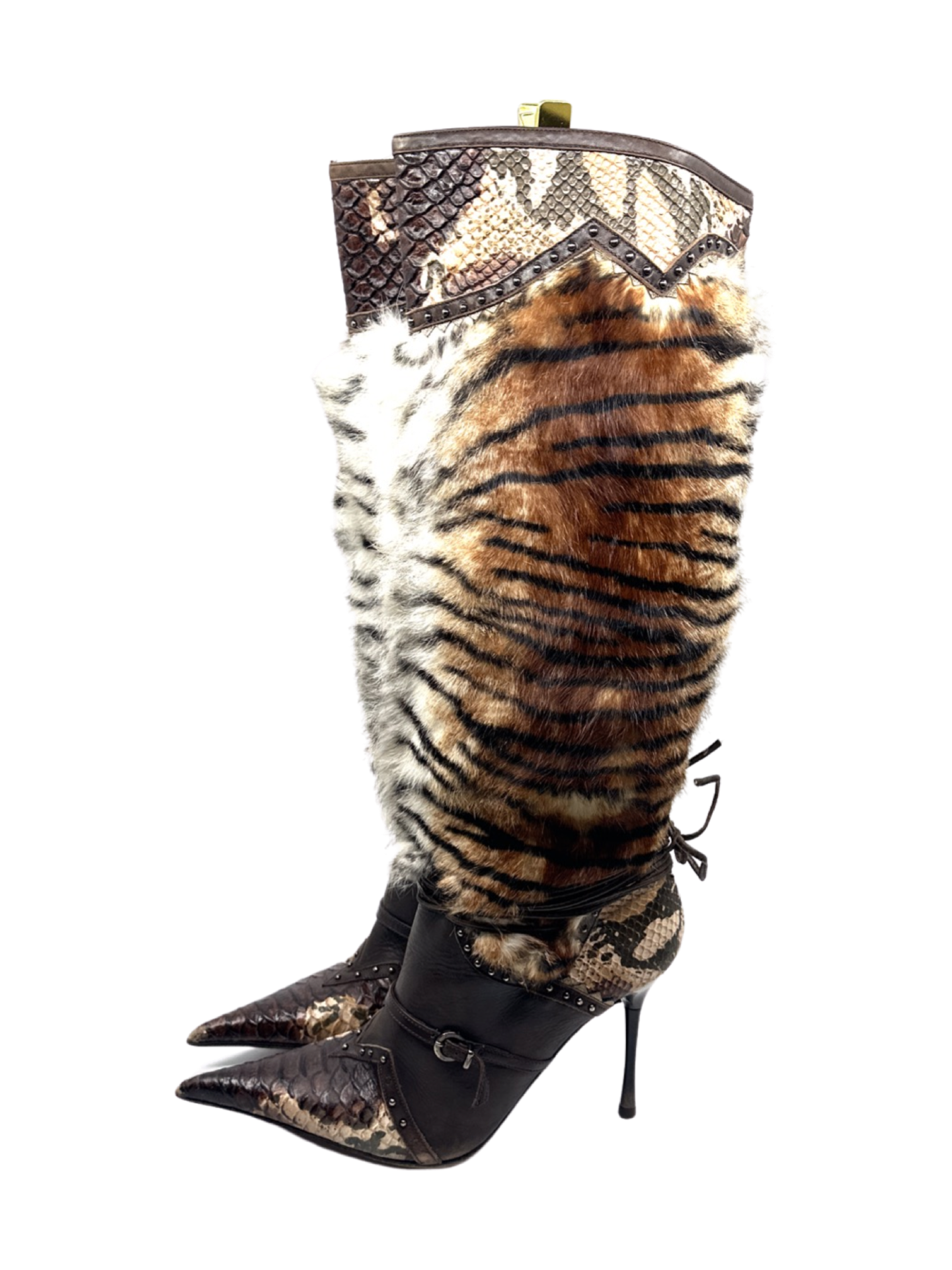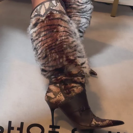 El Dantes brown ombré zebra printed fur boots with python and stud details. In excellent condition 4 inch 16inch calf circumference
