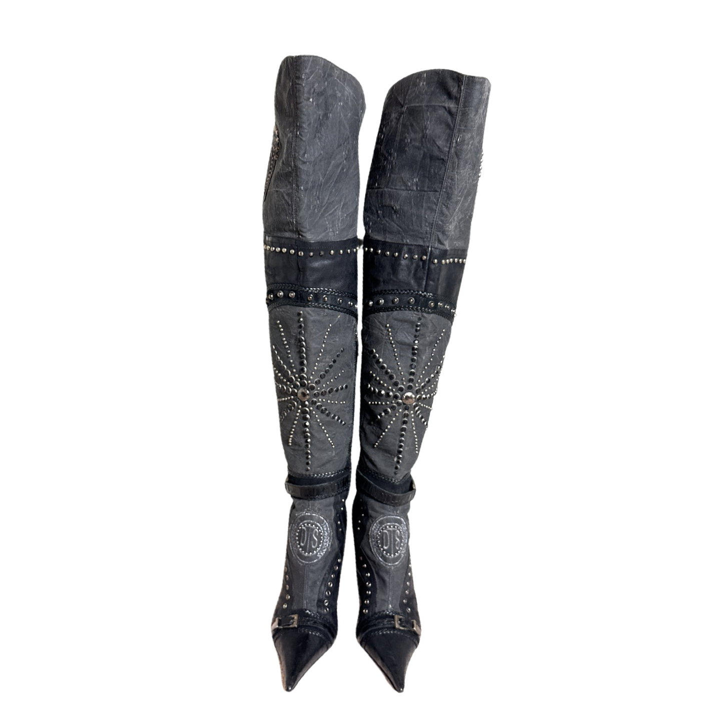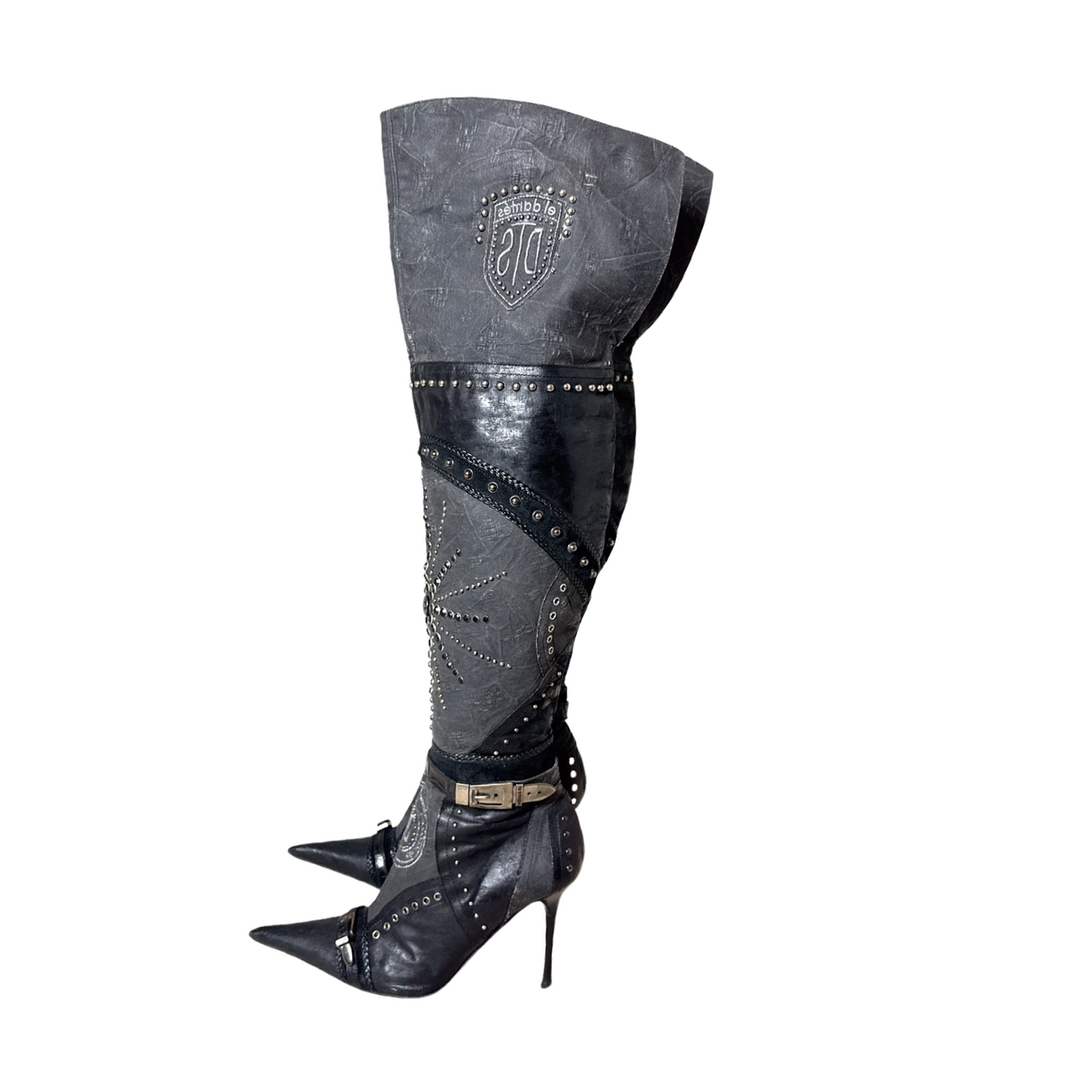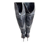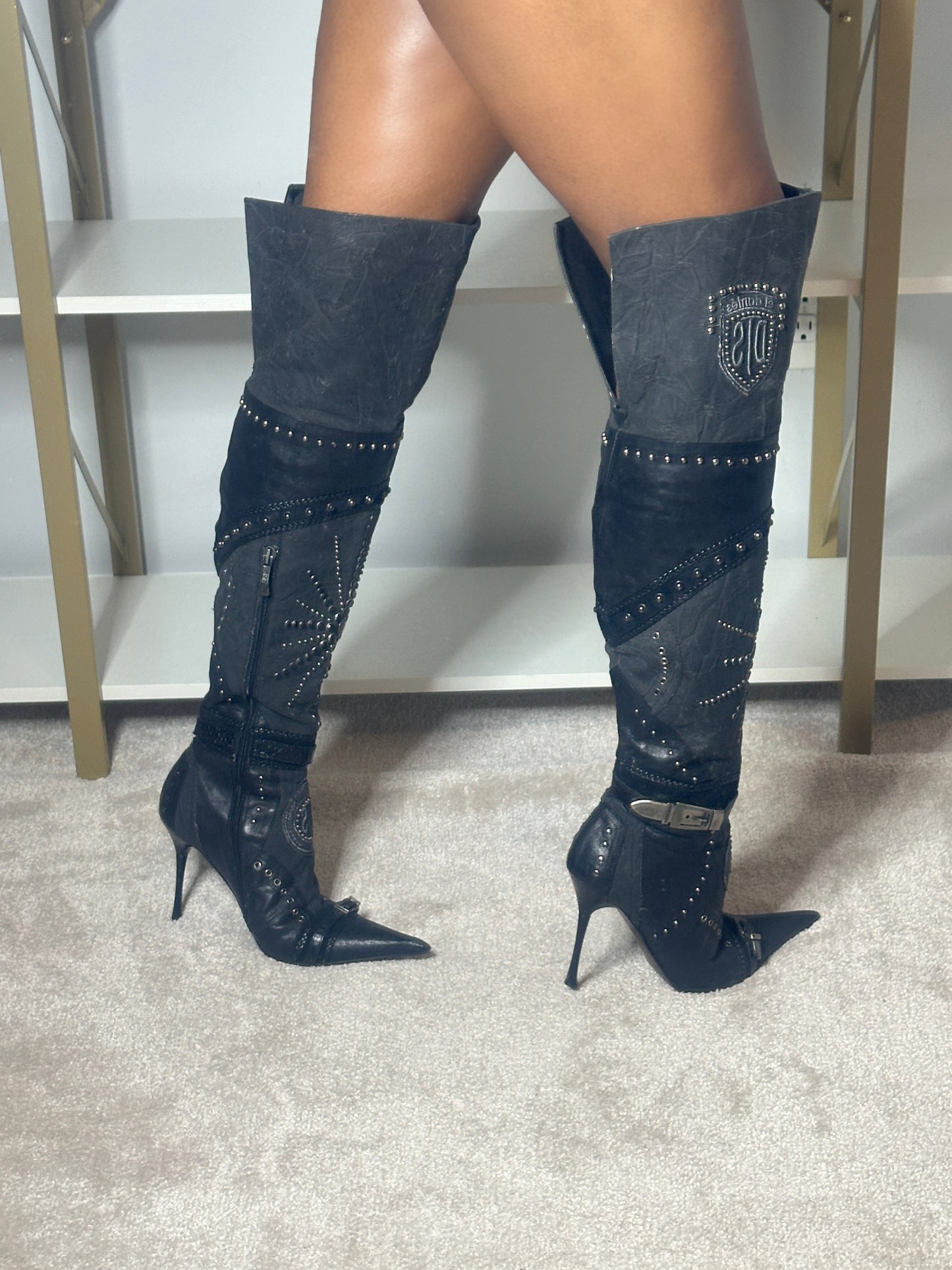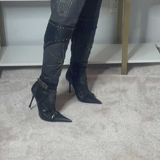 El Dantes black leather and Canvas over the knee boots with stud and jewel embellishments. In excellent used condition. 4 inch heel, 16 inch calf circumference.