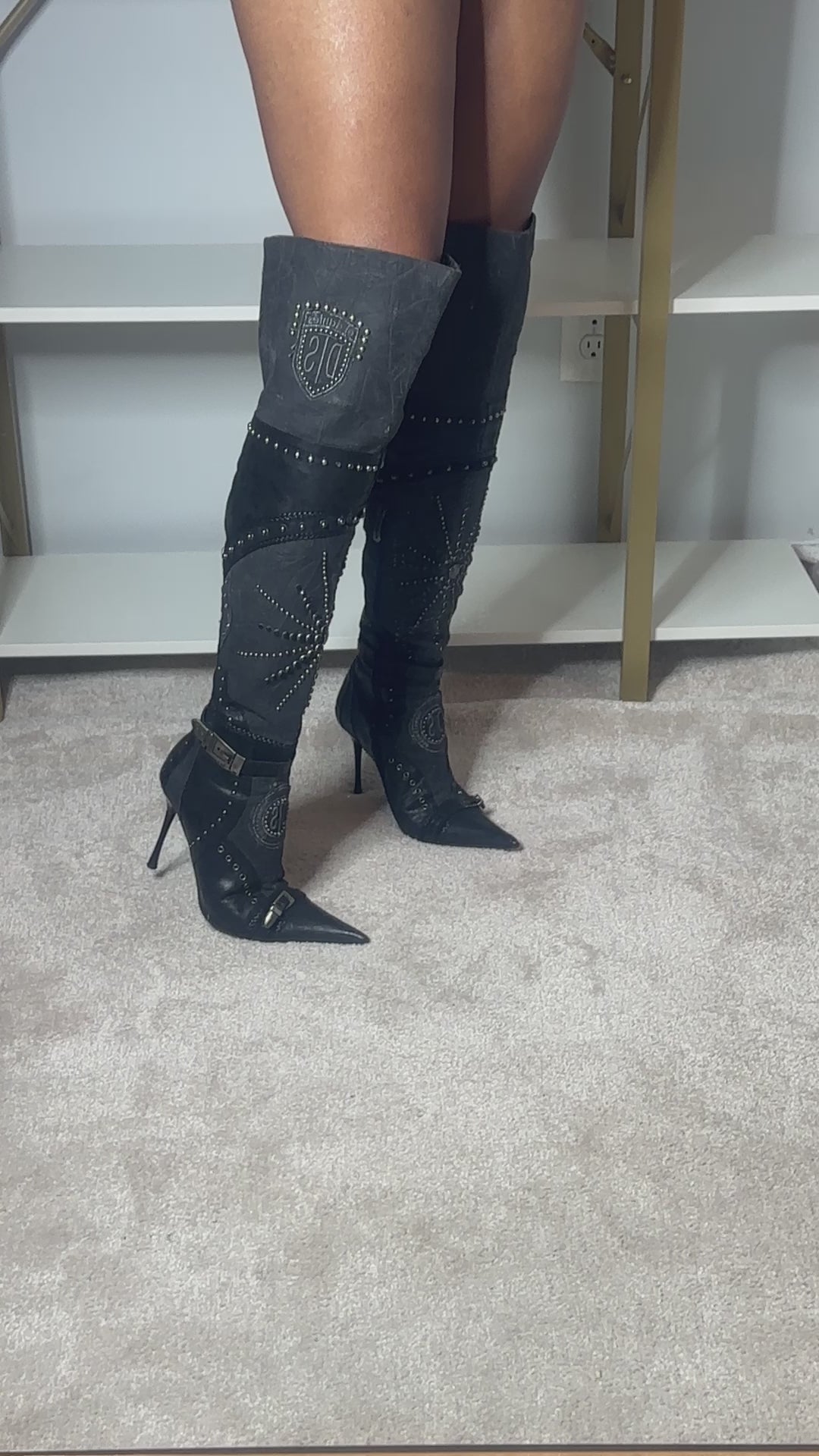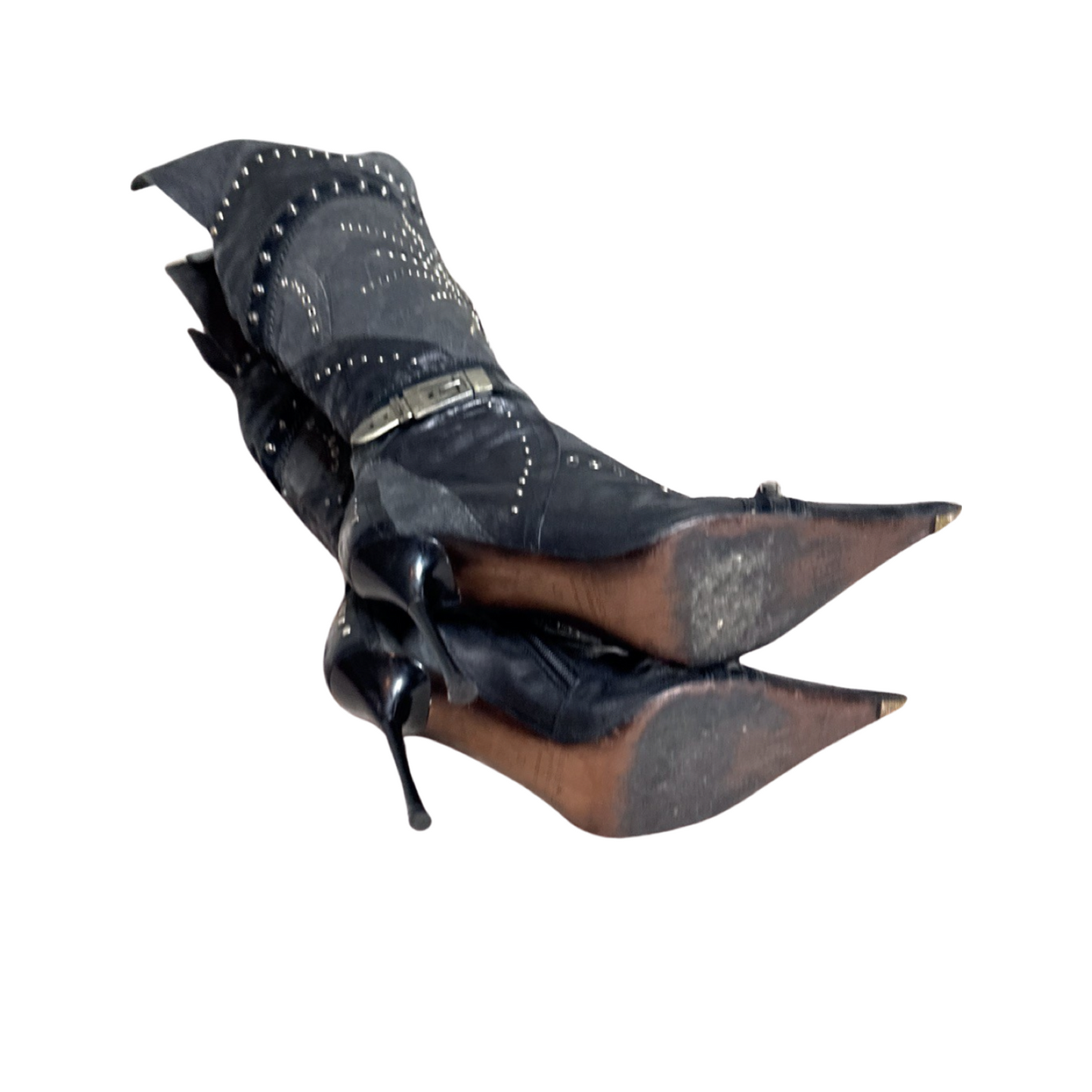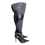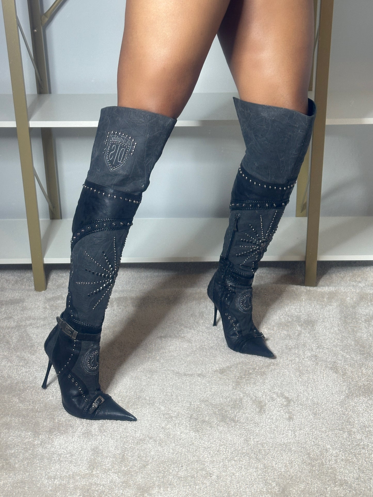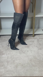 El Dantes black leather and Canvas over the knee boots with stud and jewel embellishments. In excellent used condition. 4 inch heel, 16 inch calf circumference.