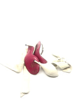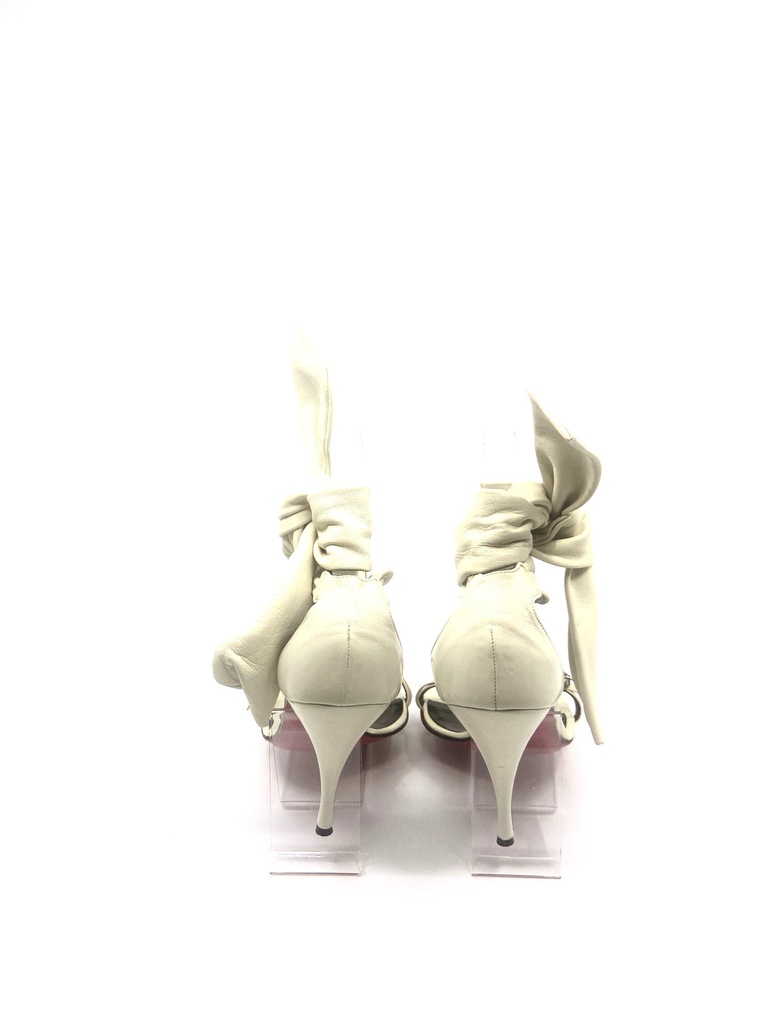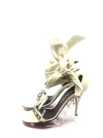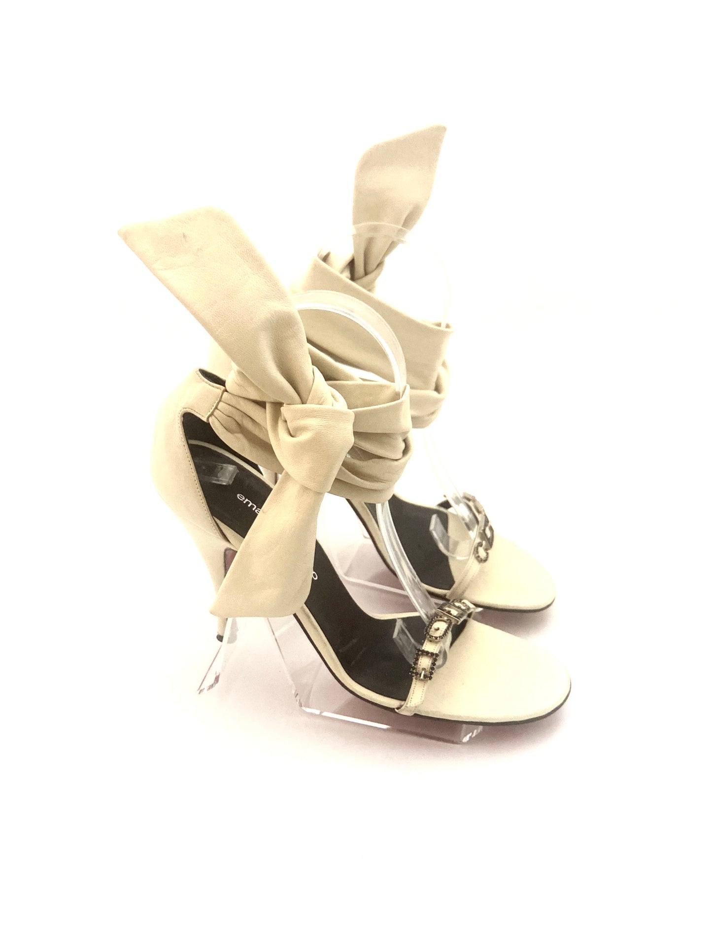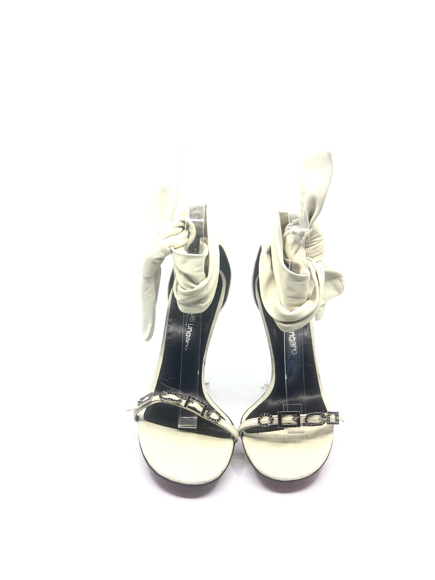 Emanuel Ungaro vintage off white leather ankle tie sandal with crystal buckle details.