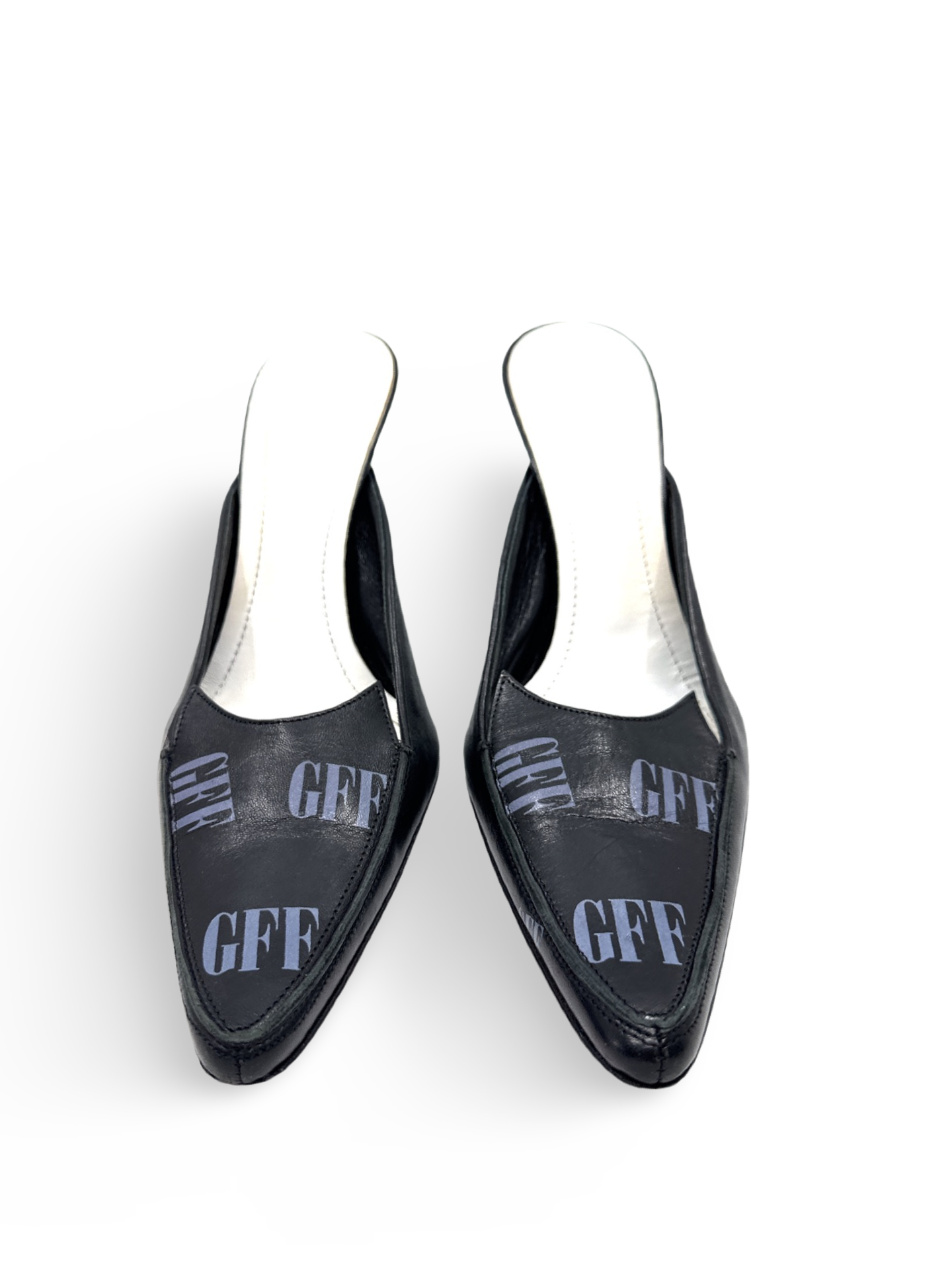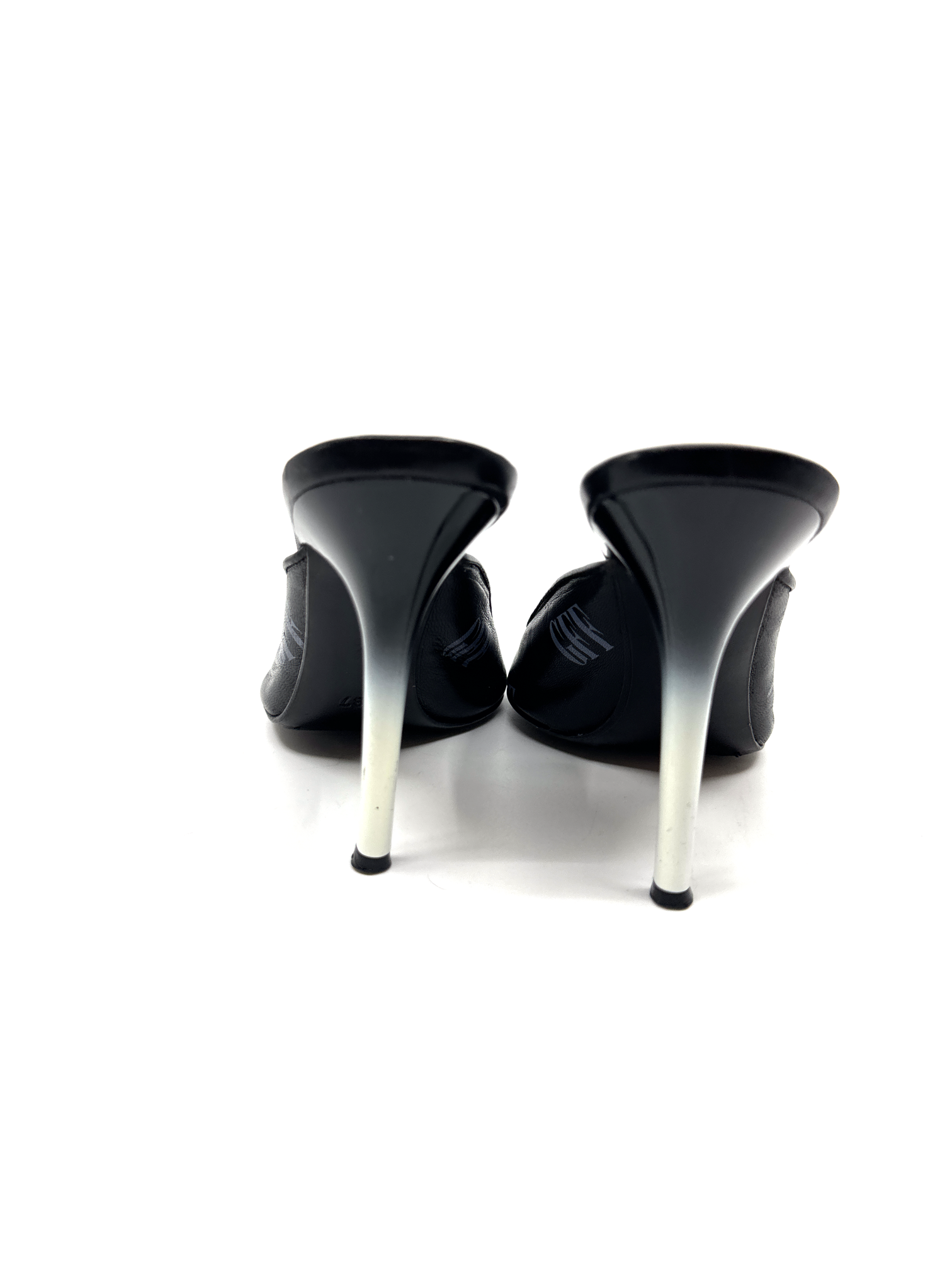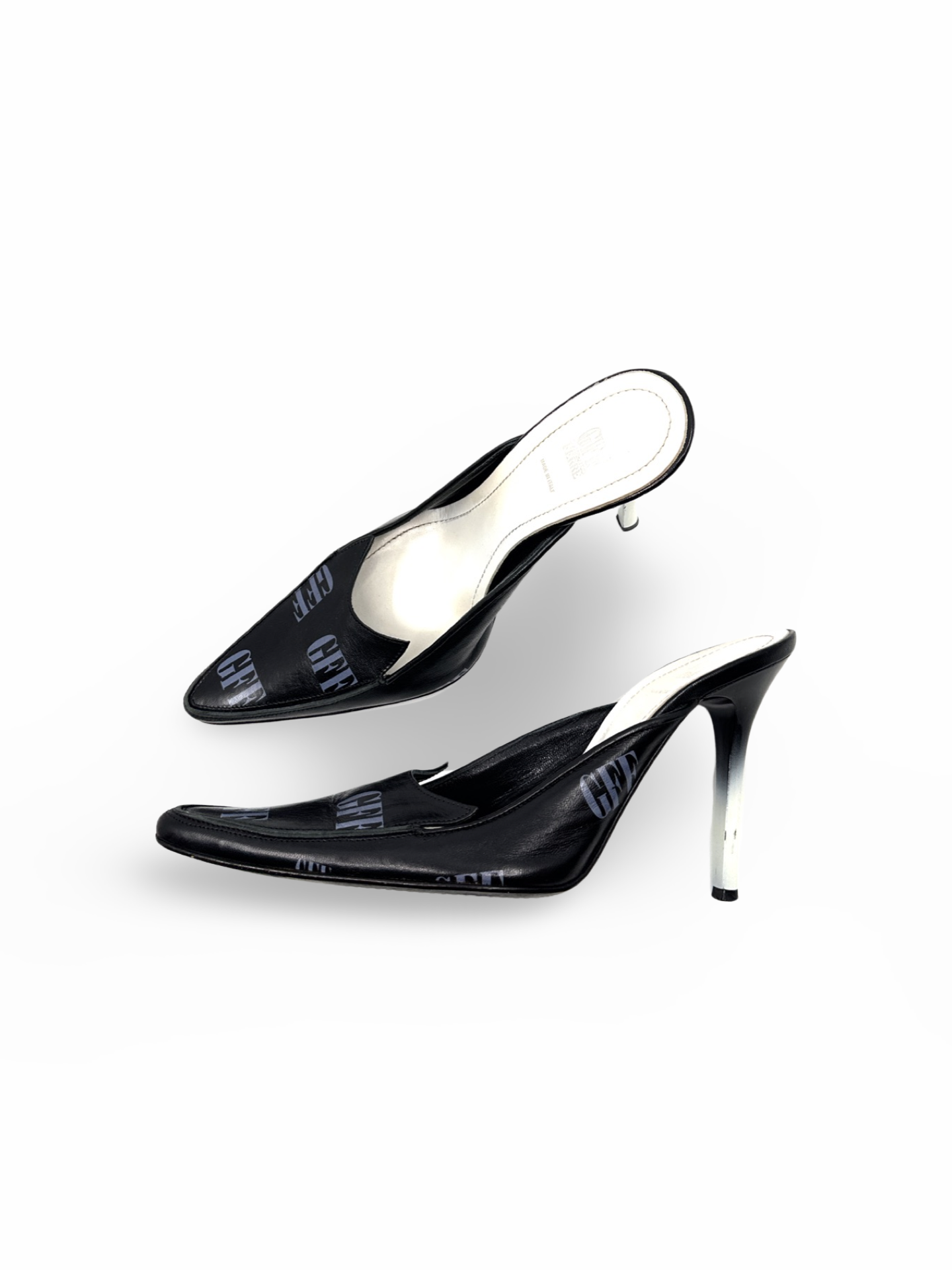 Gianfranco Ferre black mule with blue GFF stamp print and white ombré stiletto. In excellent condition, 4 inch heel.
