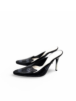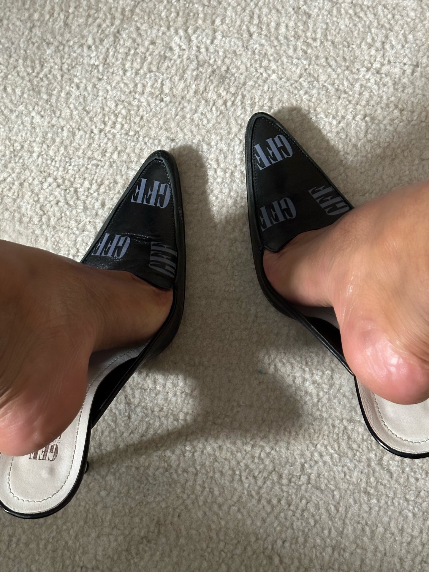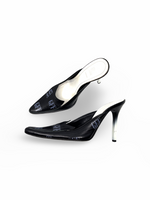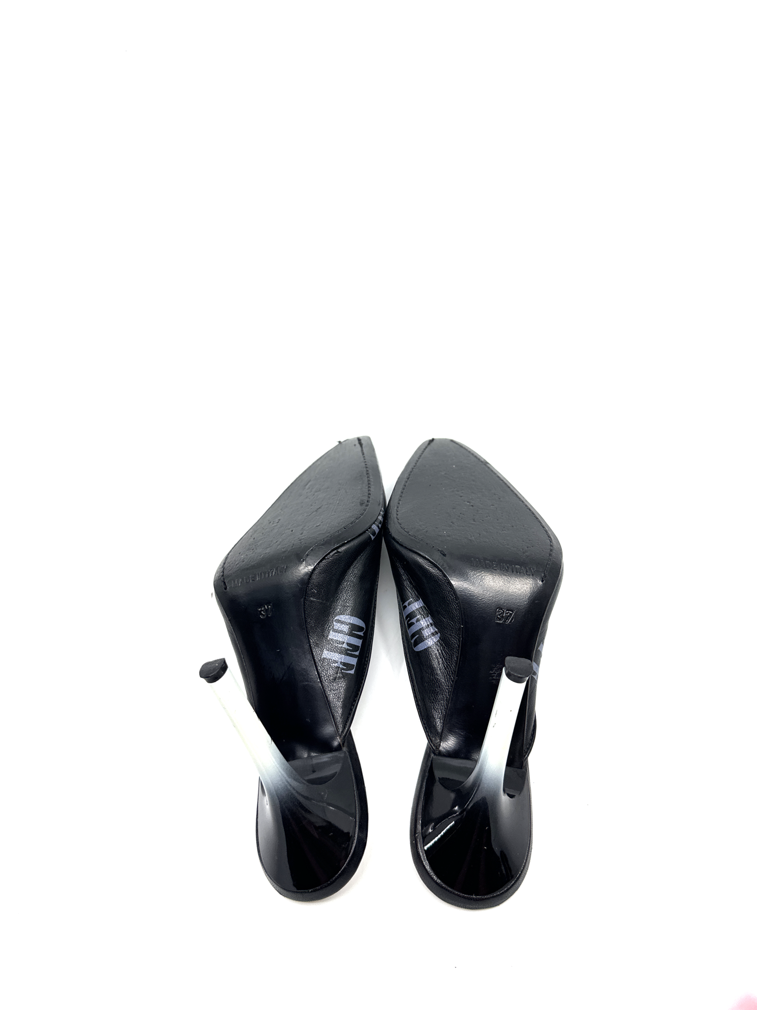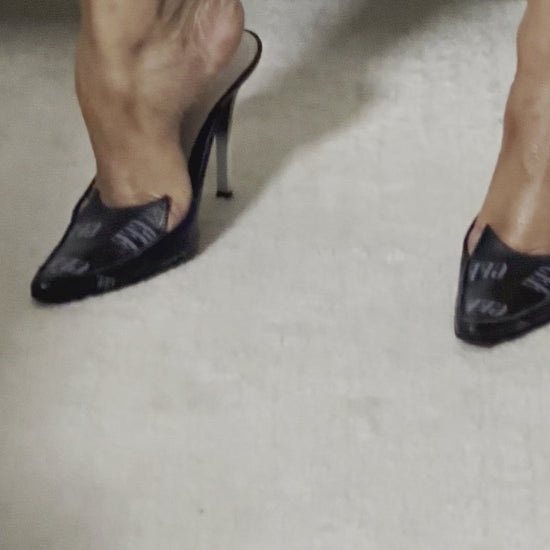 Gianfranco Ferre black mule with blue GFF stamp print and white ombré stiletto. In excellent condition, 4 inch heel.