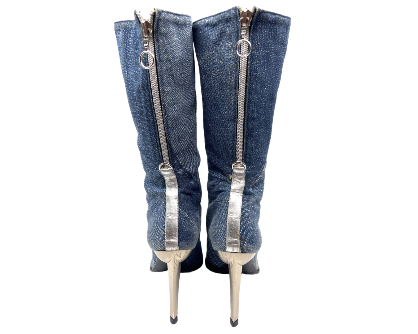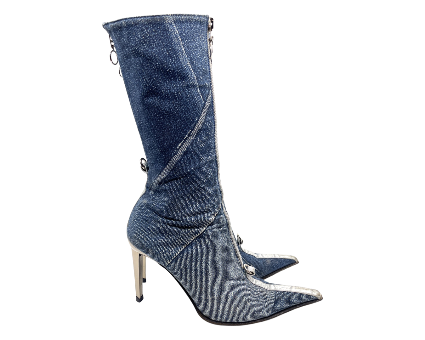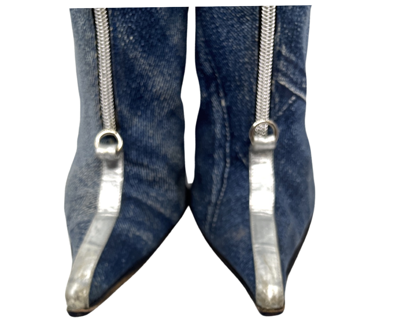 Gianmarco Lorenzi denim bootie with silver zippers. *Signs of wear throughout, does not take away from the beauty of these shoes. 4 inch heel