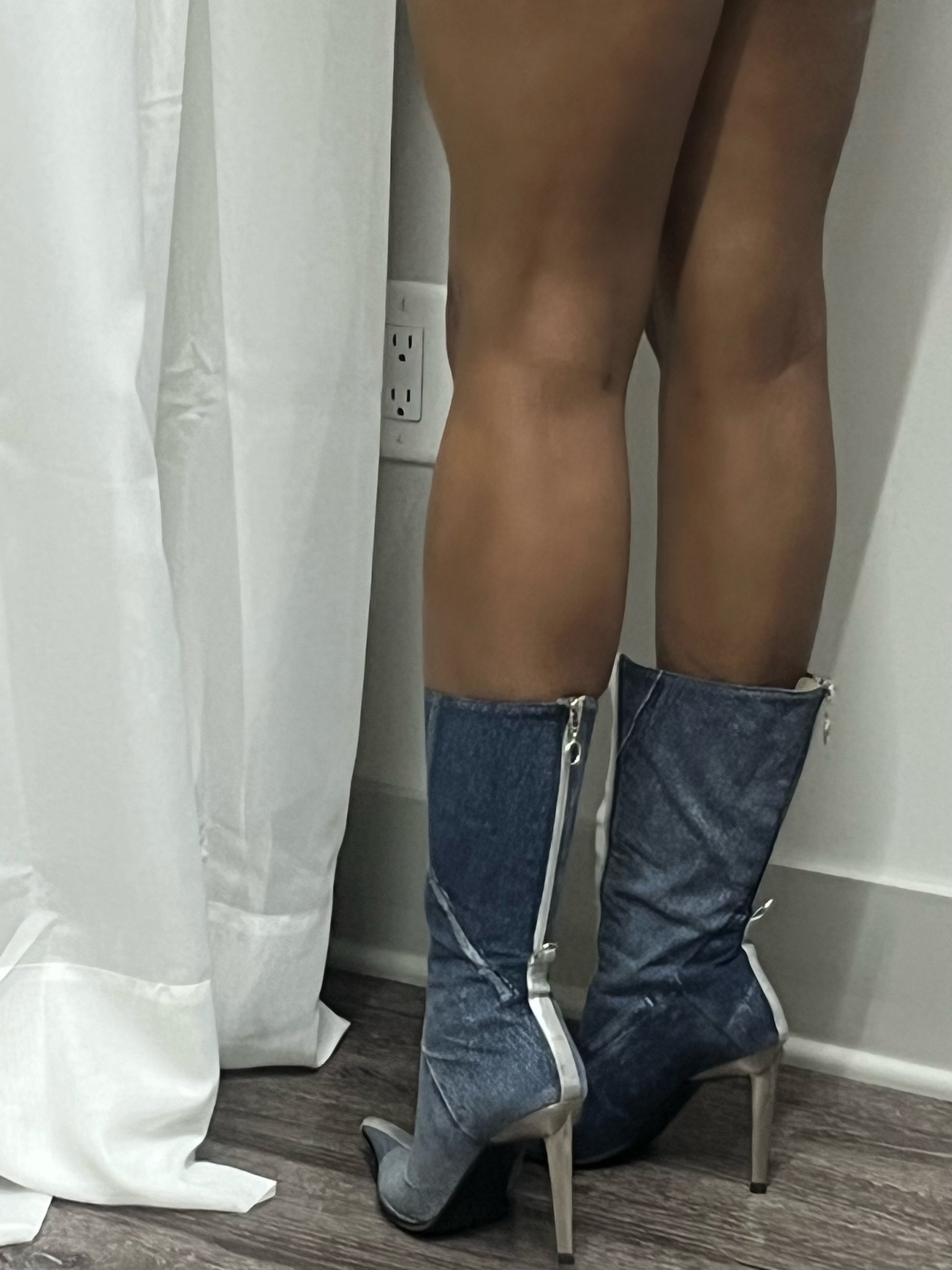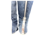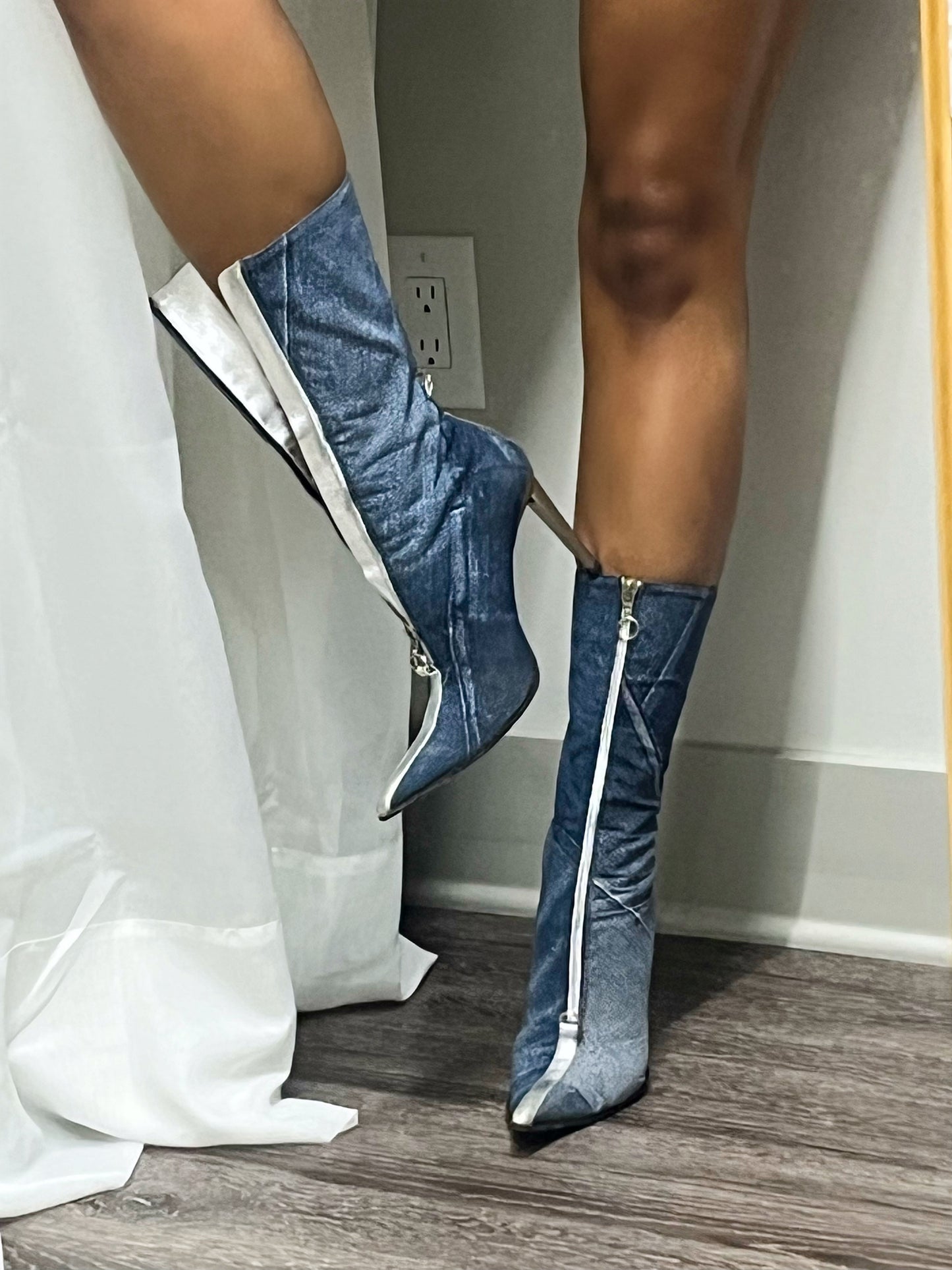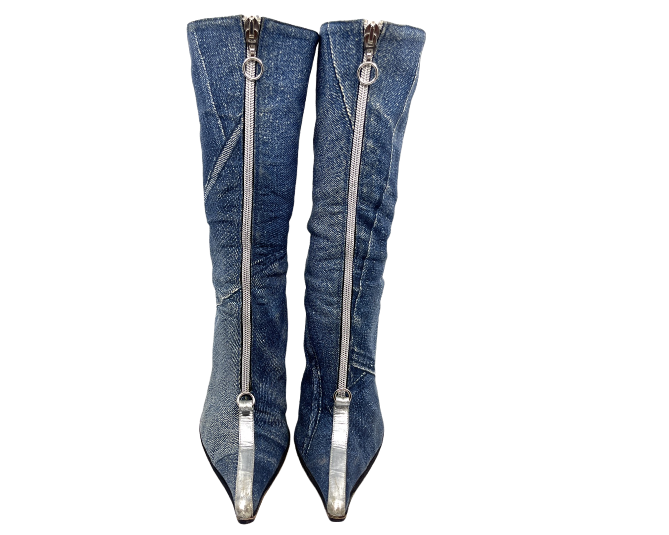 Gianmarco Lorenzi denim bootie with silver zippers. *Signs of wear throughout, does not take away from the beauty of these shoes. 4 inch heel