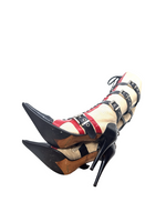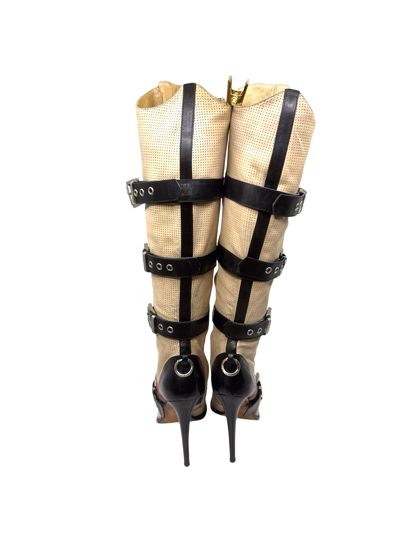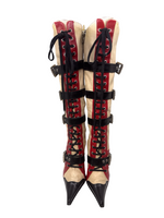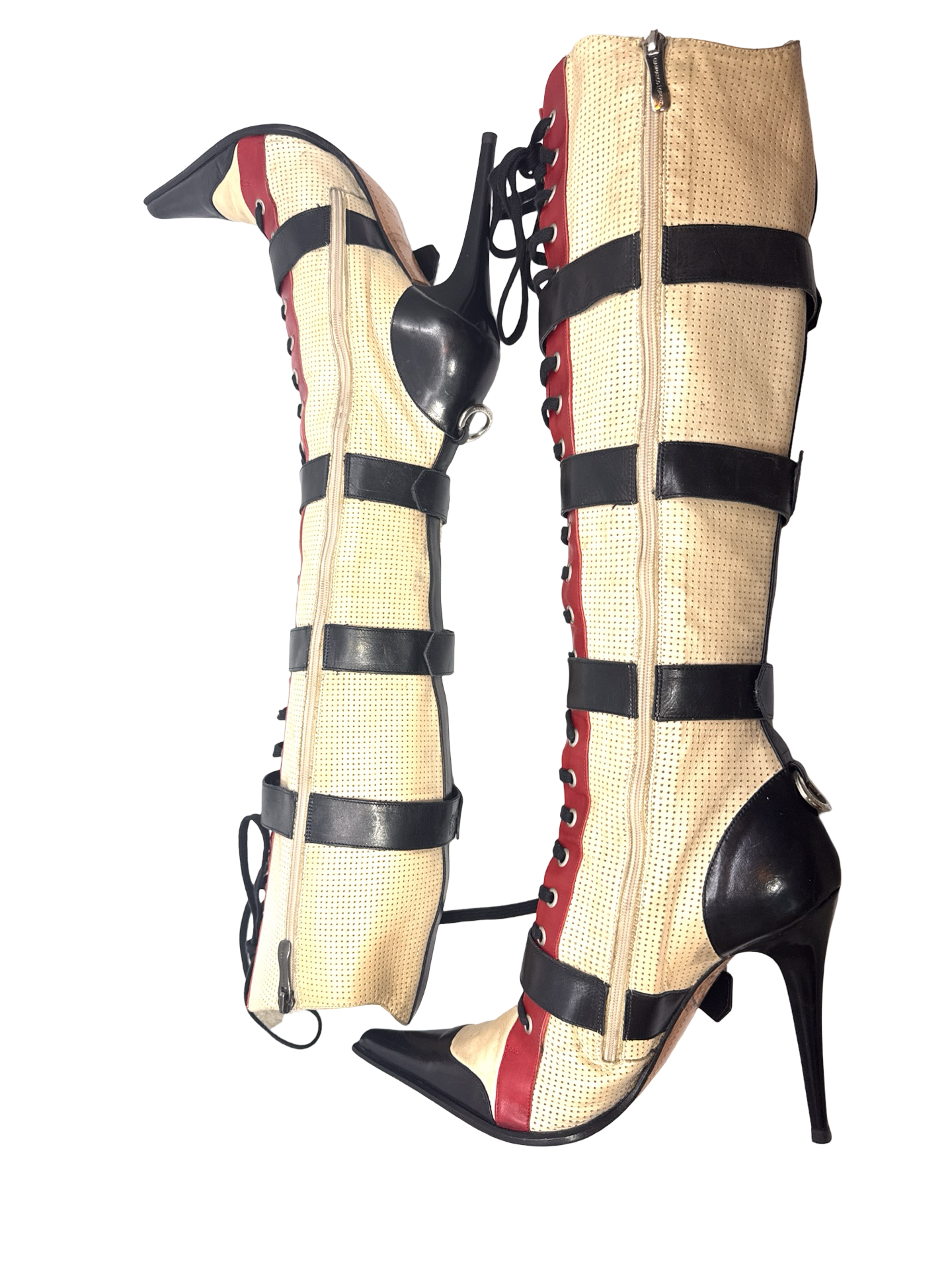 Gianmarco Lorenzi knee high tri color buckle boots. In good used condition. Minor signs of wear not obvious when on. 5 inch heel, 14inch calf circumference.
