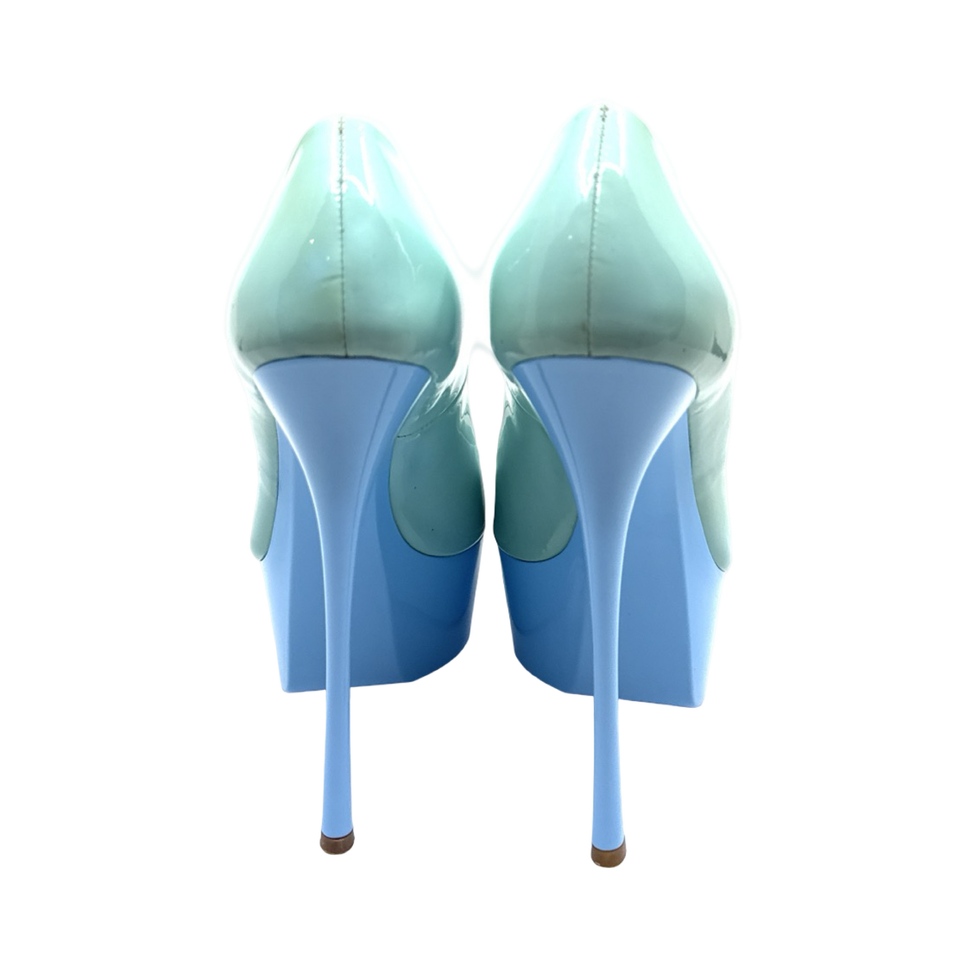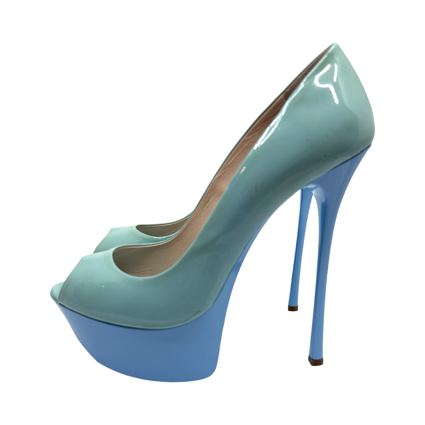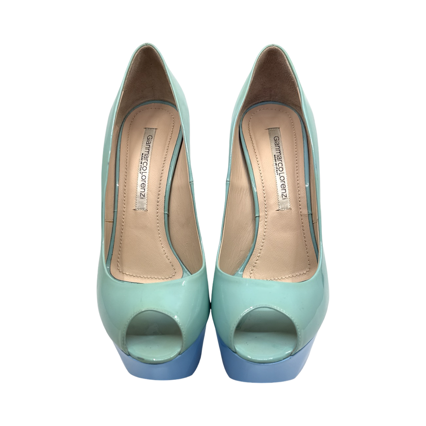 Gianmarco Lorenzi pastel blue peep toe heels. In great gently used condition. Minor discoloration as pictured not obvious when on. 6 inch heel