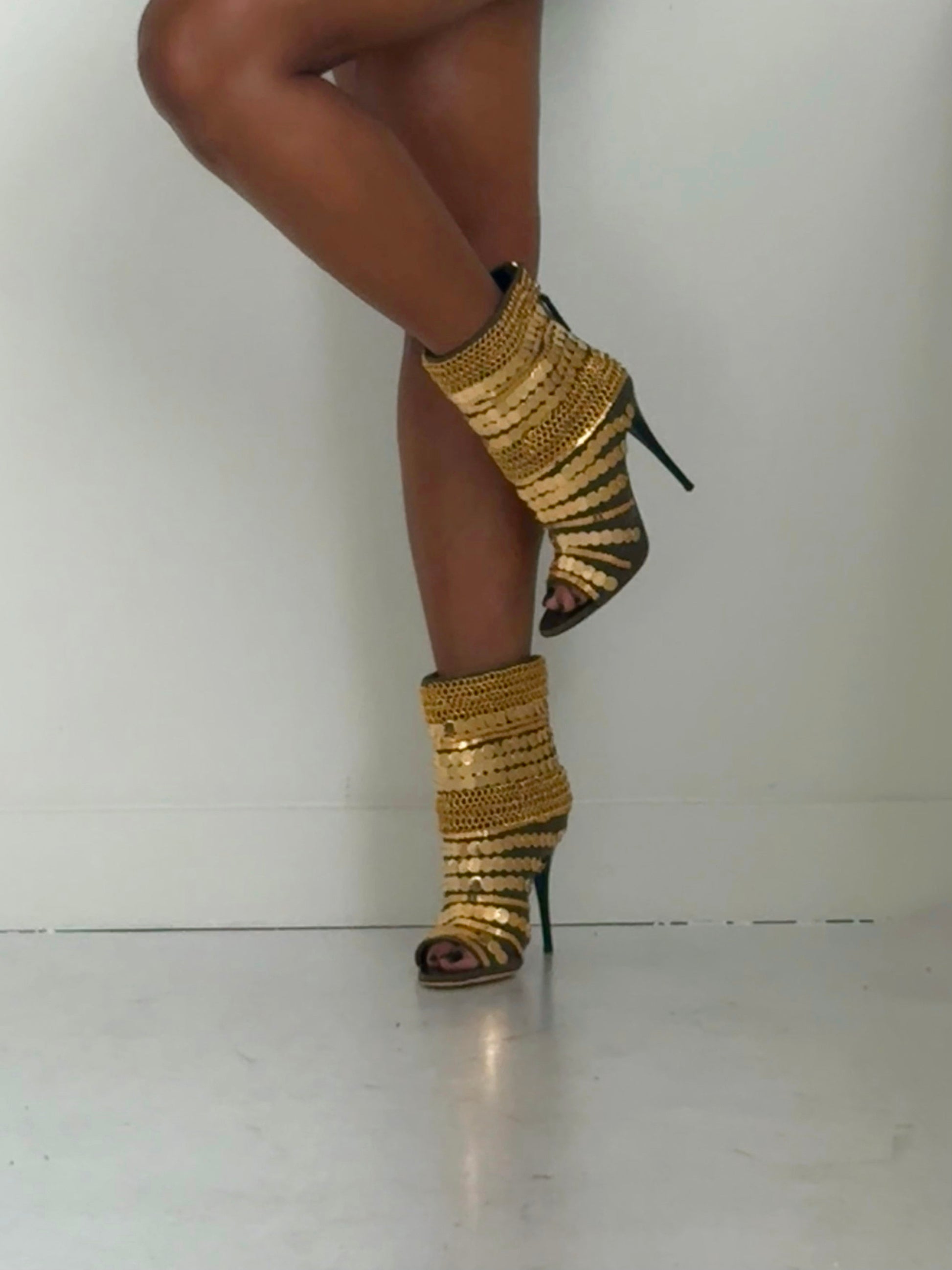 Giuseppe Zanotti army green peep toe booties with gold embellishments. In excellent gently used condition, 4.5 inch heel.