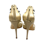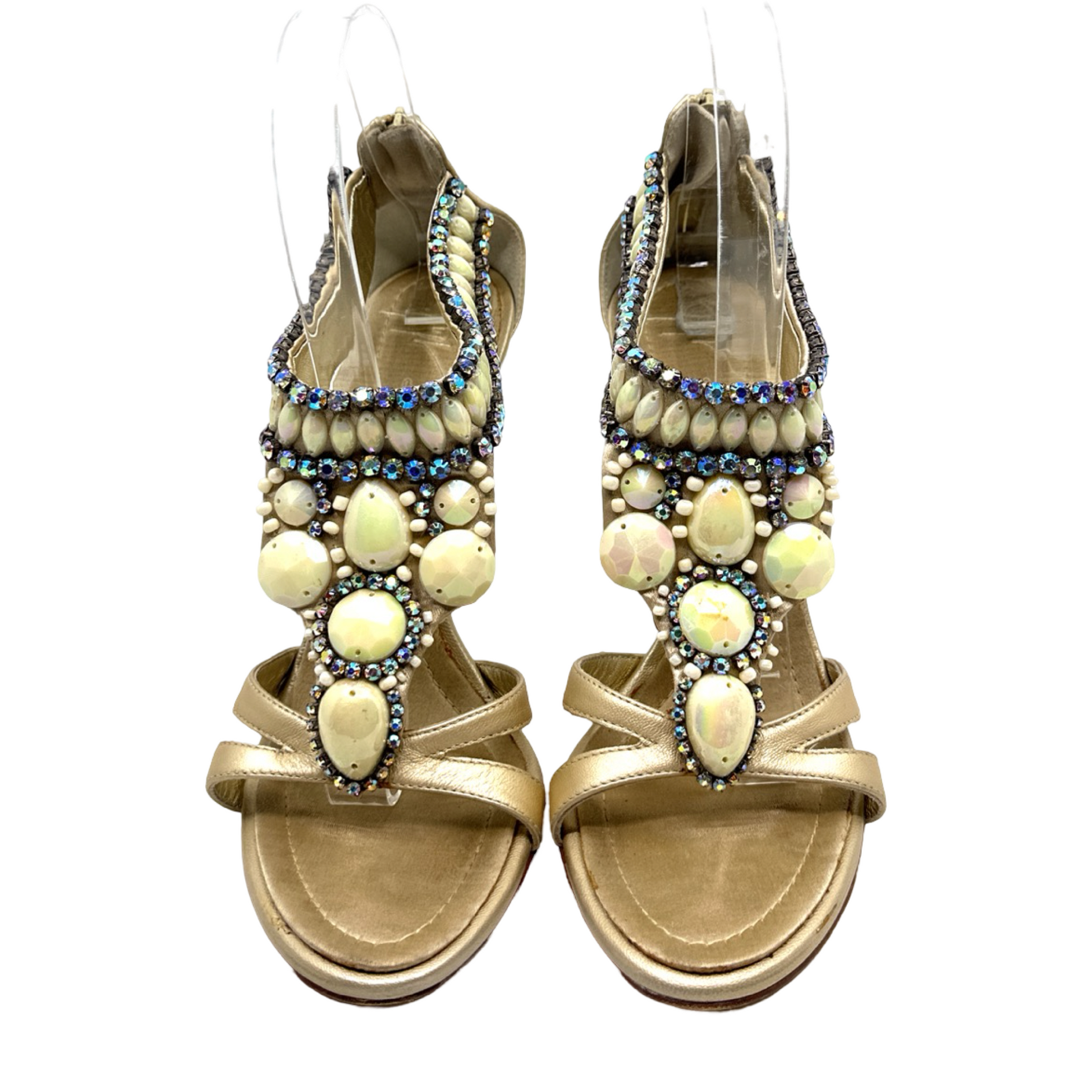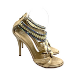 Giuseppe Zanotti jeweled champagne leather jeweled sandal. In good used condition. Minor signs of wear throughout not obvious when on. 4 inch heel. *Styled with removable braided feather necklace