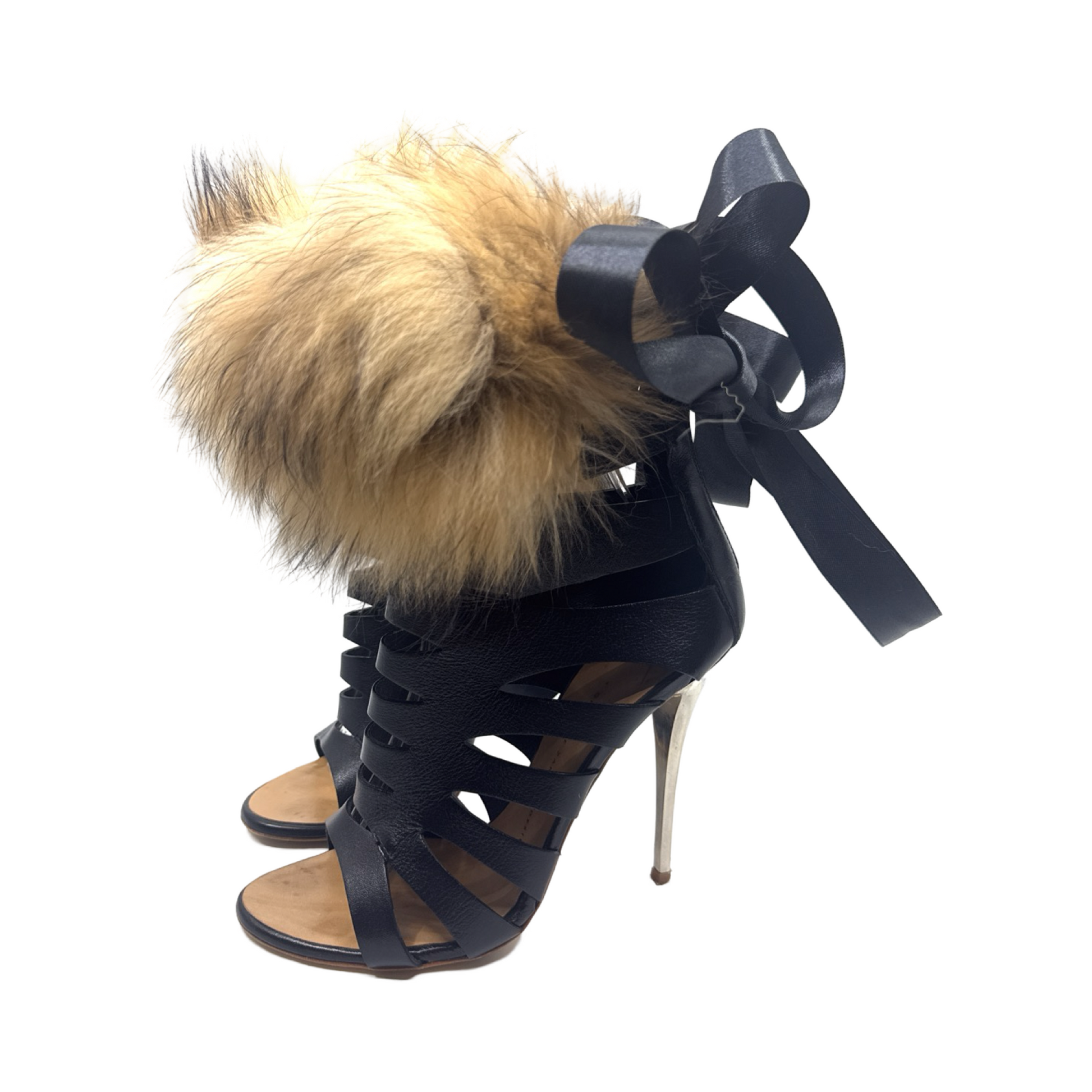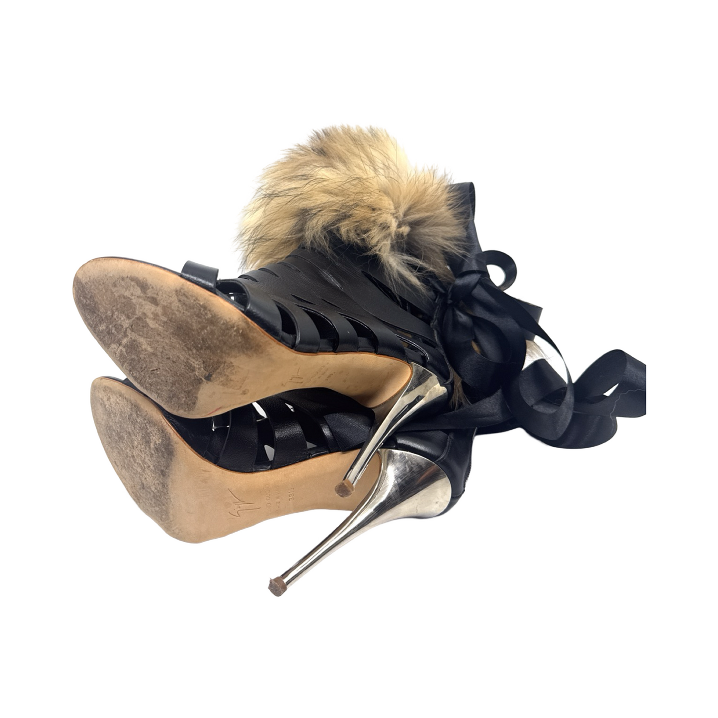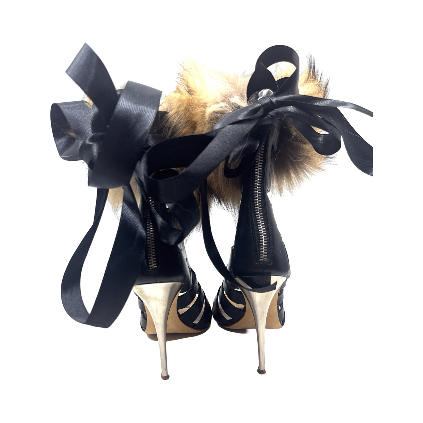 Cut out leather booties. Comes with Shoe Slutz fur anklet. In excellent gently used condition, 4.5 inch heel.