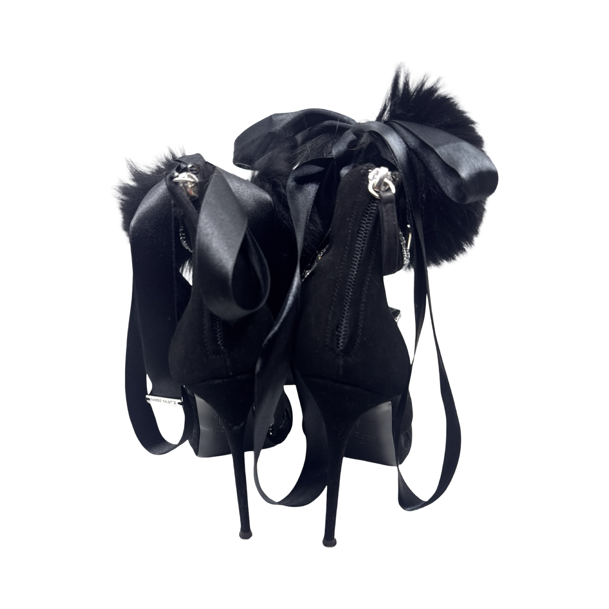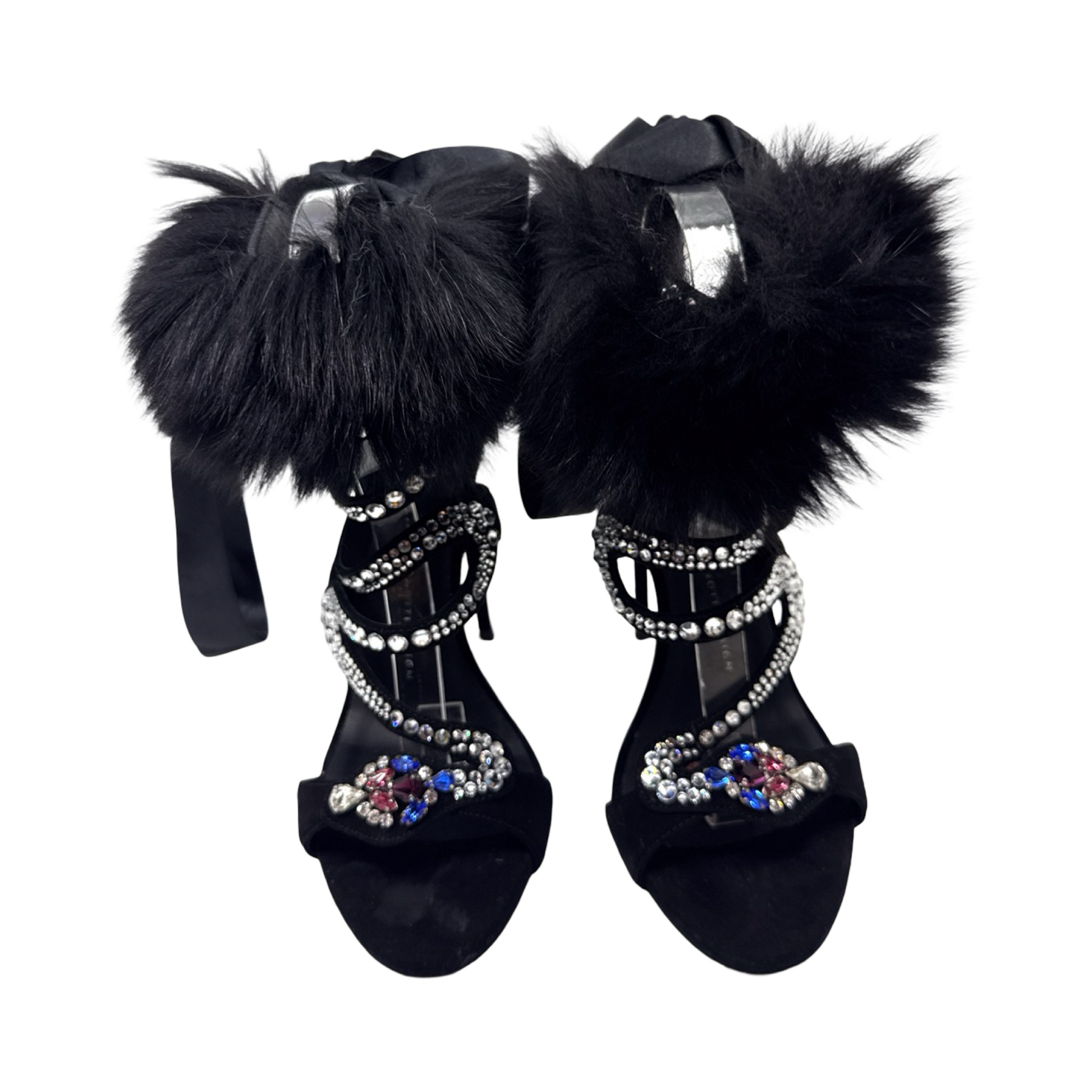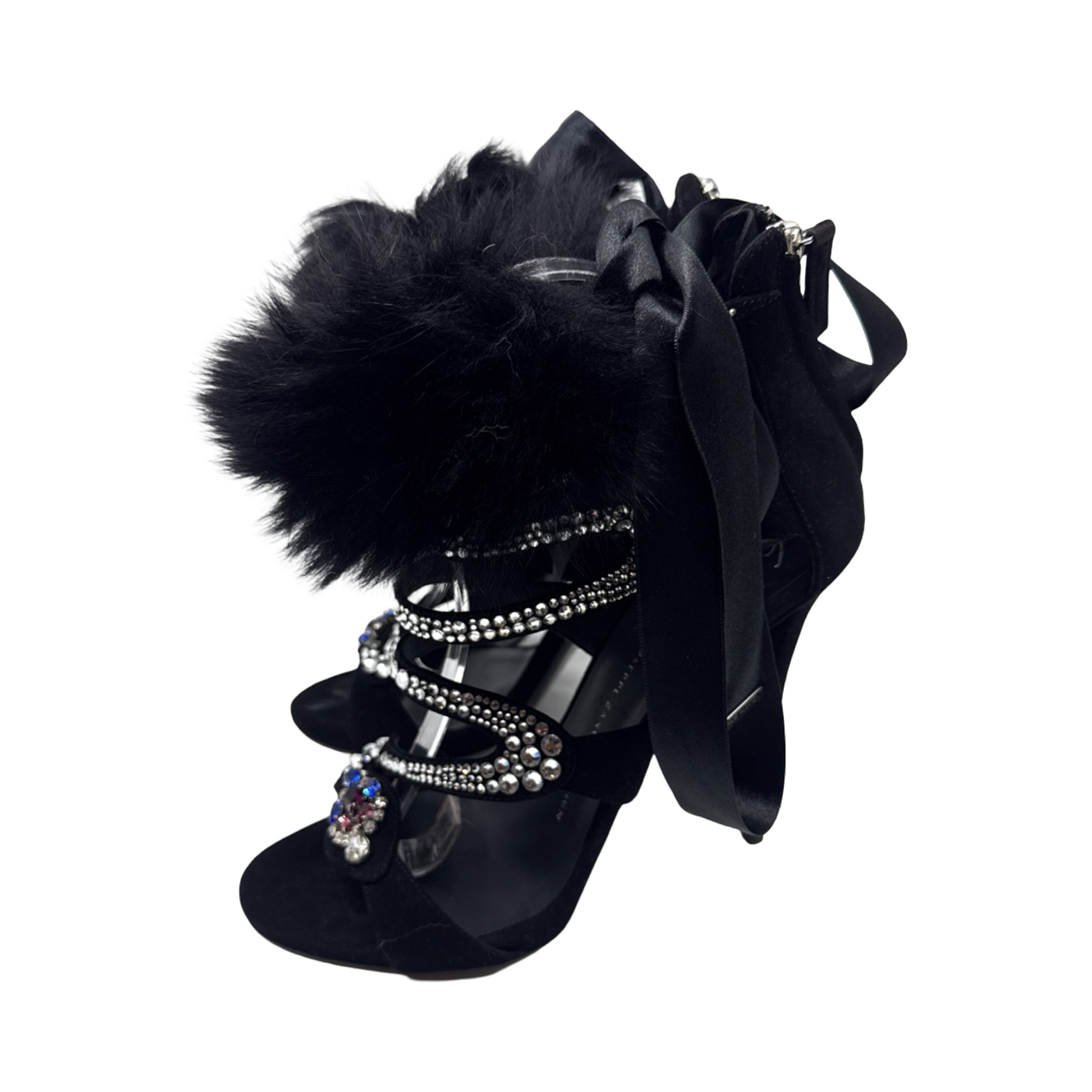 Giuseppe Zanotti black jewel encrusted spiral sandal with Shoe Slutz black fur anklet. In excellent condition , 5 inch heel.