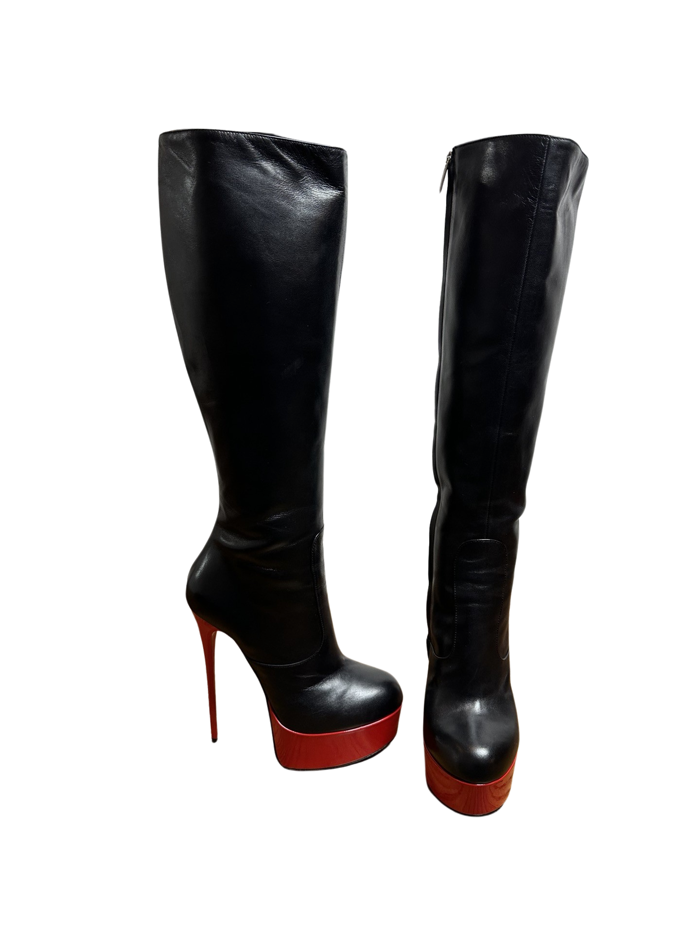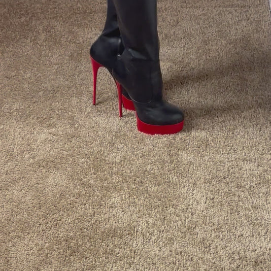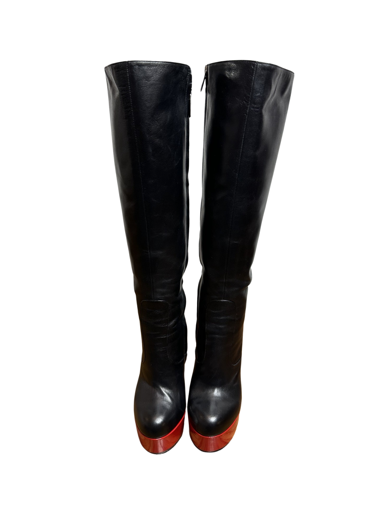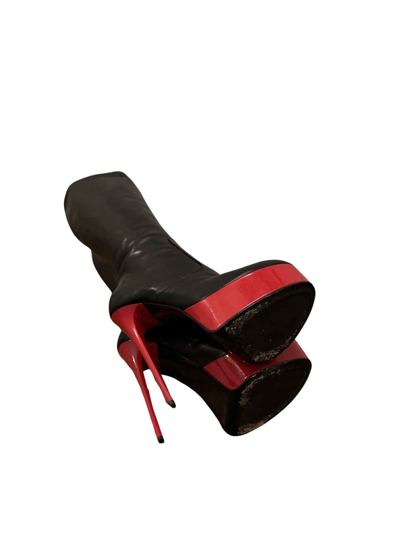 Fine Italian black leather round toe boots with red platform and ultra high spiked heel. In excellent used condition. 1.5 inch front platform and 6inch heel. 14inch calf circumference.
