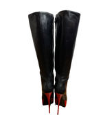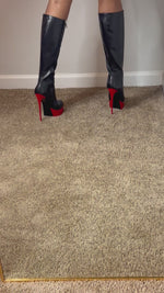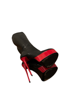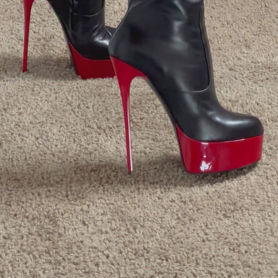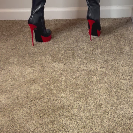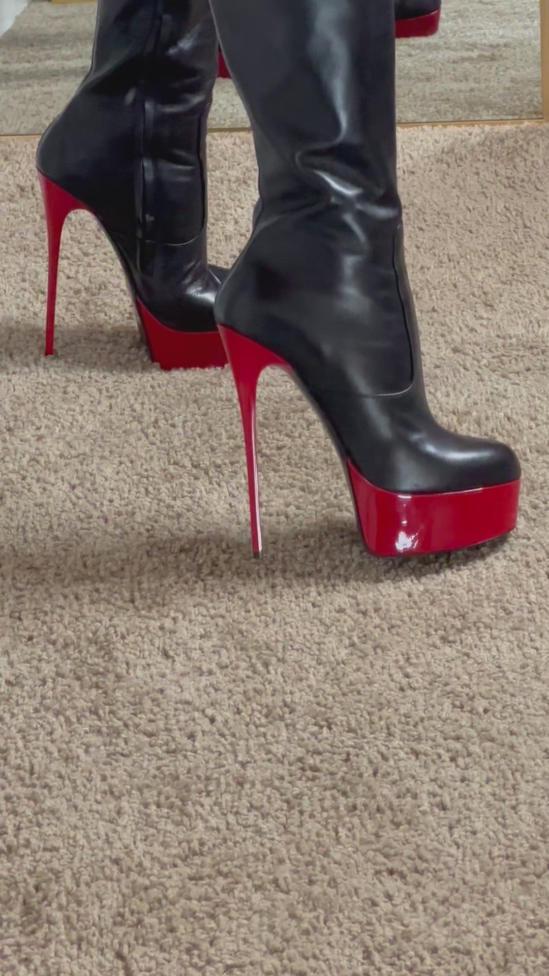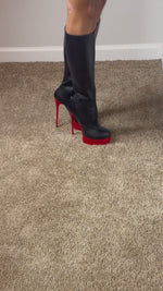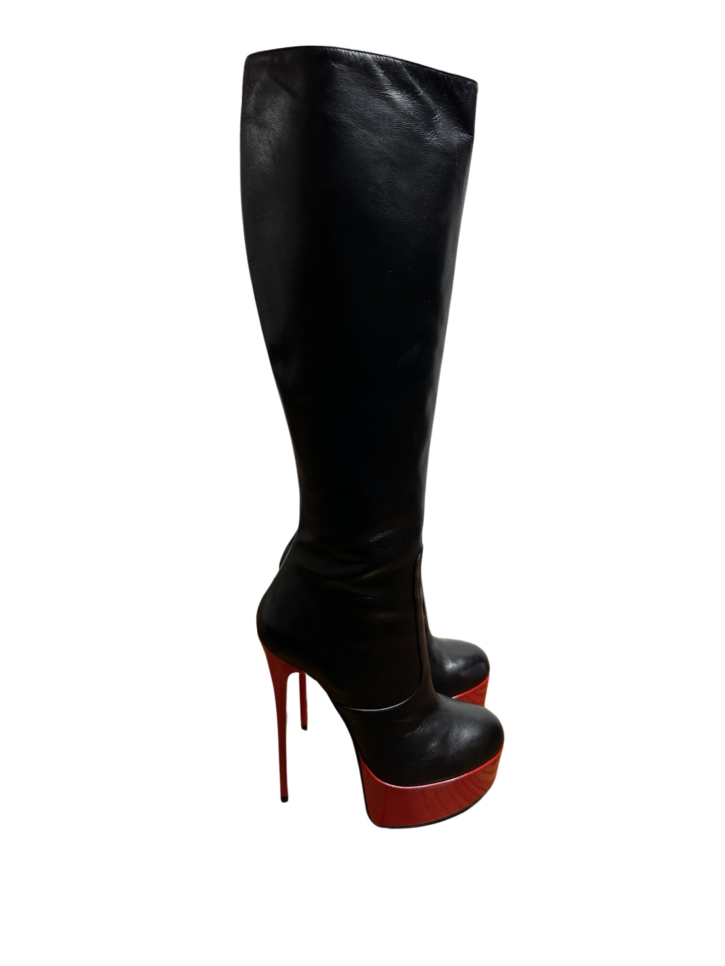 Fine Italian black leather round toe boots with red platform and ultra high spiked heel. In excellent used condition. 1.5 inch front platform and 6inch heel. 14inch calf circumference.
