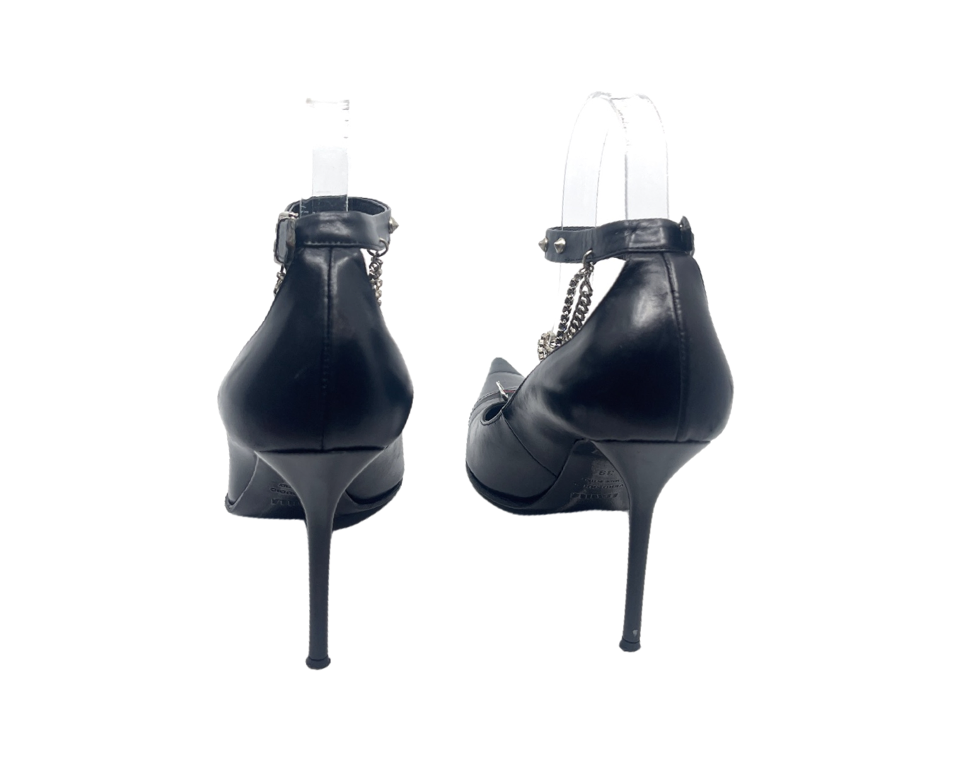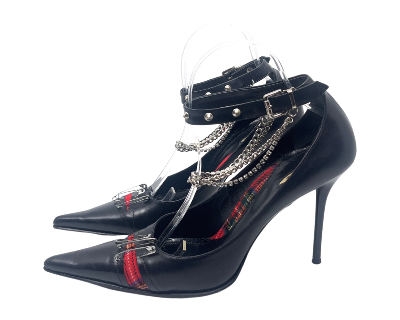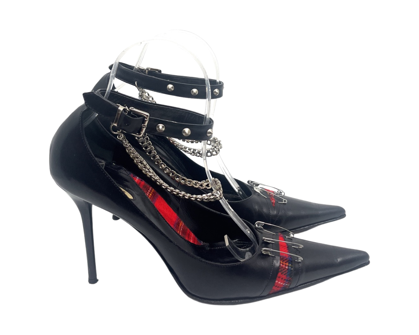 Le Silla punk meets school girl pointed toe pump with black pointed toe pump with chain and safety hardware and red tartan plaid insert.