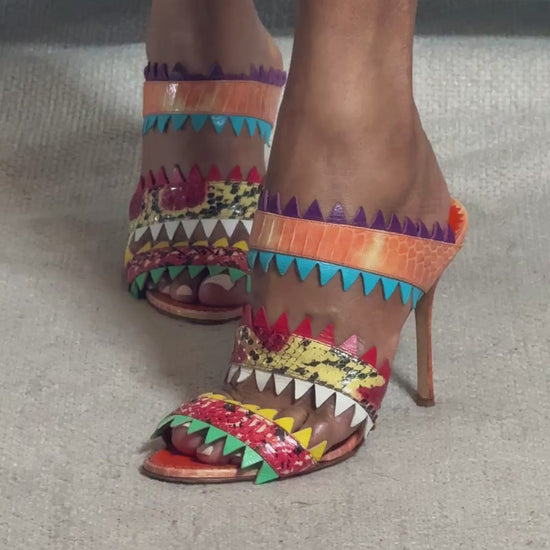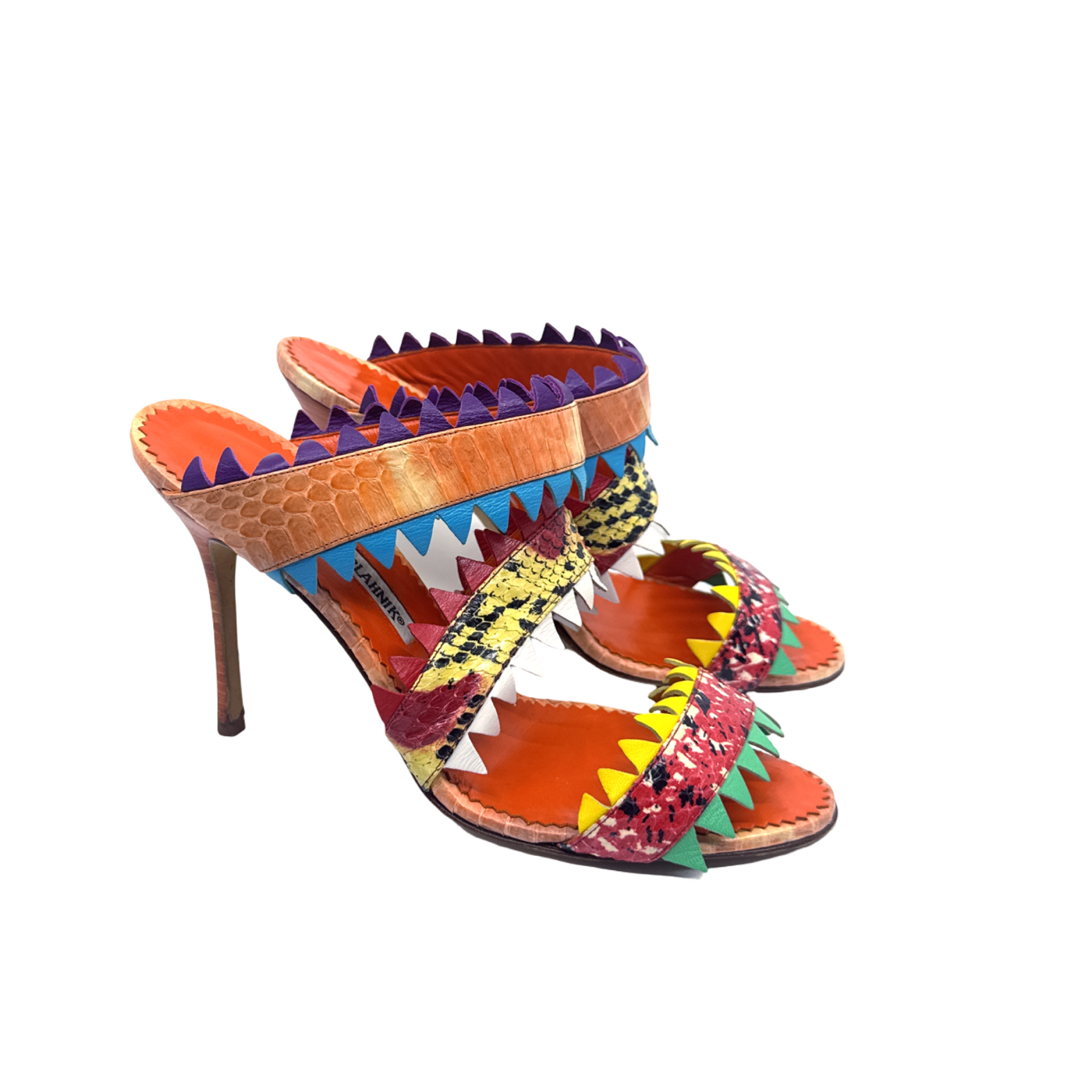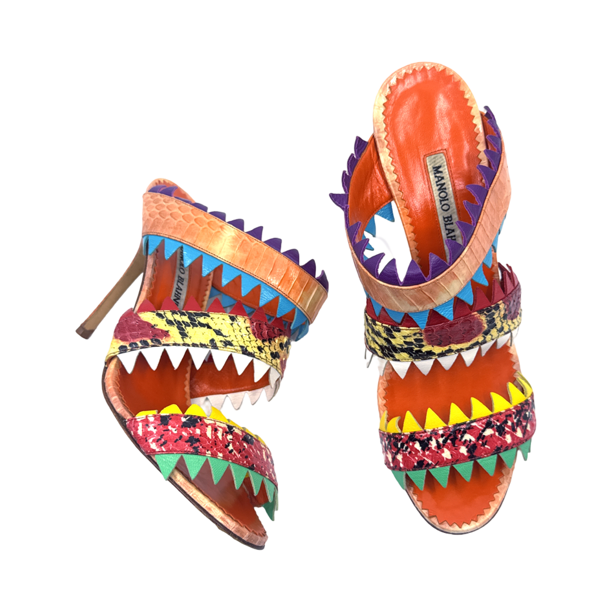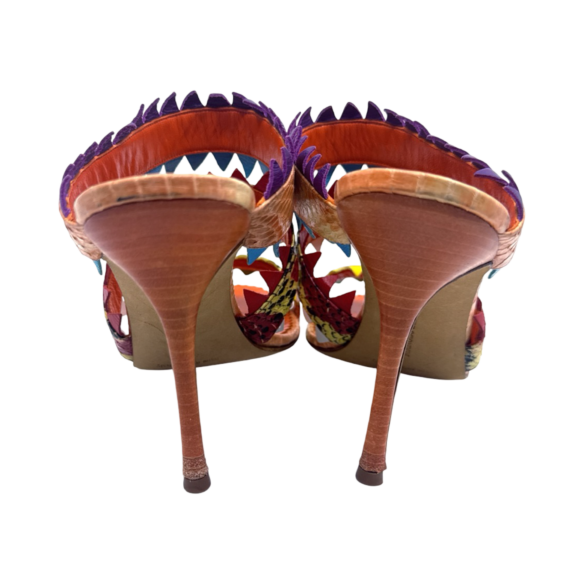 Manolo Blahnik multi colored snakeskin sandals. In great gently used condition, 4 inch heel.