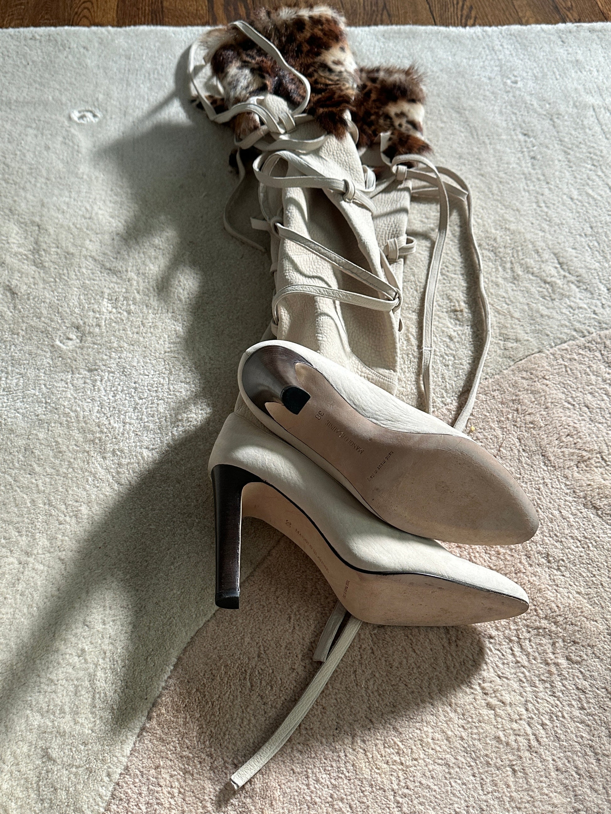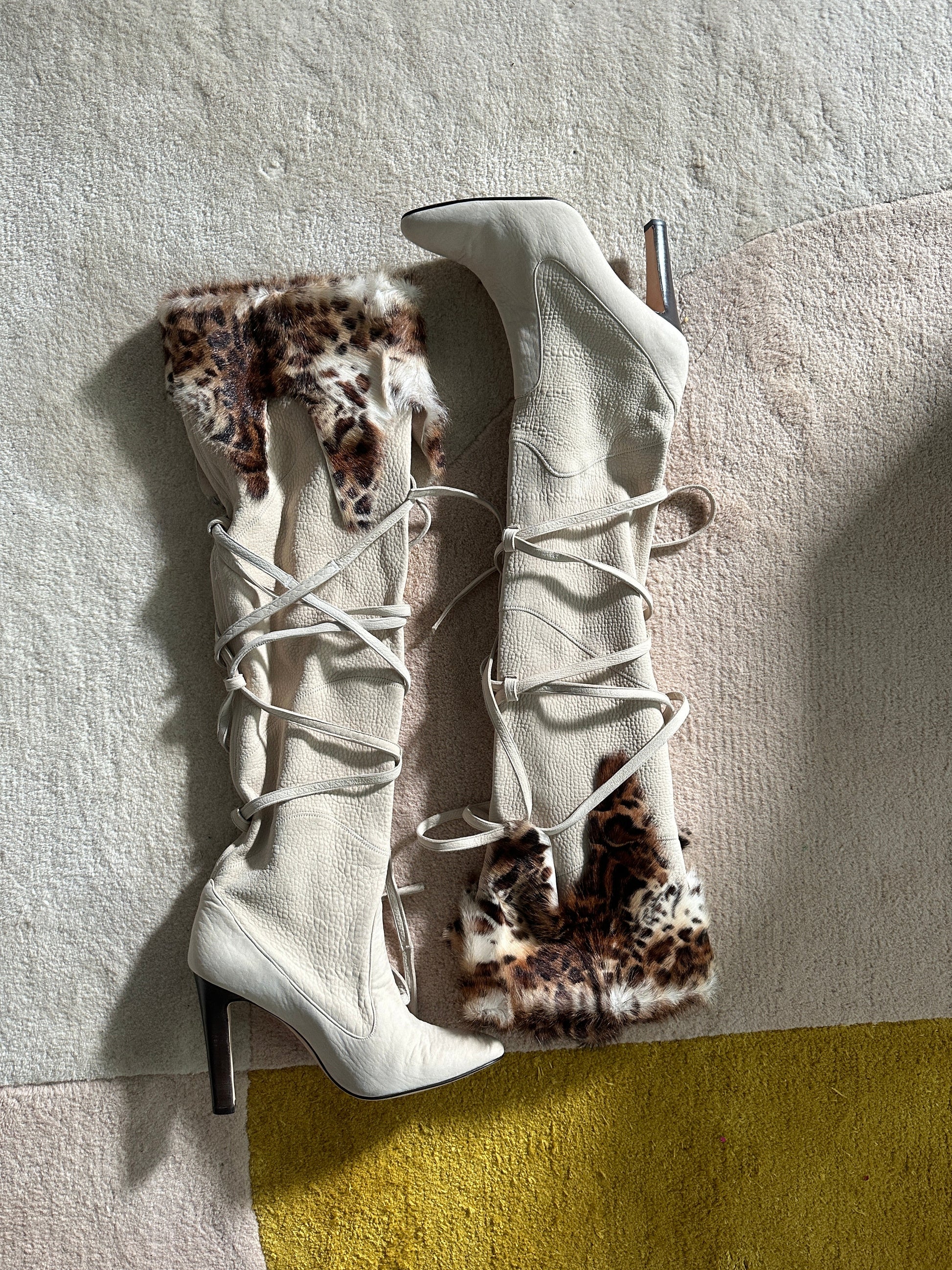Manolo Blahnik Ivory buttery smooth leather pull on over the knee boot with fold over raw edge pony hair leopard print. In excellent unworn condition. 5inch heel, 18inch calf circumference.