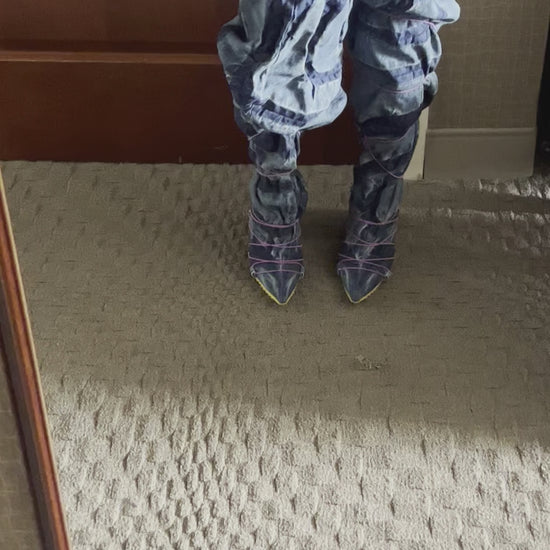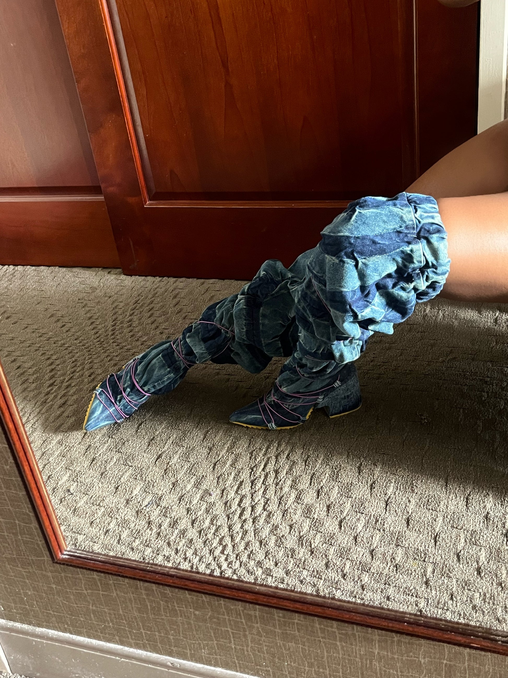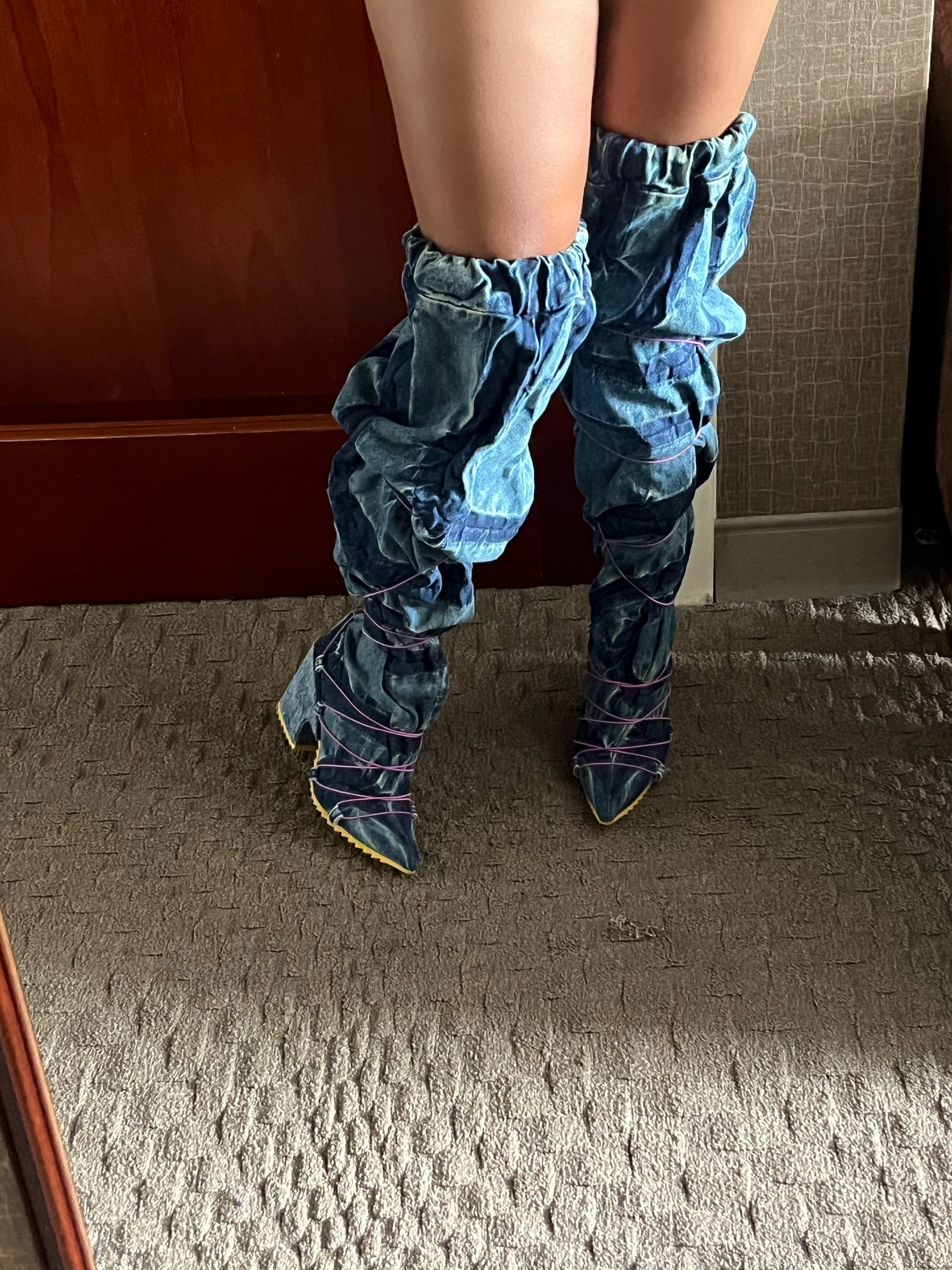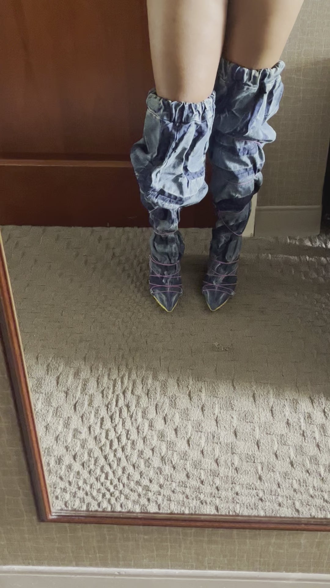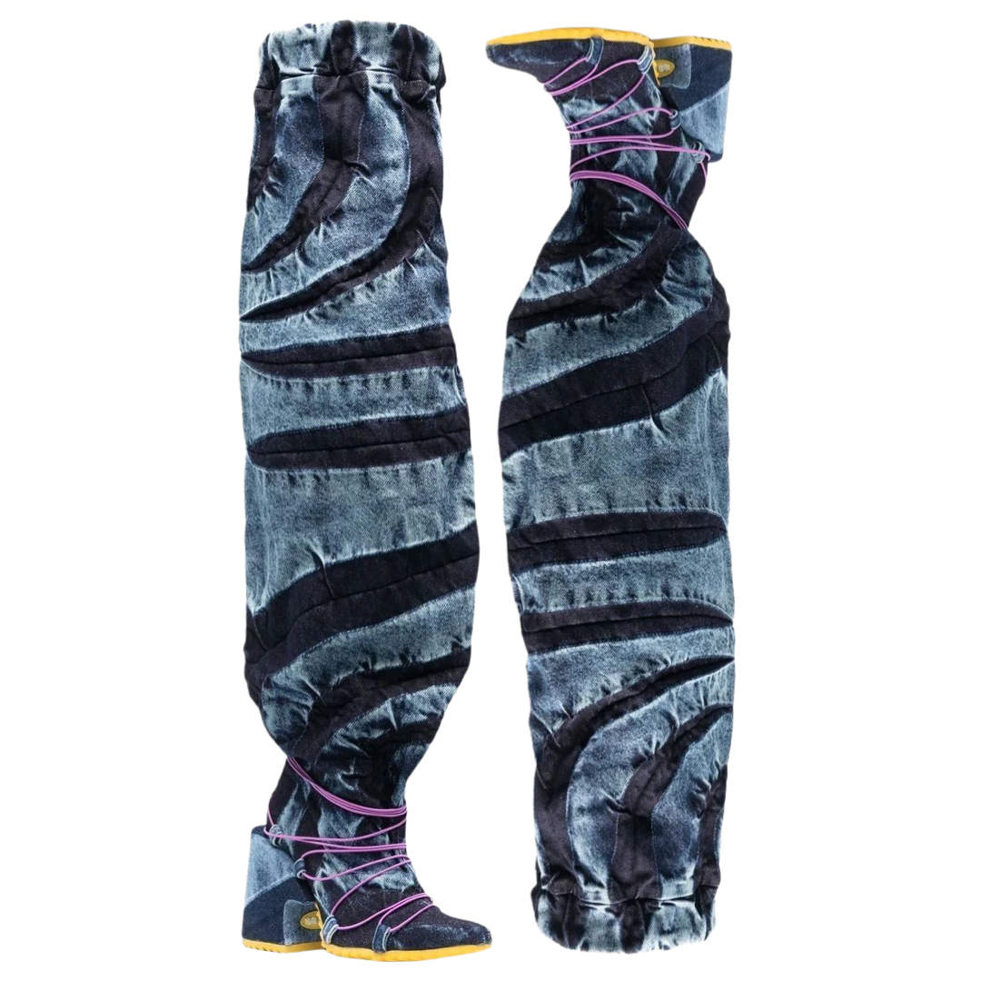 Masha Popova Tie Dye denim thigh high boots with elastic that offers various styling options. *Sold out in Sz 40 excellent condition