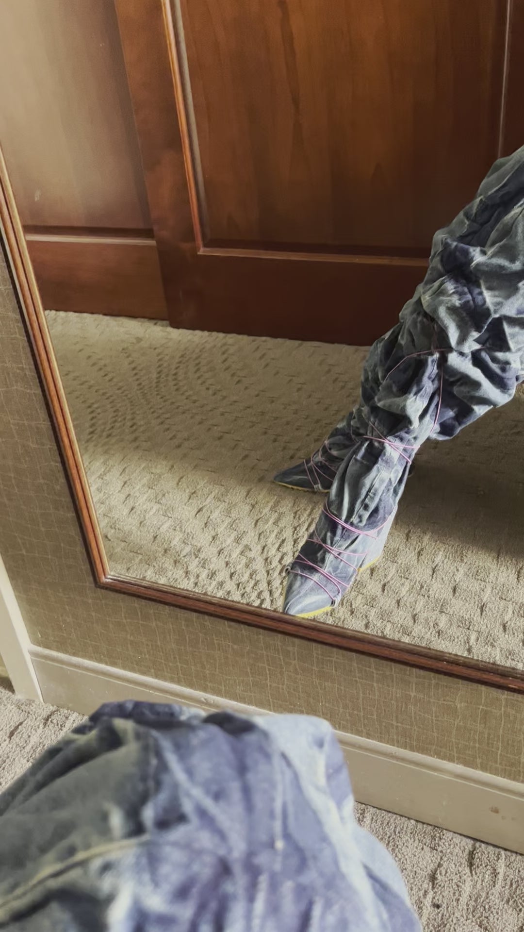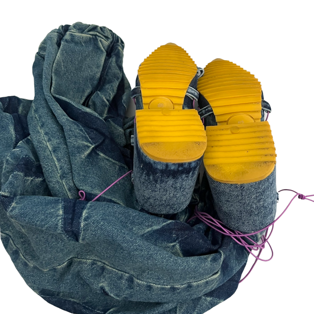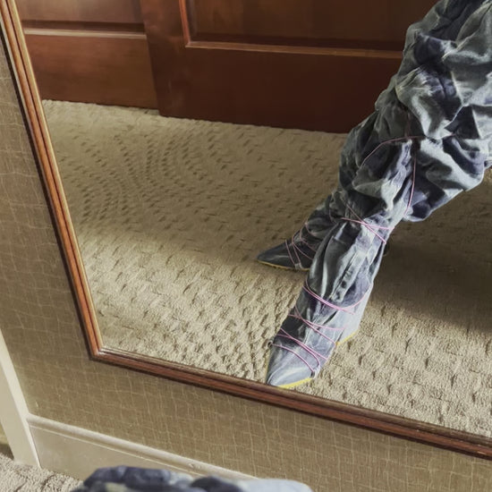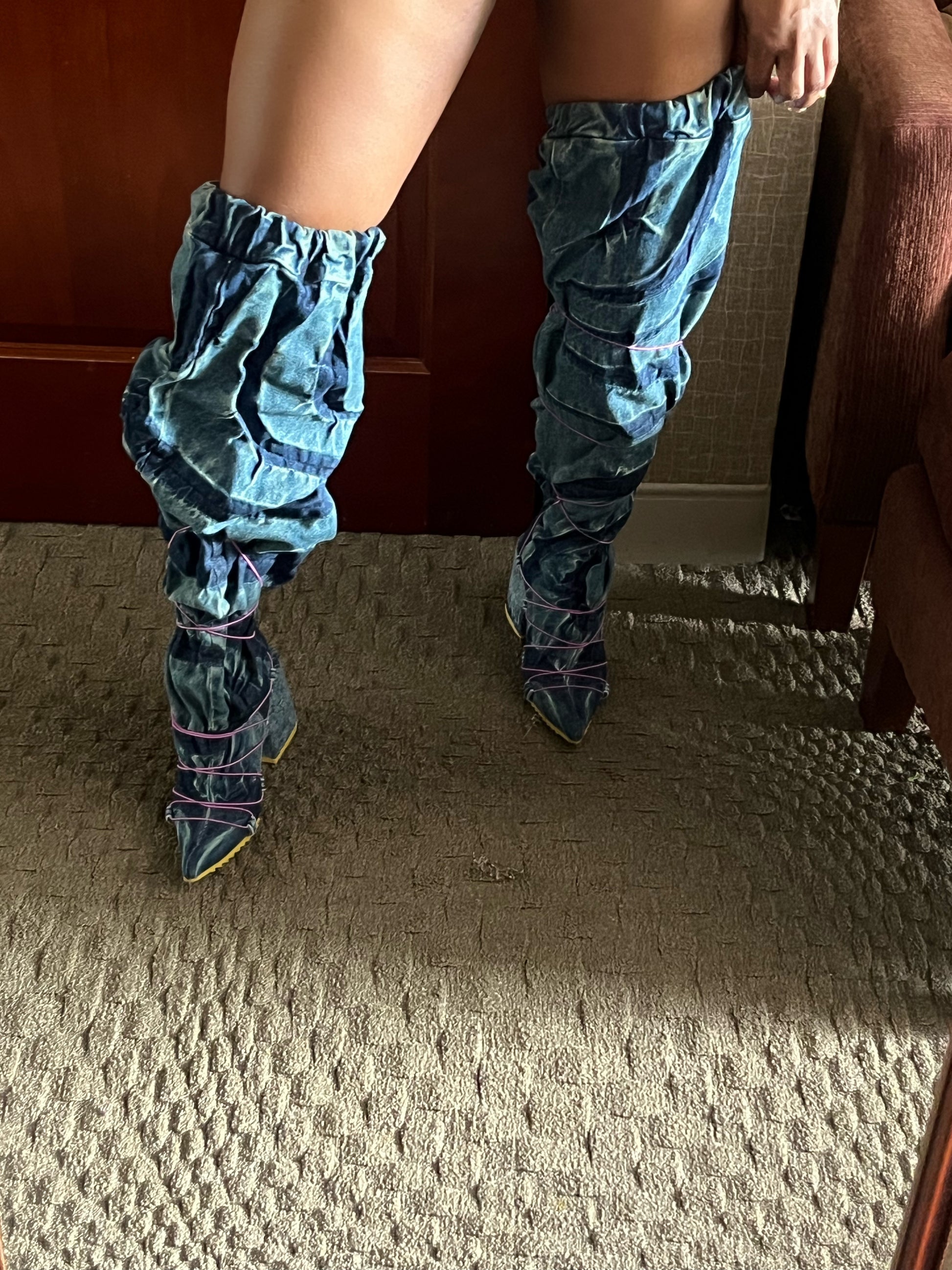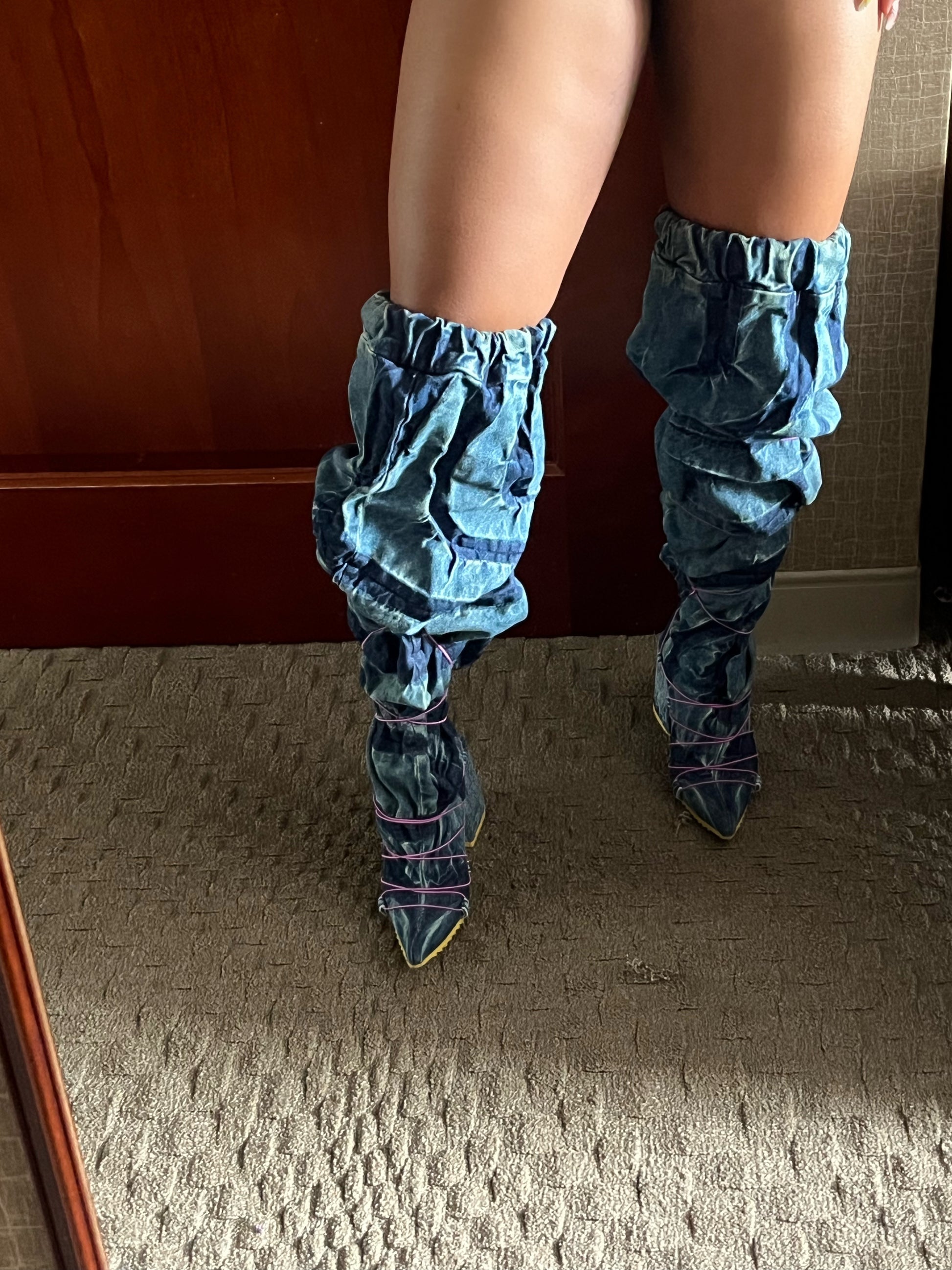 Masha Popova Tie Dye denim thigh high boots with elastic that offers various styling options. *Sold out in Sz 40 excellent condition