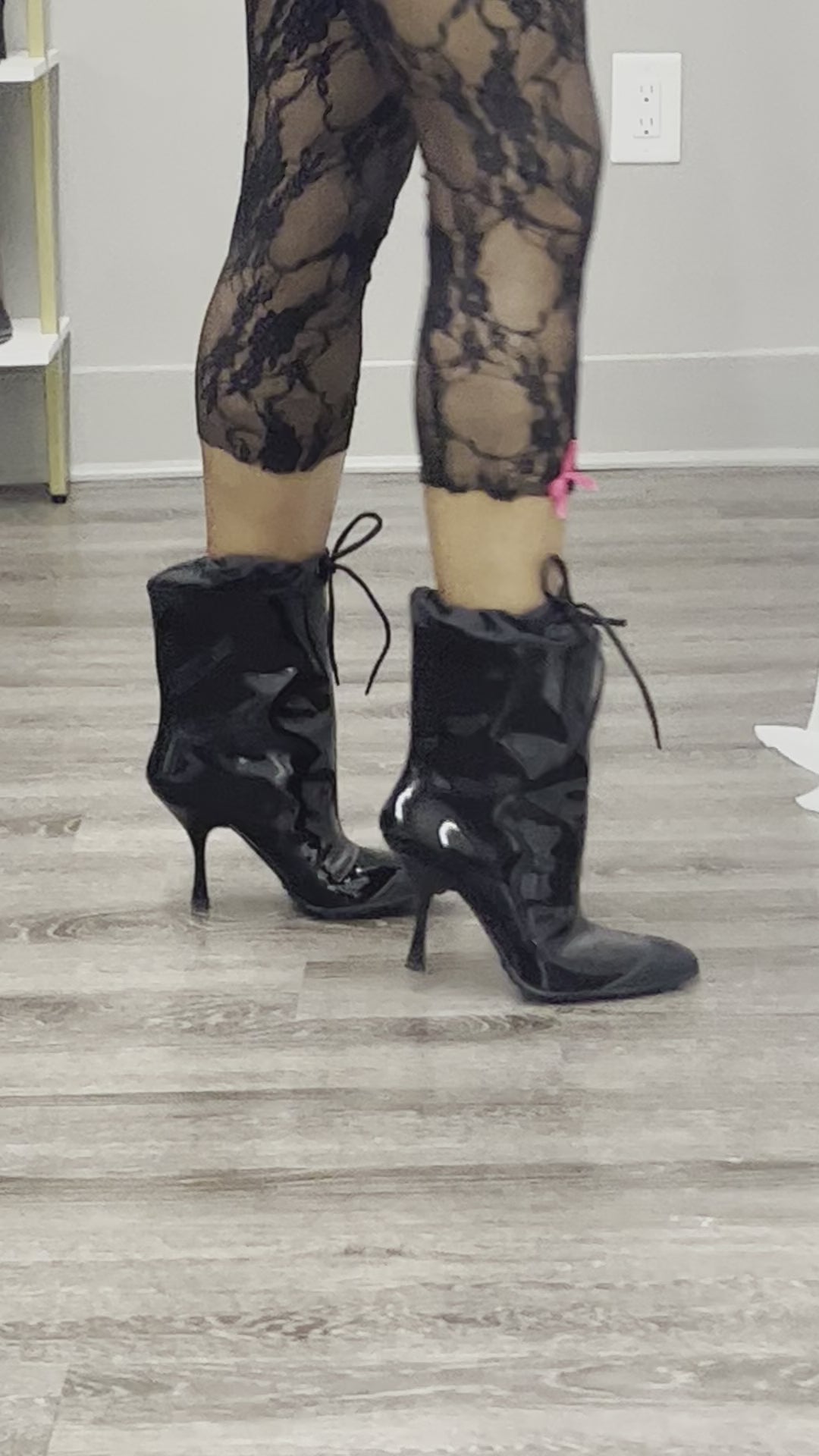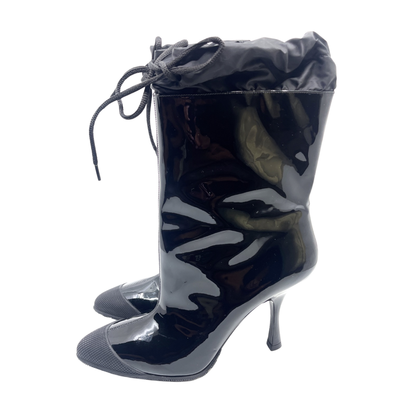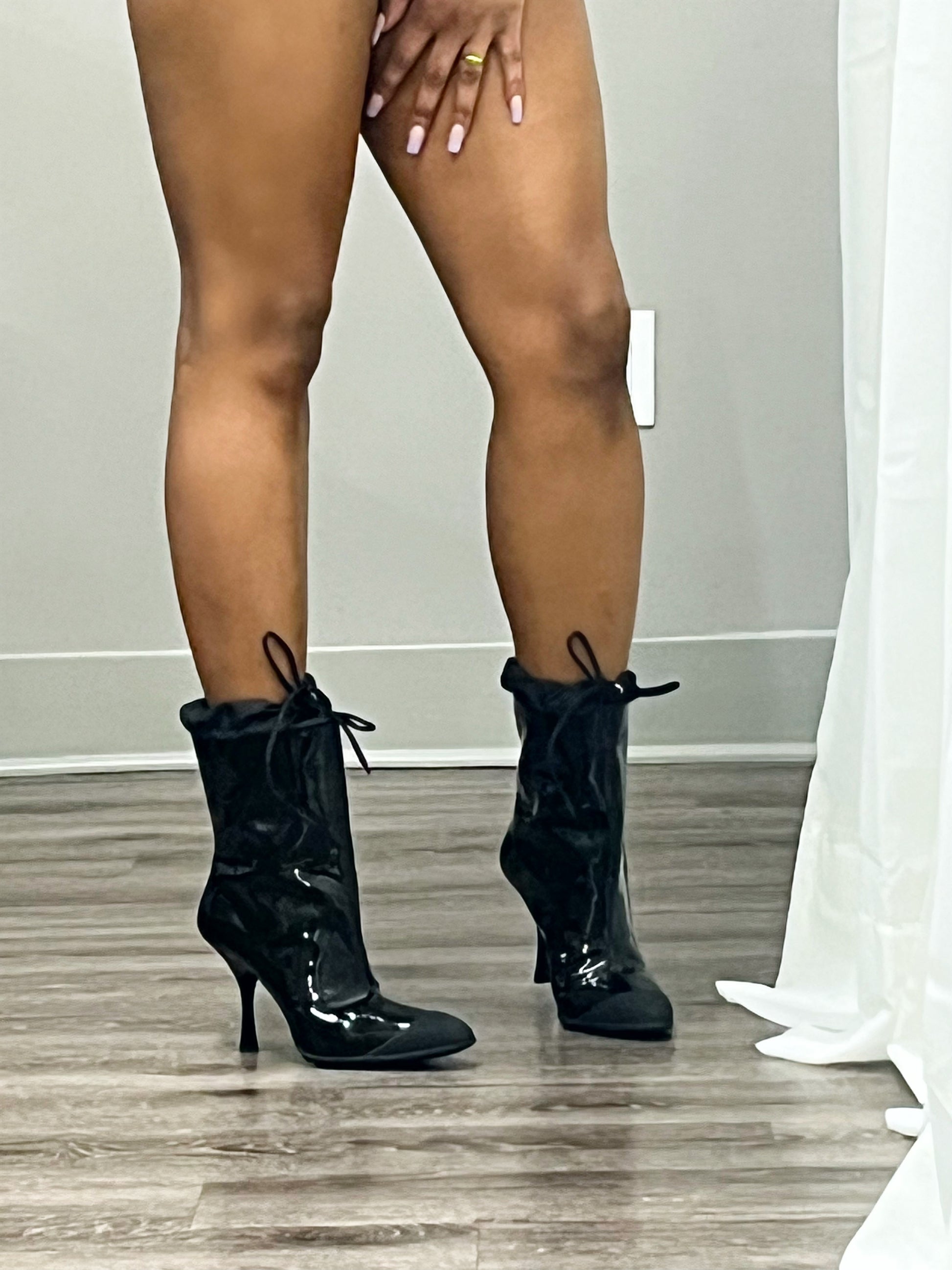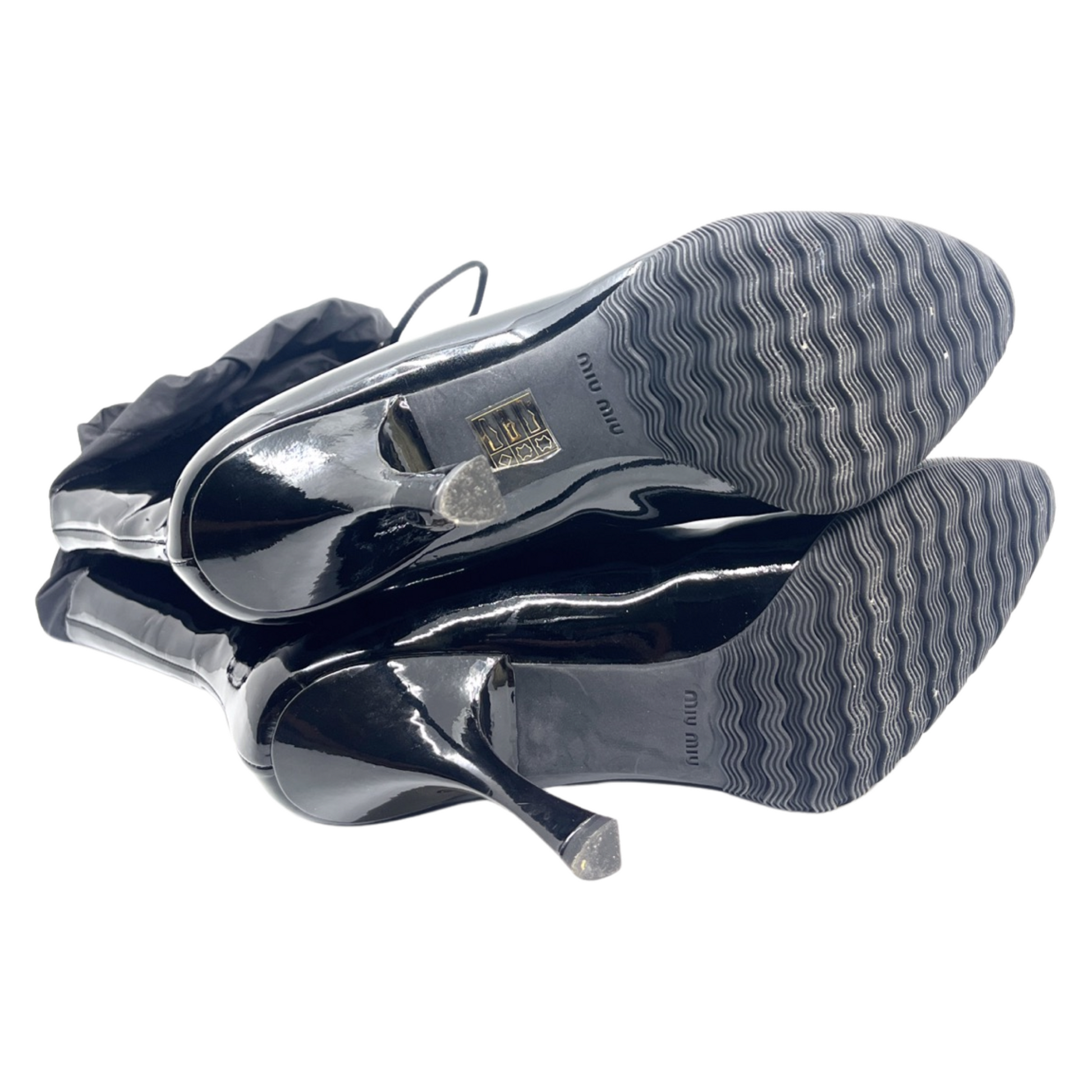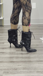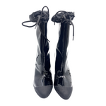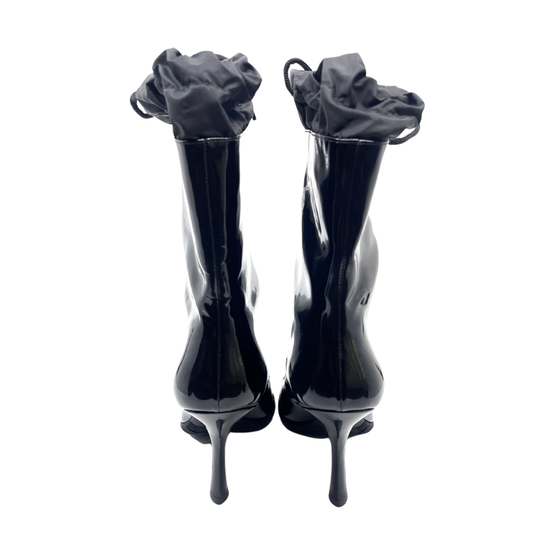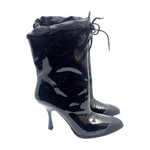 Miu Miu brand new black patent leather booties with drawstring tie detail and rubber front.