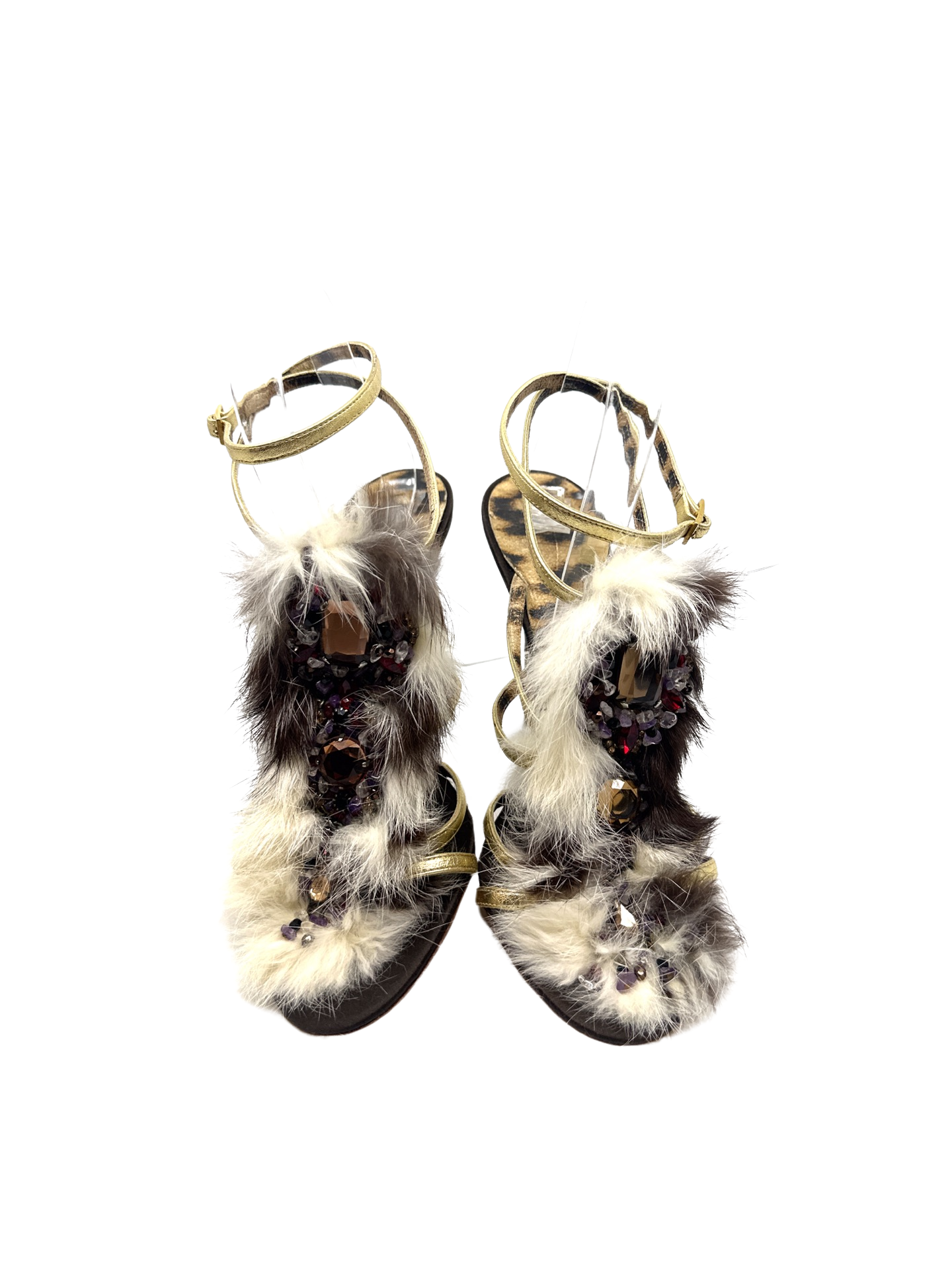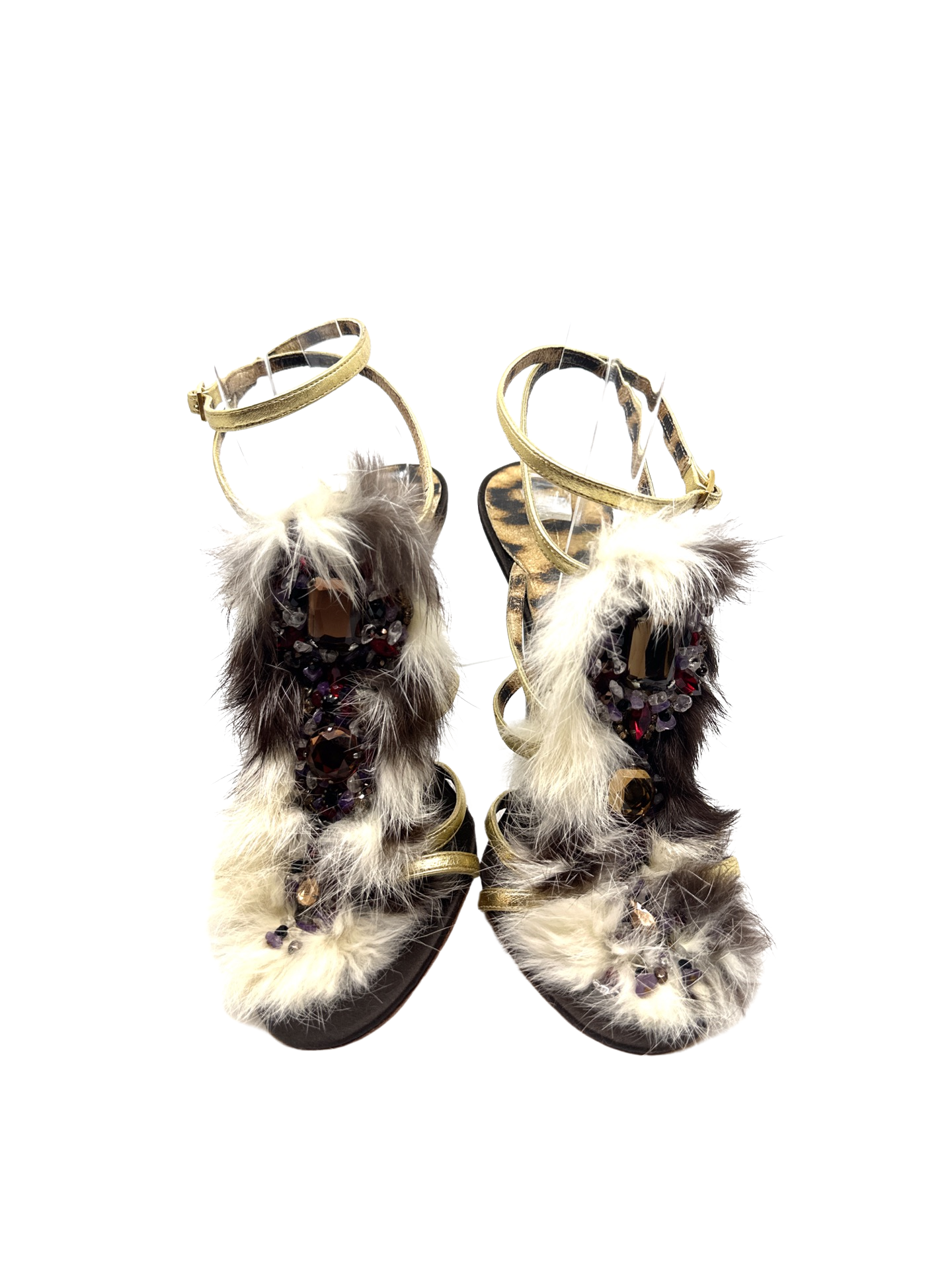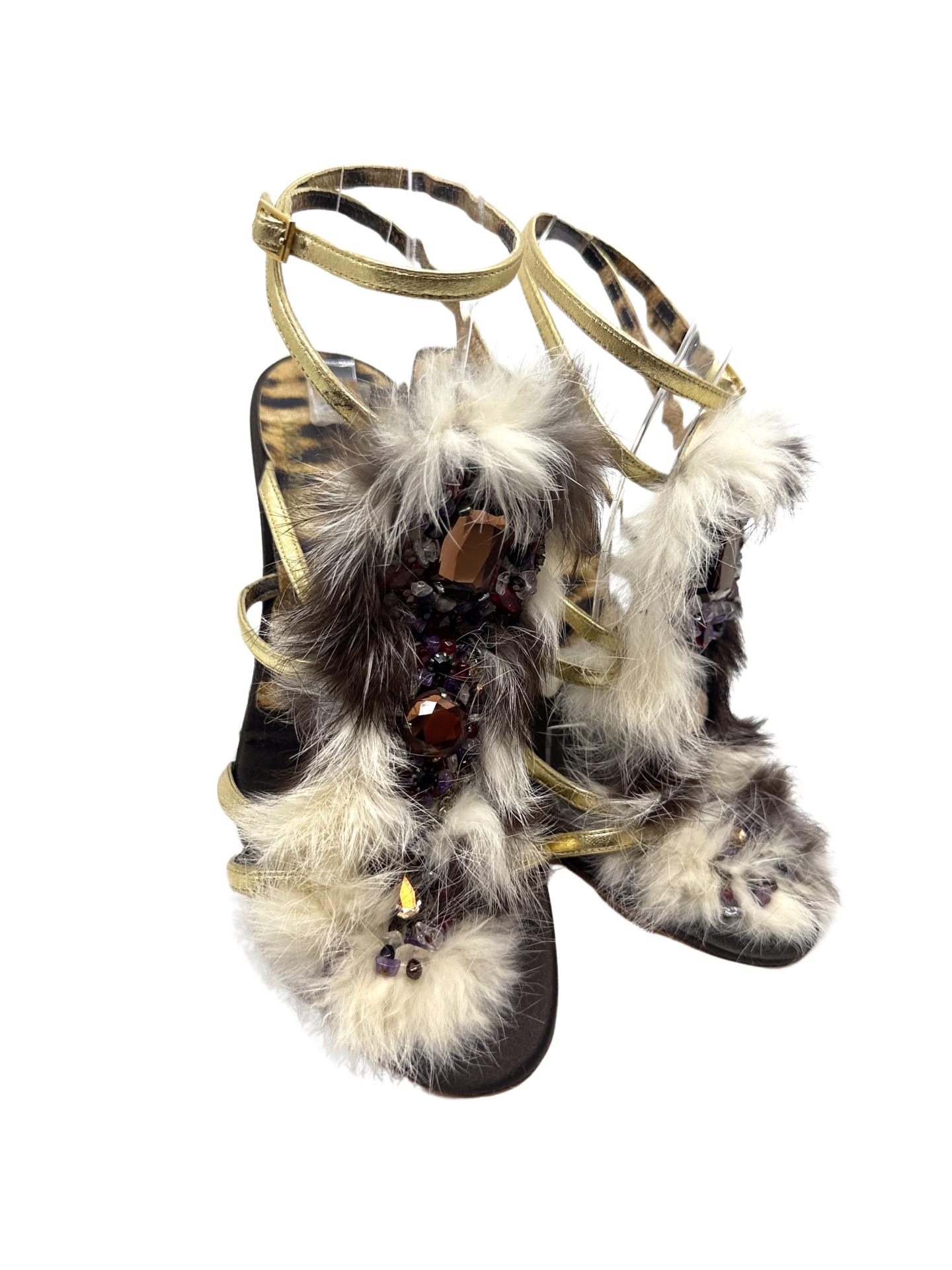Stunning Roberto Cavalli jeweled fur sandals in excellent condition 4.5 inch heel height.