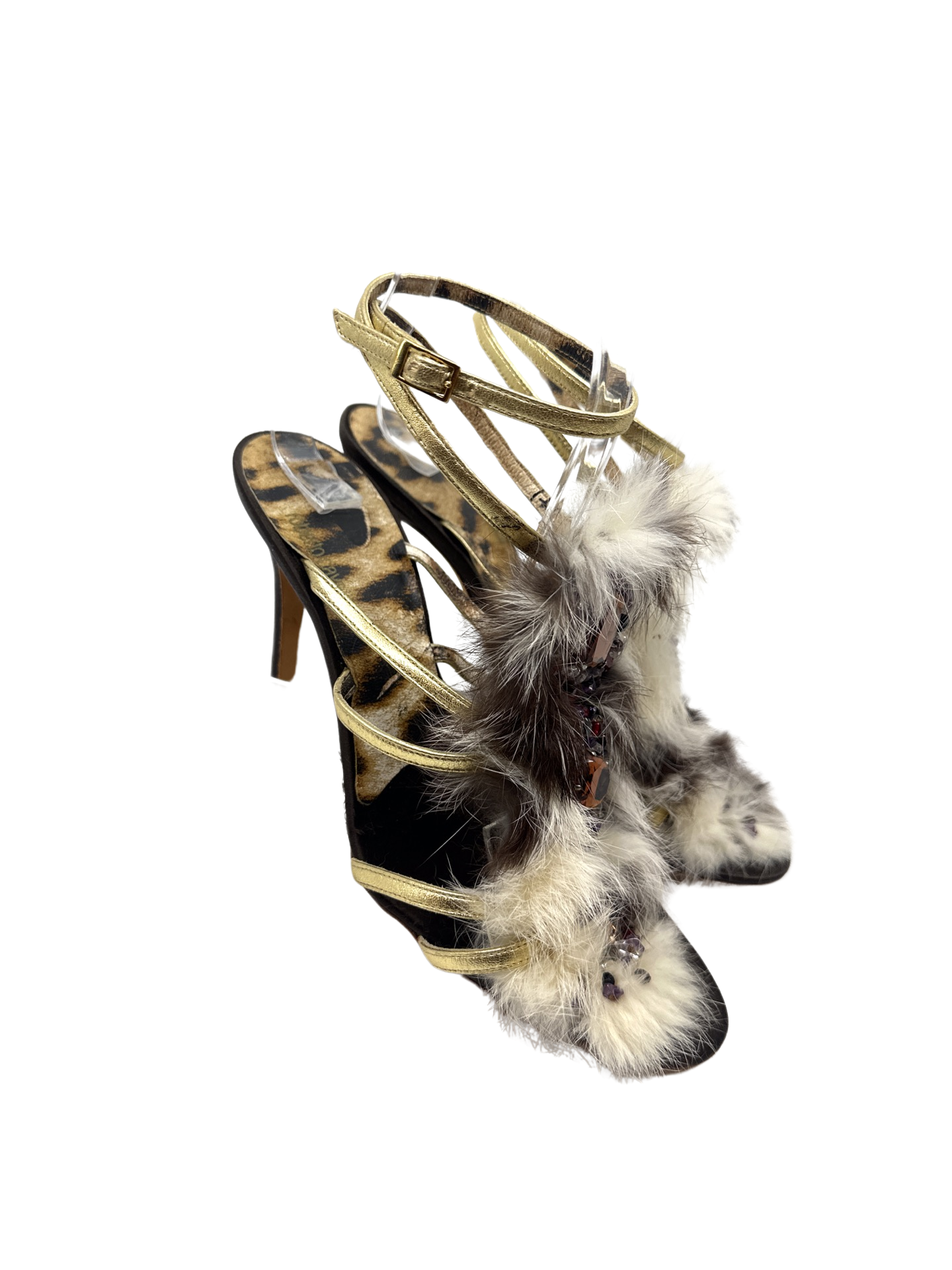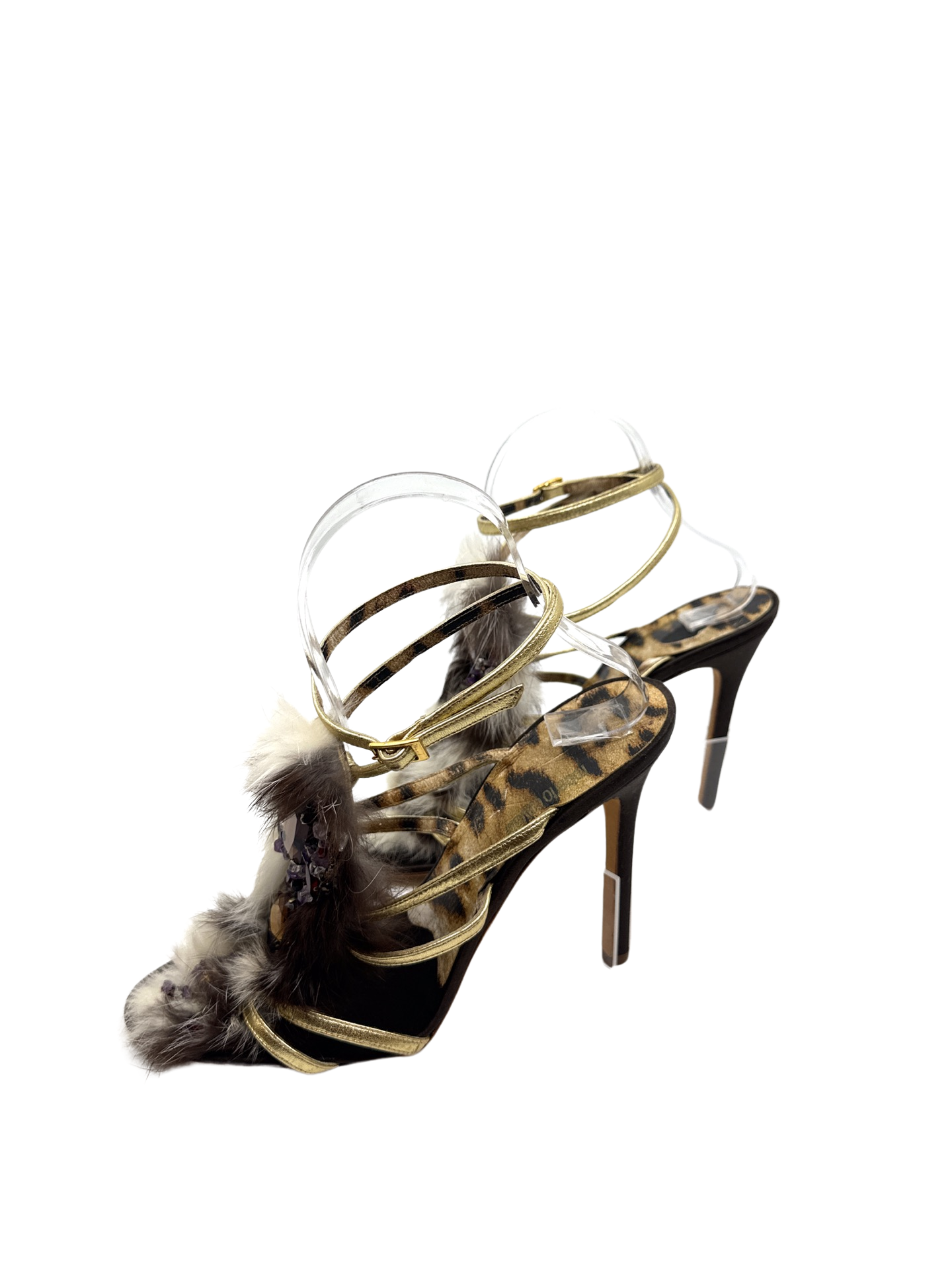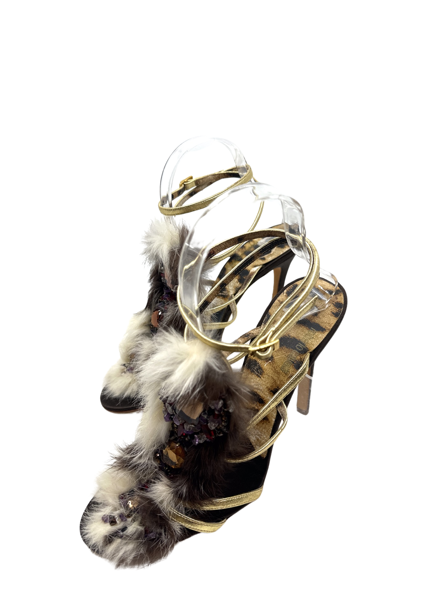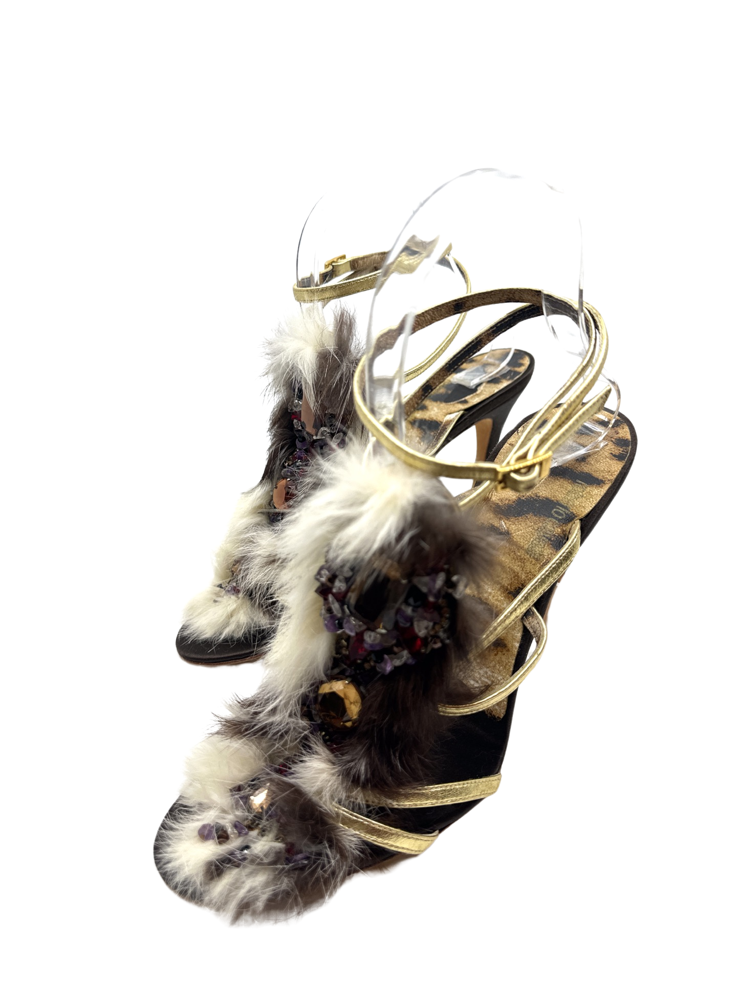 Stunning Roberto Cavalli jeweled fur sandals in excellent condition 4.5 inch heel height.