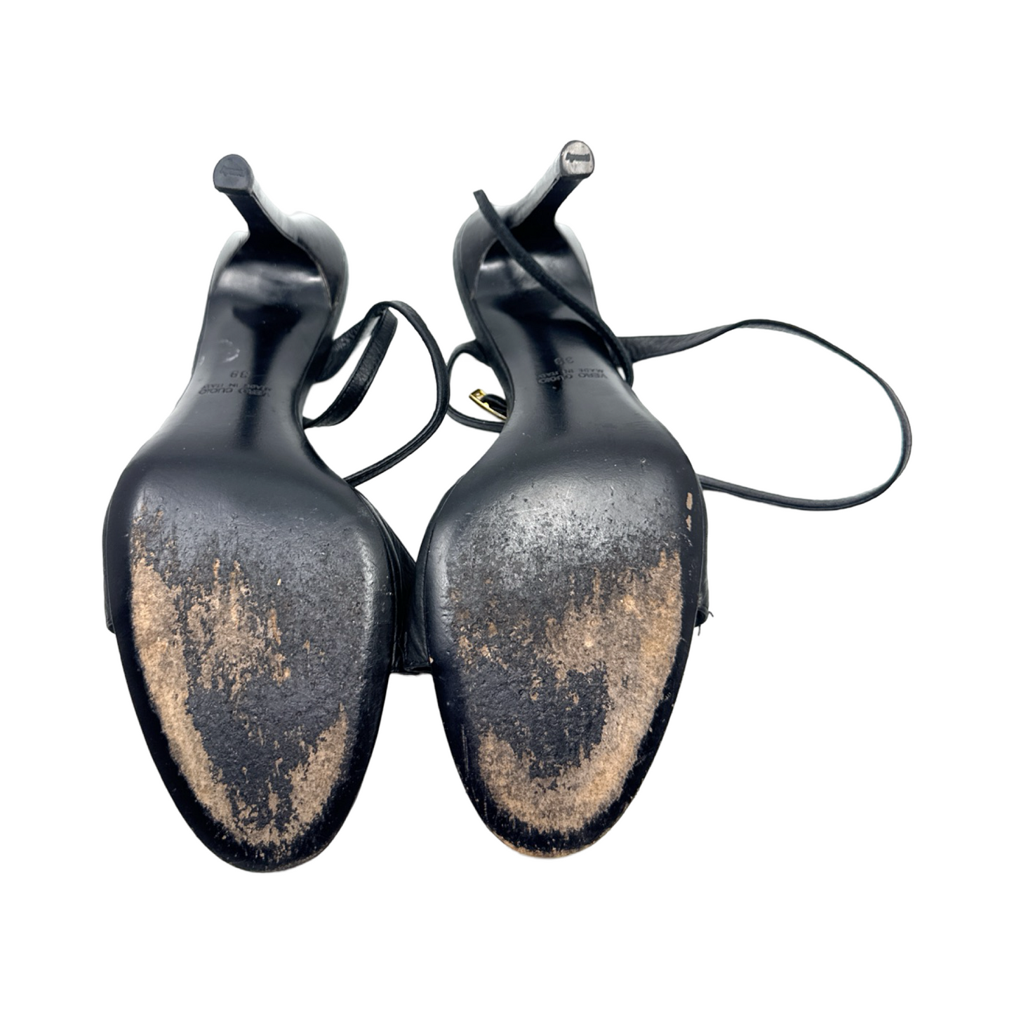 Roberto Cavalli black leather sandals with gold logo plate. Small diamond missing from right shoe as pictured. Minor and not obvious when on. Good used condition 4 inch heel. Runs generous in size perfect for us 9 -9.5