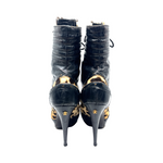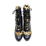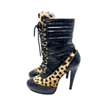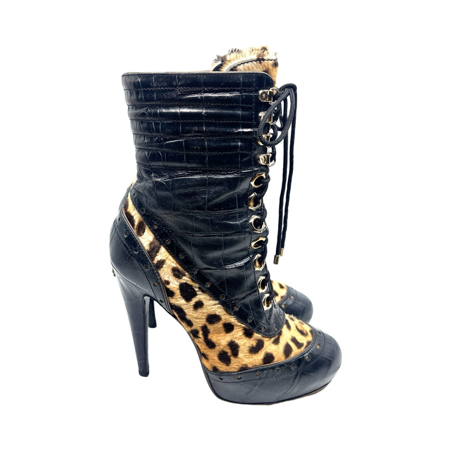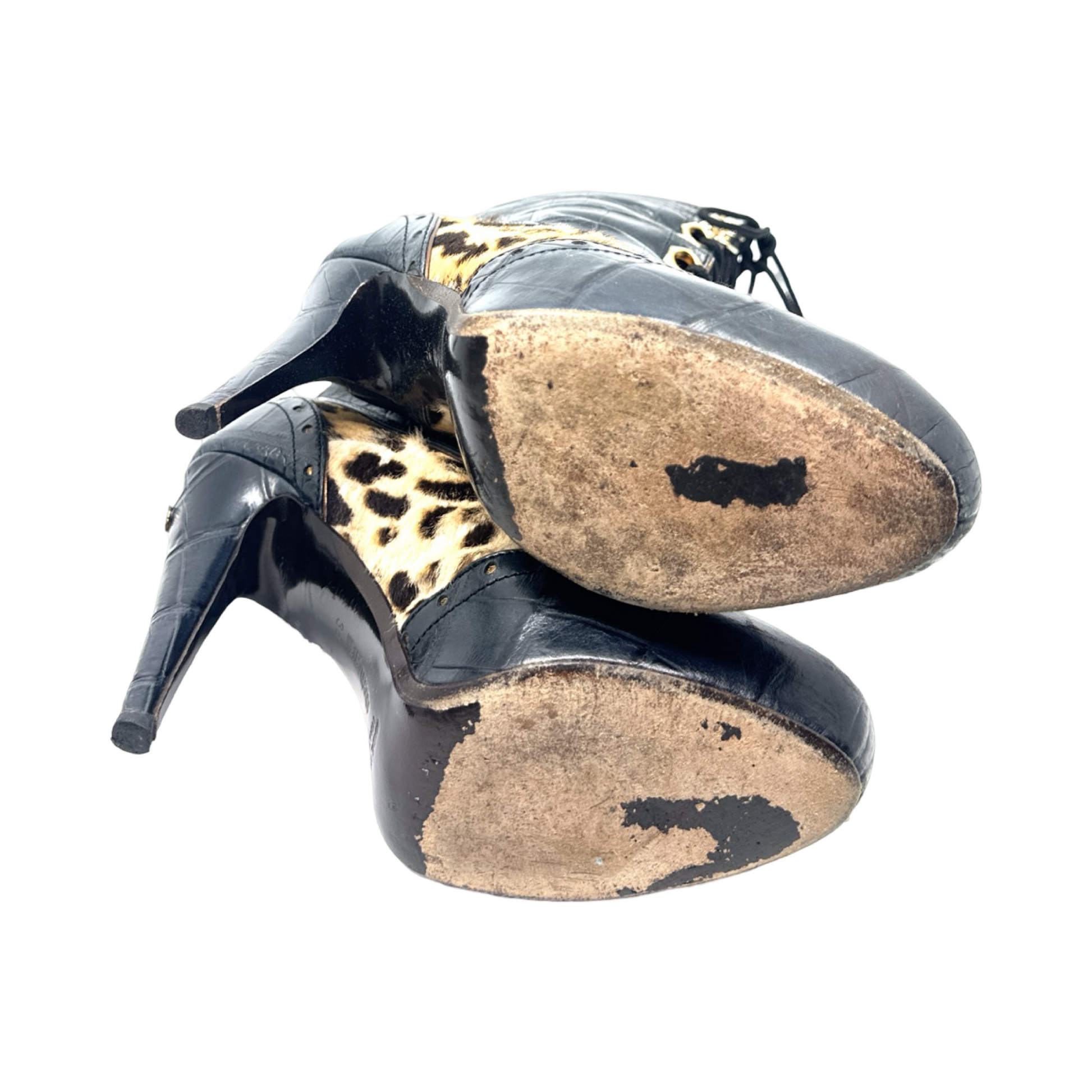 Roberto Cavalli Leopard pony hair and croc embossed leather round toe booties. In good used condition, 5 inch heel.