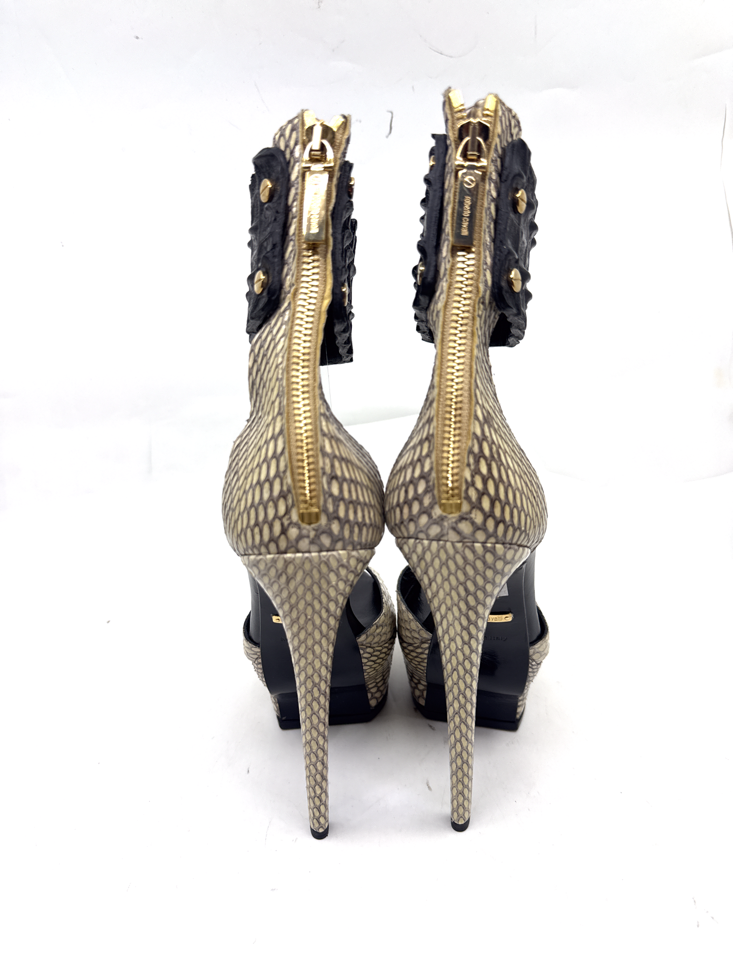Roberto Cavalli snakeskin sandal with croc ankle strap. In excellent brand new condition, 6.5 inch heel.
