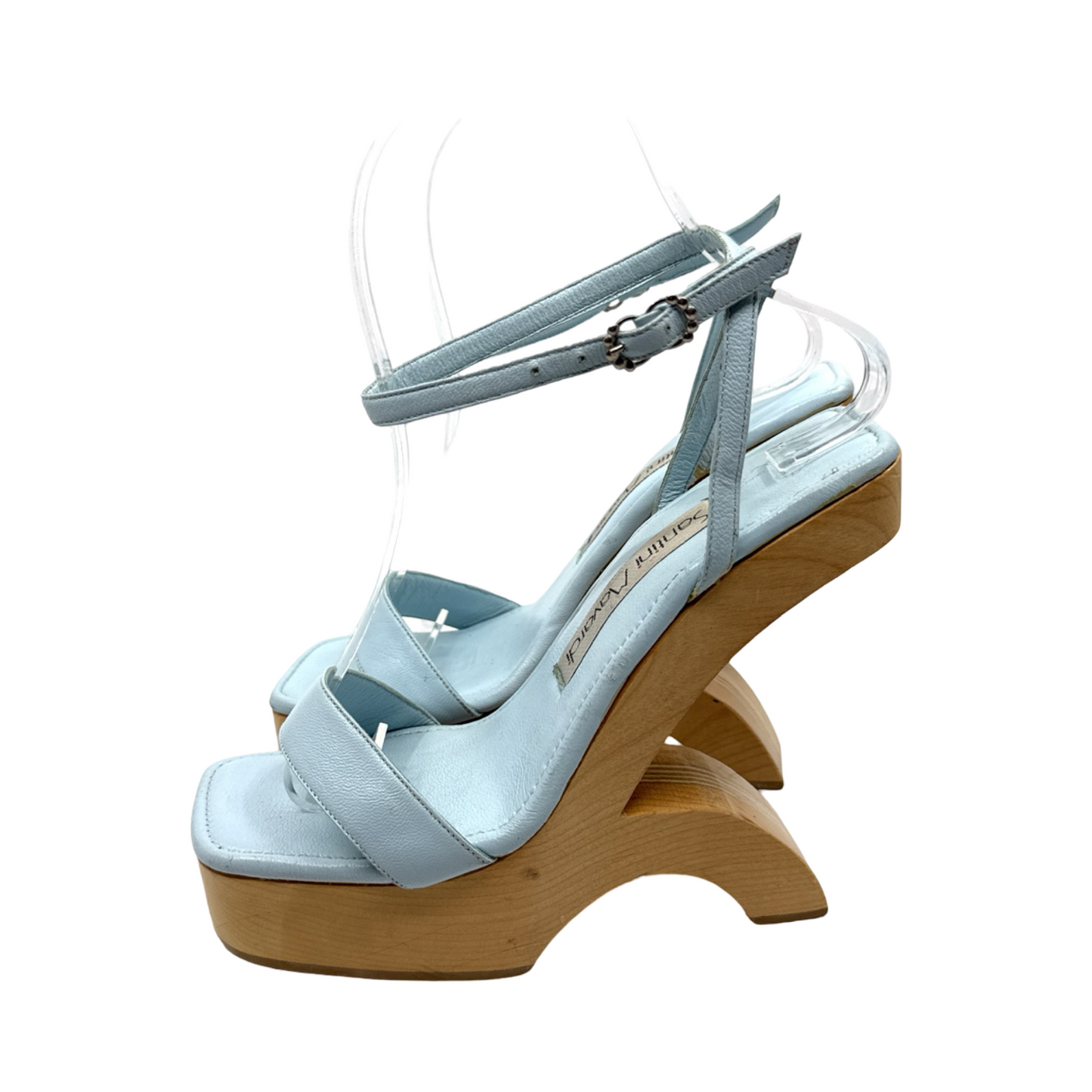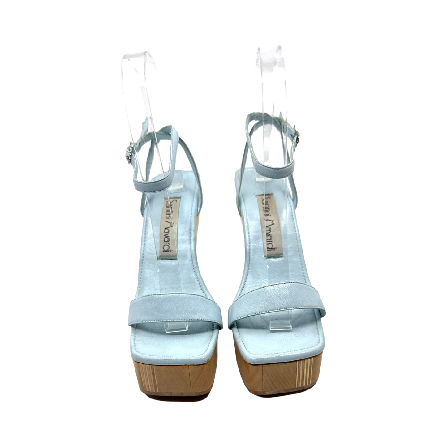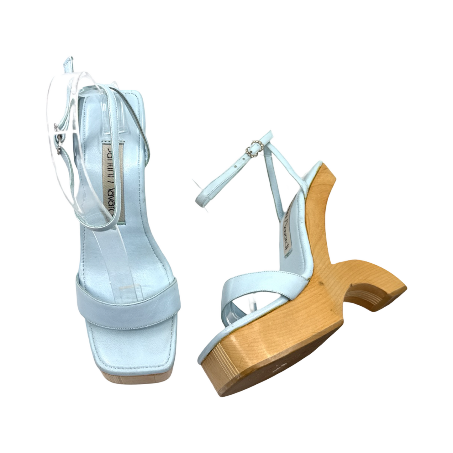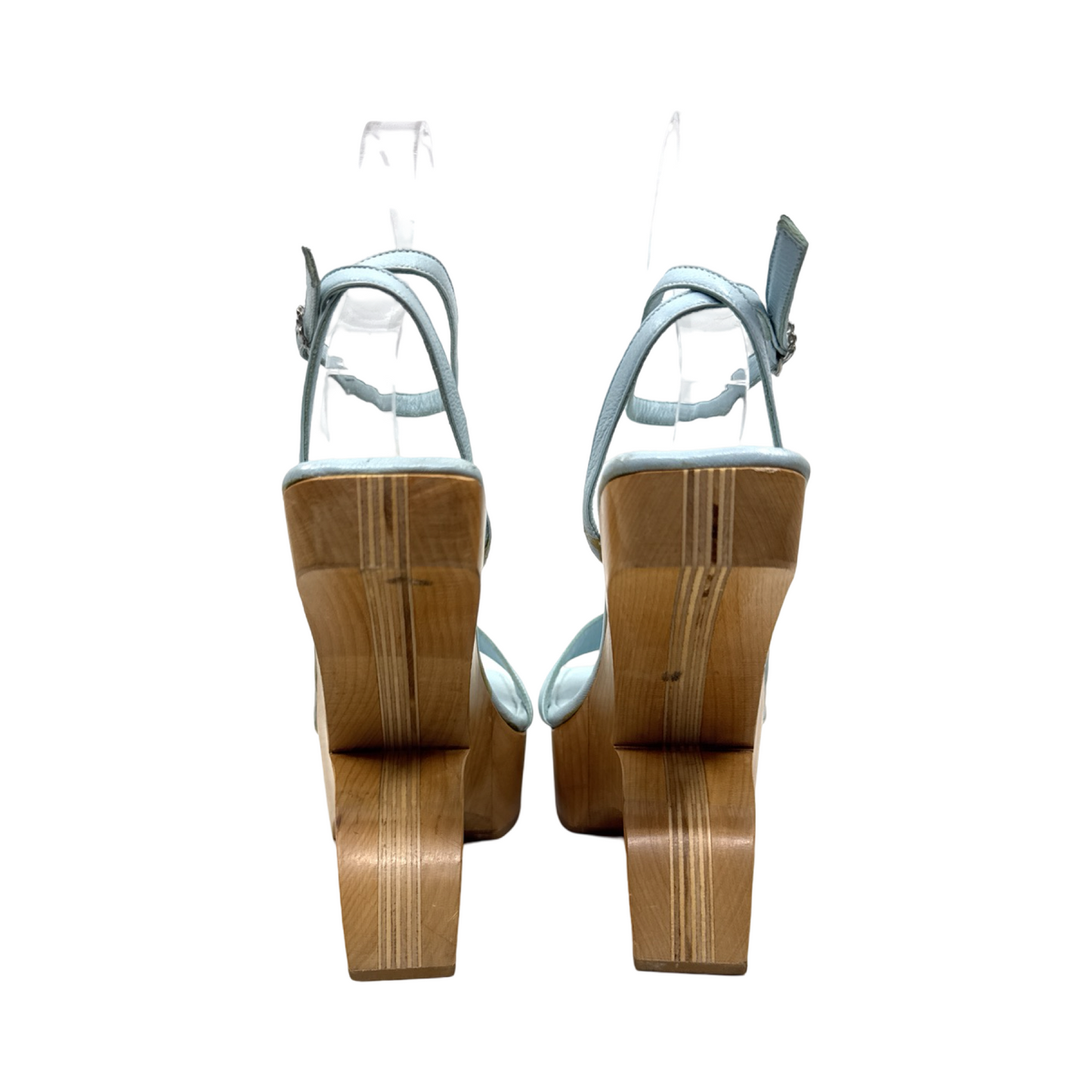 Light blue leather wedge sandal. In excellent gently used condition.