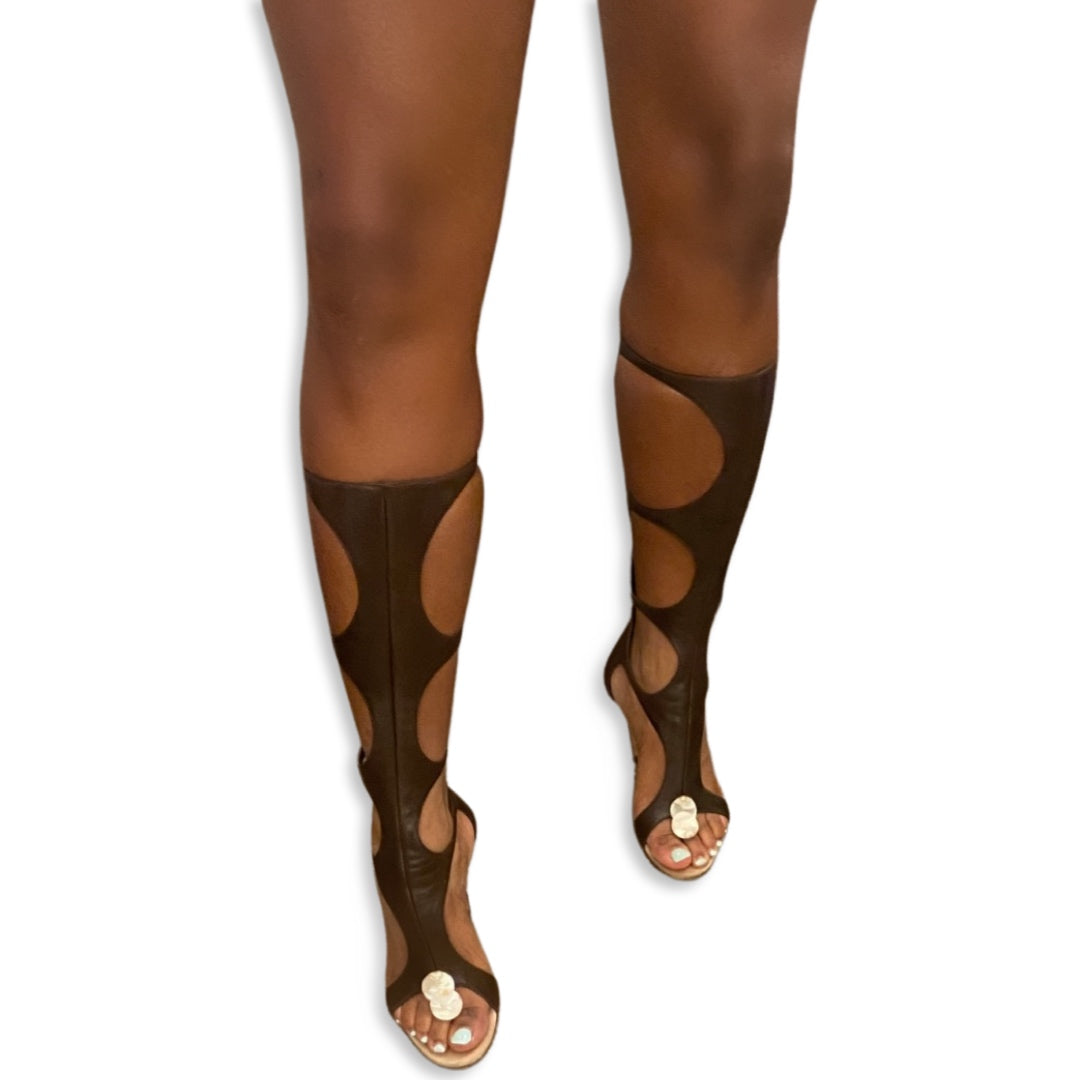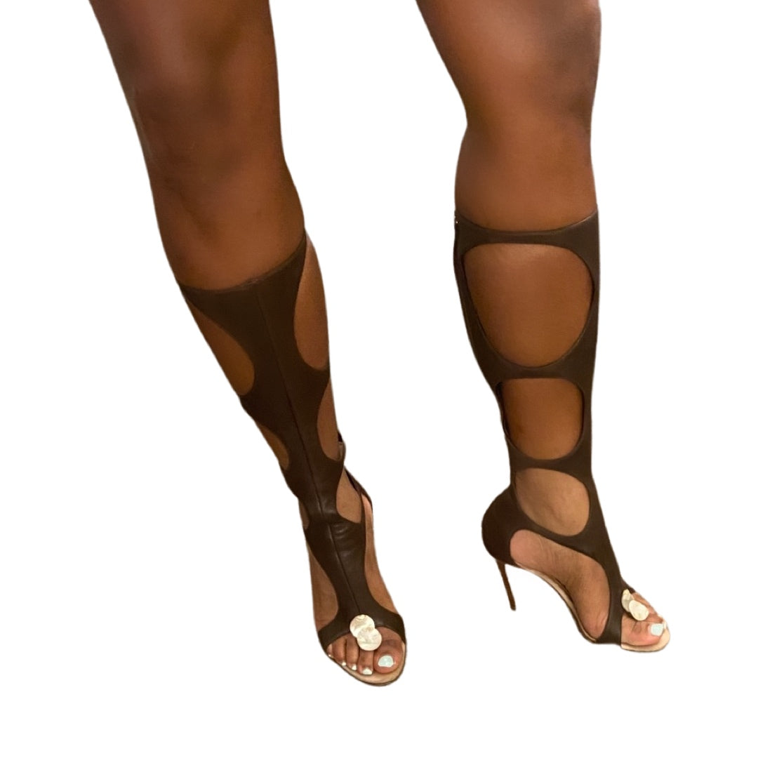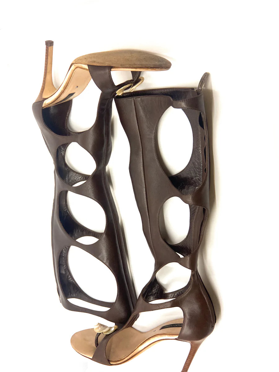 Sergio Rossi brown gladiator sandals with shell embellishments * minor signs of wear at toe box covered when on.